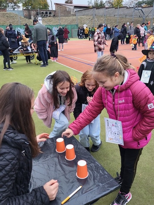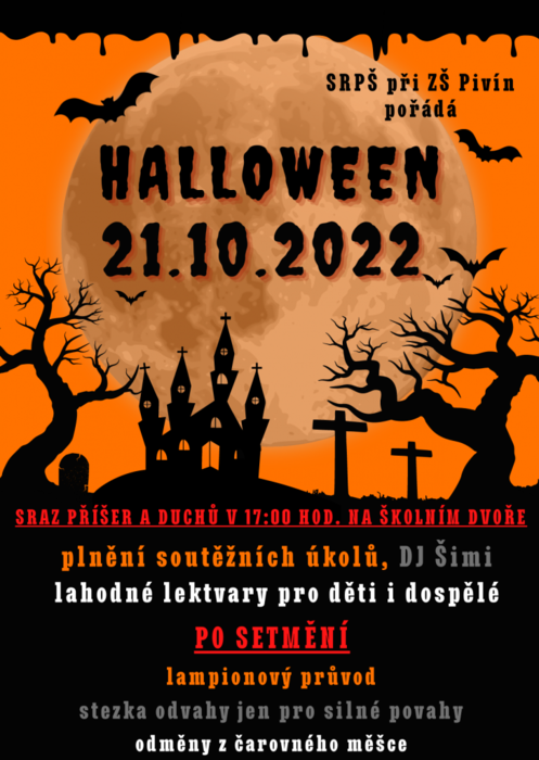 V pátek 21. října 2022 se v 17 hodin začaly scházet na školním dvoře všelijaké příšery a duchové. Na vyzdobeném školním hřišti paní učitelky připravily 15 stanovišť s úkoly pro malé i velké účastníky. Za splněné úkoly získali malí duchové na posilnění párek v rohlíku a horký čaj. Lahodný lektvar byl připravený i pro dospělé duchy. Pro odvážné byla ve školním sklepě připravena strašidelná laboratoř a pro ještě odvážnější účastníky po setmění stezka odvahy jen pro silné povahy, která tentokrát vedla kolem hřbitova. Na konci stezky se účastníci zapsali do Halloweenské pamětní knihy a dostali odměnu. Letošní ročník se náramně povedl, i počasí se nakonec umoudřilo a vydrželo. Členové SRPŠ a jejich přátelé si dali na přípravě akce velmi záležet, vše bylo perfektně naplánováno a připraveno. Stezka odvahy byla úžasná, i dospělí účastníci měli místy docela nahnáno. Příprava akce byla určitě náročná, ale výsledek stál za to a my všem, kteří se zapojili do přípravy a realizace této akce velmi děkujeme.