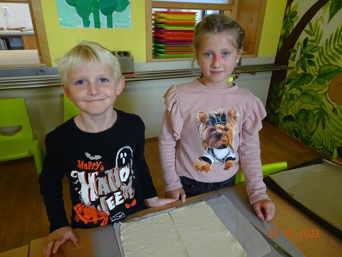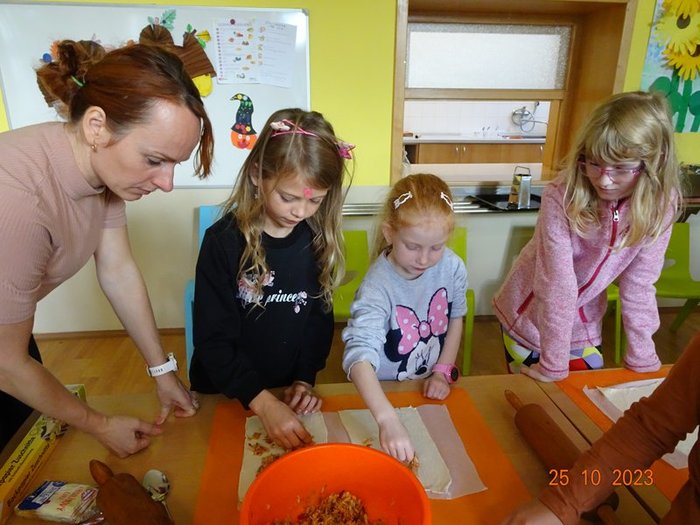 Na 1. stanovišti jsme měřili a vážili největší a nejmenší jablko, seznámili jsme se s různými odrůdami jabloní, s jejich pěstováním a využitím. Skládali jsme puzzle, vyhledávali informace a hádali hádanky. Na 2. stanovišti jsme výtvarně zpracovávali téma jablíček – malovali a lepili jsme jablíčka a na 3. stanovišti jsme pekli z jablíček různé dobroty – štrúdl, jablka v župánku a další dobroty.