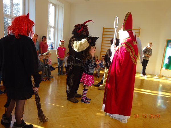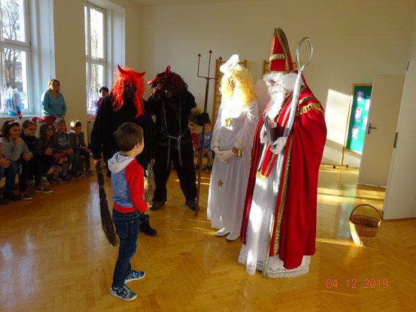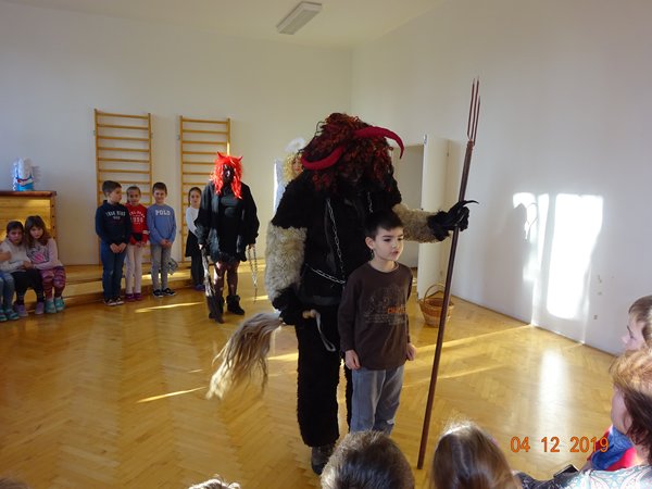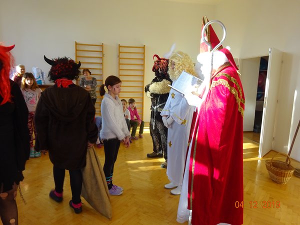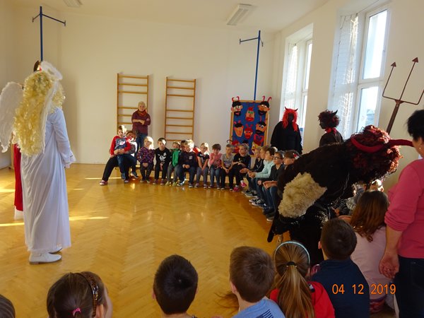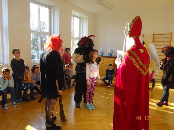 Ve středu 4. prosince 2019 opět zavítal do naší školy svatý Mikuláš se svojí družinou. Dobře ví, že v naší škole je mnoho hodných žáků, ale každý rok tu najde i několik zlobivých, kteří vyrušují, neplní si školní povinnosti a neumí se slušně chovat. Anděl odměňoval hodné žáky sladkostmi, Lucifer a jeho čerti trestali zlobivé žáky čertovským znamením na tvář. Někteří dostali metlou na zadek a jeden žák skončil dokonce v čertovském pytli. Všichni slibovali, že se polepší…..tak se necháme do příštího roku překvapit.