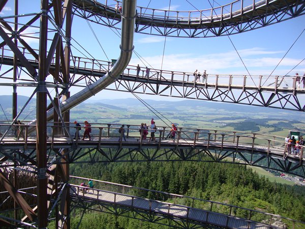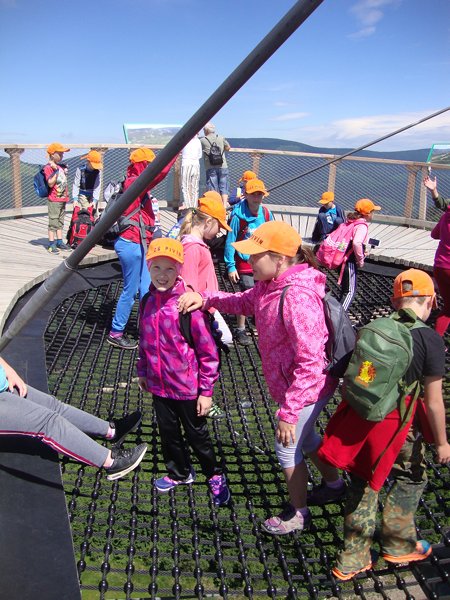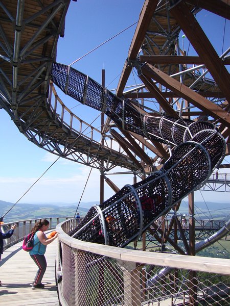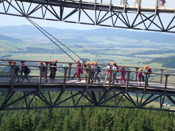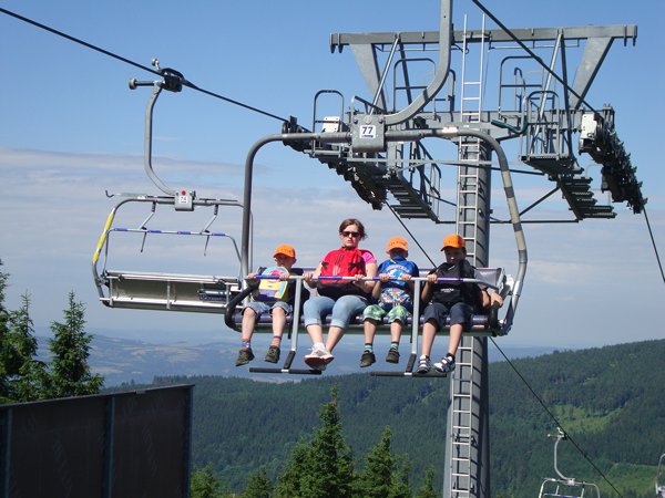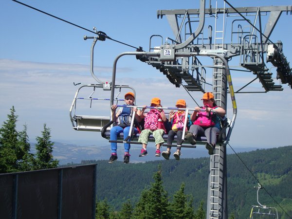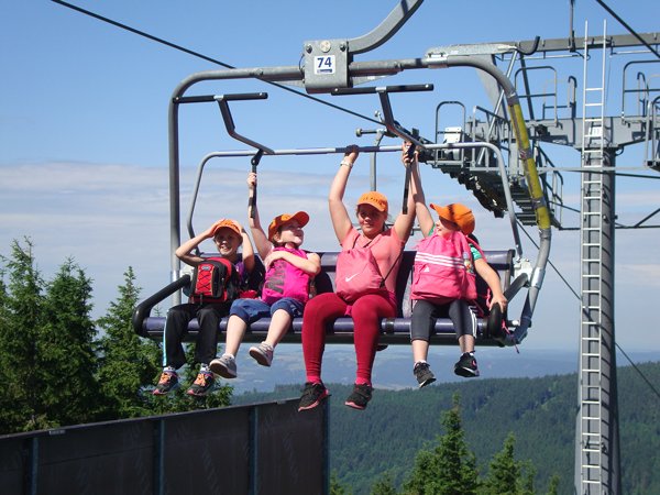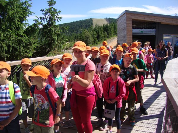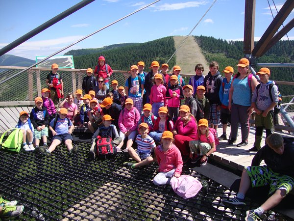 Ve středu 29. června 2016 jsme se vydali na cestu do oblak. Naším cílem byla Stezka v oblacích na Dolní Moravě v oblasti Králického Sněžníku. Její návštěvu jsme plánovali už na naší škole v přírodě, ale pro nepřízeň počasí jsme ji museli odložit. Čekání se nám vyplatilo. Den byl nádherný a výlet jsme si hezky užili. Děti byly odvážné, zvládly cestu lanovkou na Sněžník do výšky 1116 m i vyjít na vrchol samotné stezky, která je vysoká 55 m. K přesunutí mezi patry využili někteří odvážlivci tzv. rukáv, což je tunel z husté sítě a velkou odvahu vyžadoval i vstup na tzv. kapku, síť, která byla na samotném vrcholu. Potom už následoval méně náročný, ale o to více zábavný program – návštěva Mamutíkova vodního parku. Jedná se o vodní přírodní areál, kde voda je základním prvkem k hraní, experimentování a získávání zkušeností o přírodě a jejích zákonitostech. Všechny části parku jsou interaktivní a děti si mohou vše sami regulovat, vyzkoušet, uchopit či roztočit, a protože bylo teplo, mohly se ve vodě i osvěžit. Na areál navazuje Lesní zážitkový park s domečky, houpačkami, lanovými žebříky a tobogánem, kde se děti pořádně vyřádily. Tři hodiny uplynuly jako voda v potůčcích Mamutíkova parku a my jsme se museli vydat na dalekou cestu domů. Den byl náročný, ale výlet se povedl a všem se moc líbil.