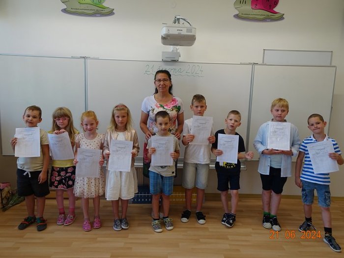 V pátek 21. června 2024 jsme se rozloučili se školním rokem 2023/2024 a rozdali jsme všem žákům vysvědčení za jejich celoroční práci. Rozloučili jsme se také s našimi páťáky - Jonášem Hornou, Alžbětou Chalus, Štěpánkou Malinkovou, Denisou Musilovou, Sofií Nakládalovou, Lucií Omachlíkovou, Tadeášem Šišmou, Jonášem Tydlačkou a Milošem Zatloukalem, kteří odchází z naší školy na druhý stupeň.