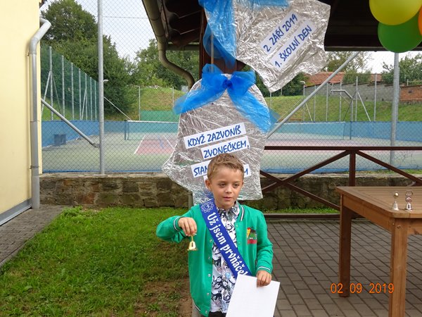 V pondělí 2. září 2019 jsme se po prázdninách opět sešli v naší škole. Přivítali jsme deset nových žáků 1. ročníku, kteří se v doprovodu své rodiny zúčastnili zahájení nového školního roku 2019/2020. Nejdříve všechny žáky přivítala paní ředitelka a poté pan starosta. Své mladší kamarády přivítali i žáci a žákyně starších ročníků. Patroni ze starších ročníků přivítali své prvňáčky. Po slavnostním šerpováním jsme všichni objali naši školu a potom si Jonáš H., Alžbětka, Štěpánka, Deniska, Sofinka, Lucinka, Lukáš, Tadeáš, Jonáš T. a Miloš odemkli perníkovým klíčem svoji školu. Prváčci, přejeme vám, ať se vám v naší škole líbí a zažijete v ní mnoho úspěchů. Úspěšný školní rok 2019/2020 přejeme také všem žákům, jejich rodičům i paní učitelkám.