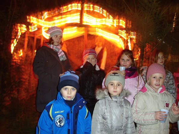 Po skončení besídky jsme se sešli u nazdobeného a rozsvíceného vánočního stromu u obecního úřadu, abychom si zazpívali nejznámější koledy. I když počasí nevypadalo vůbec vánočně, nemohlo nám to pokazit dobrou sváteční náladu. Děti si zapálily svíčky, vypily teplý čaj a dospělí svařáček. Rozloučili jsme se závěrečnou koledou „Narodil se Kristus Pán“ a s přáním pohodových vánoc jsme se rozcházeli domů.