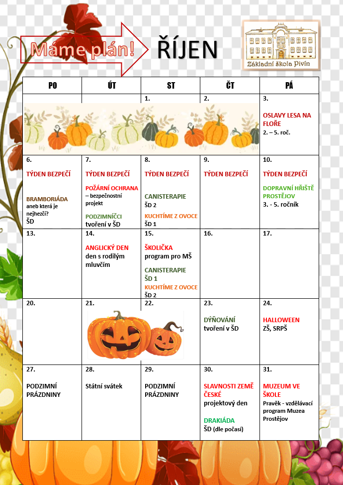 Zveřejňujeme plán akcí a událostí na měsíc říjen 2025. Čekají nás mimo jiné oslavy lesa na Flóře, bramboriáda, canisterapie, návštěva dopravního hřiště a samozřejmě i akce spojená s Halloweenem.