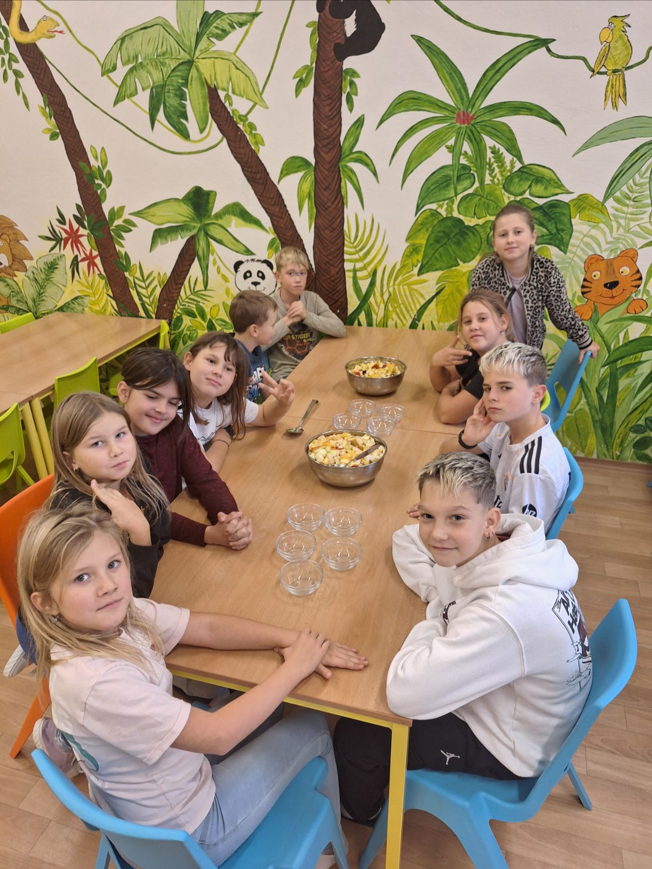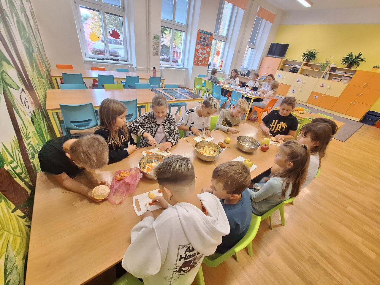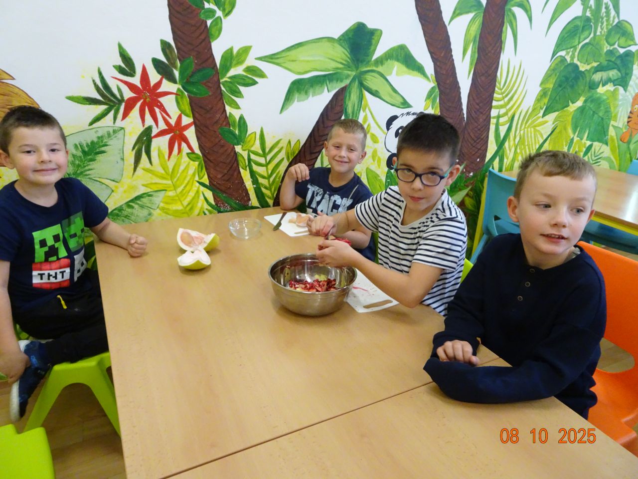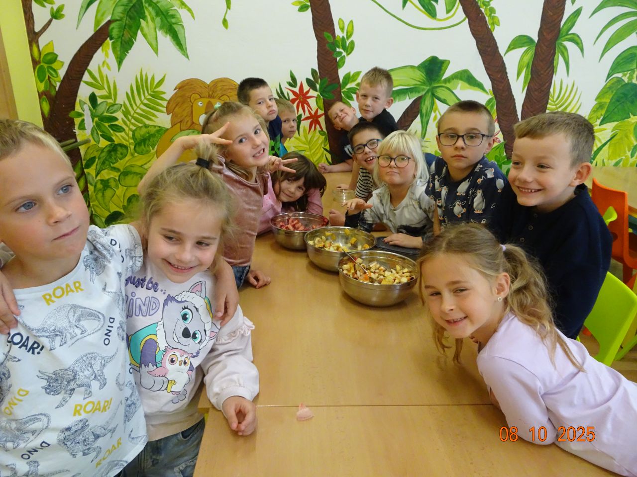 Děti byly velmi ochotné a z domova si přinesly různé druhy ovoce, za což patří velké poděkování rodičům. Společně se pustily do mytí, loupání a krájení ovoce, které následně míchaly do pestrých salátů. Aktivita děti bavila a zároveň si procvičily jemnou motoriku i spolupráci. Na závěr si všichni pochutnali na známých i méně známých druzích ovoce.