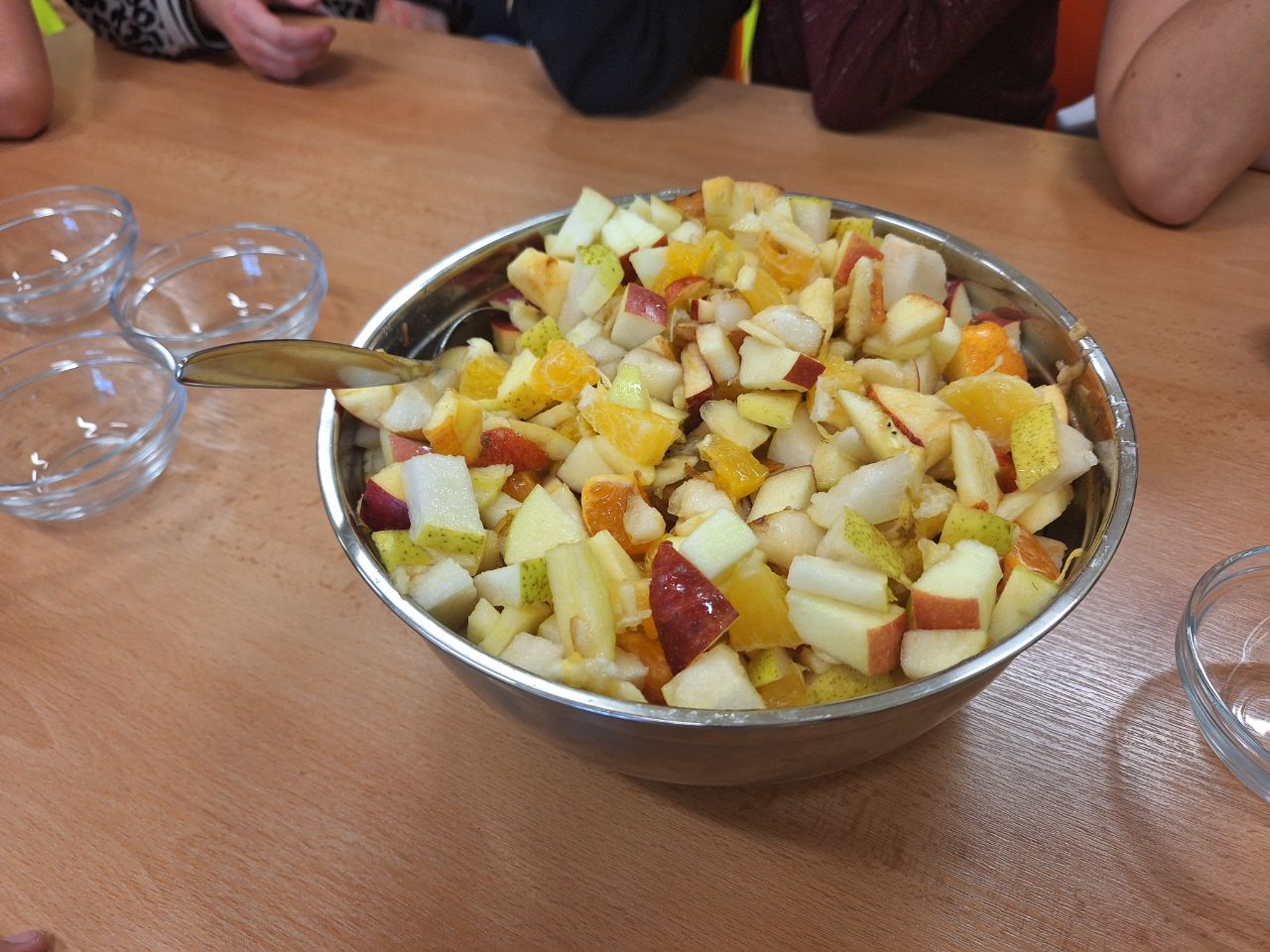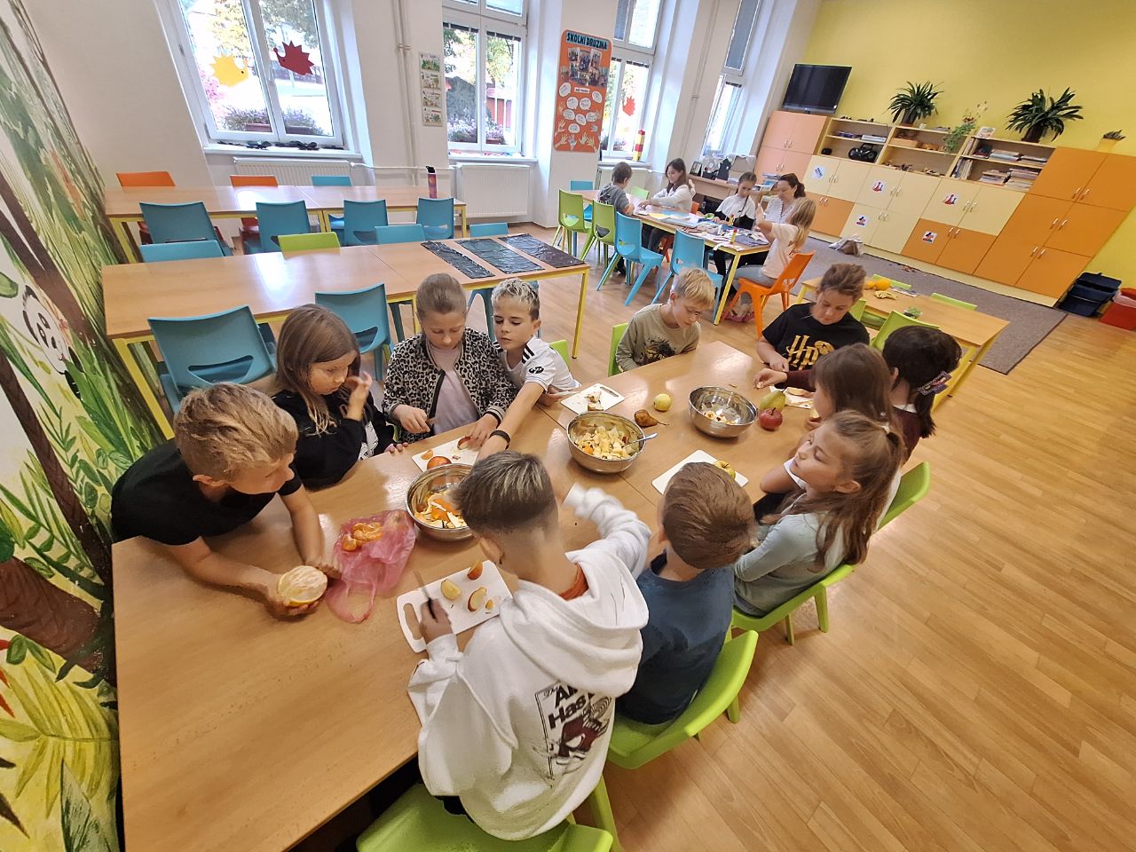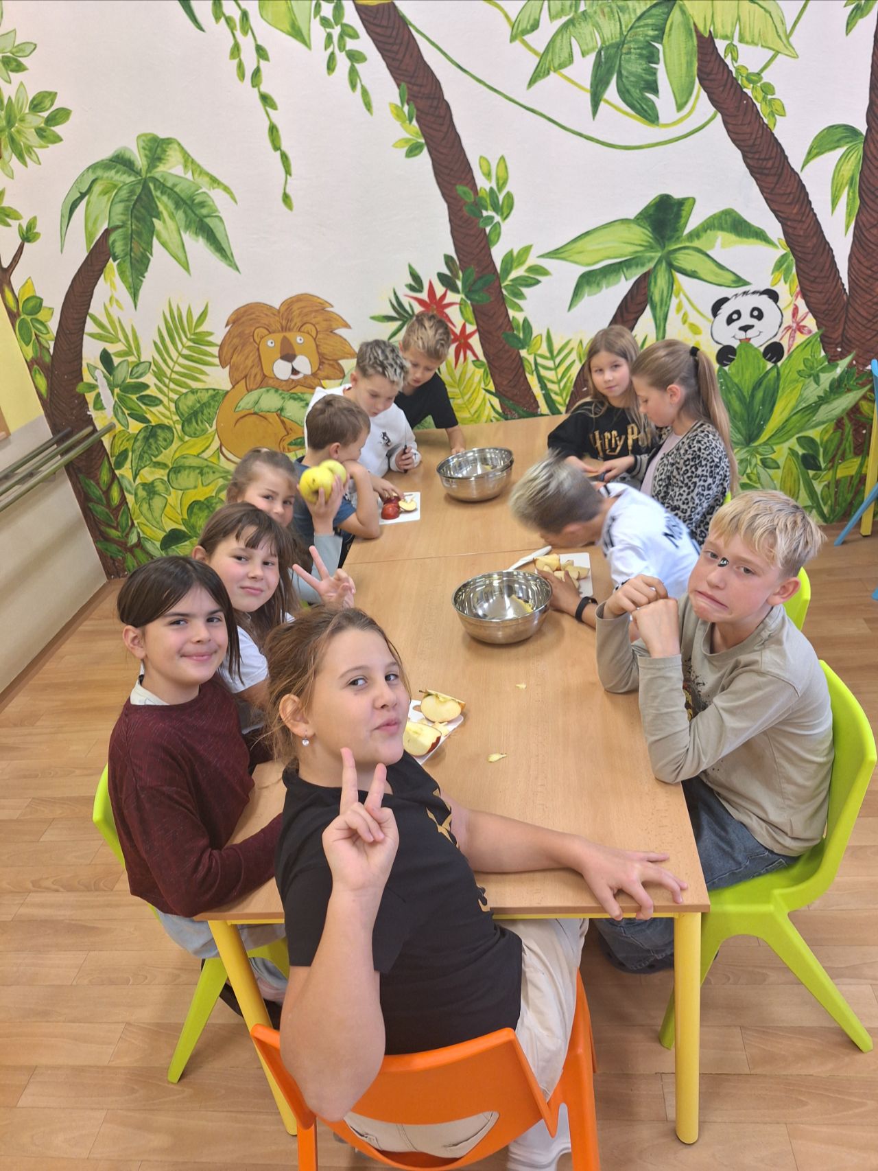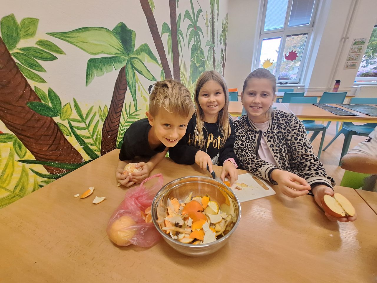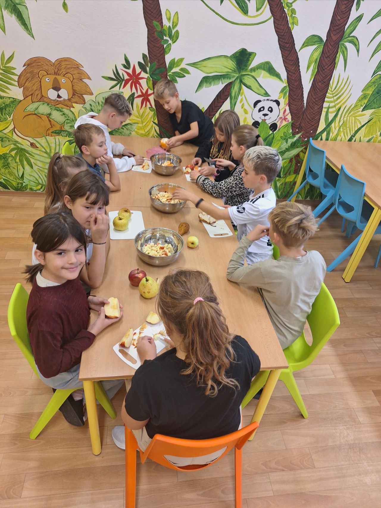 Děti byly velmi ochotné a z domova si přinesly různé druhy ovoce, za což patří velké poděkování rodičům. Společně se pustily do mytí, loupání a krájení ovoce, které následně míchaly do pestrých salátů. Aktivita děti bavila a zároveň si procvičily jemnou motoriku i spolupráci. Na závěr si všichni pochutnali na známých i méně známých druzích ovoce.