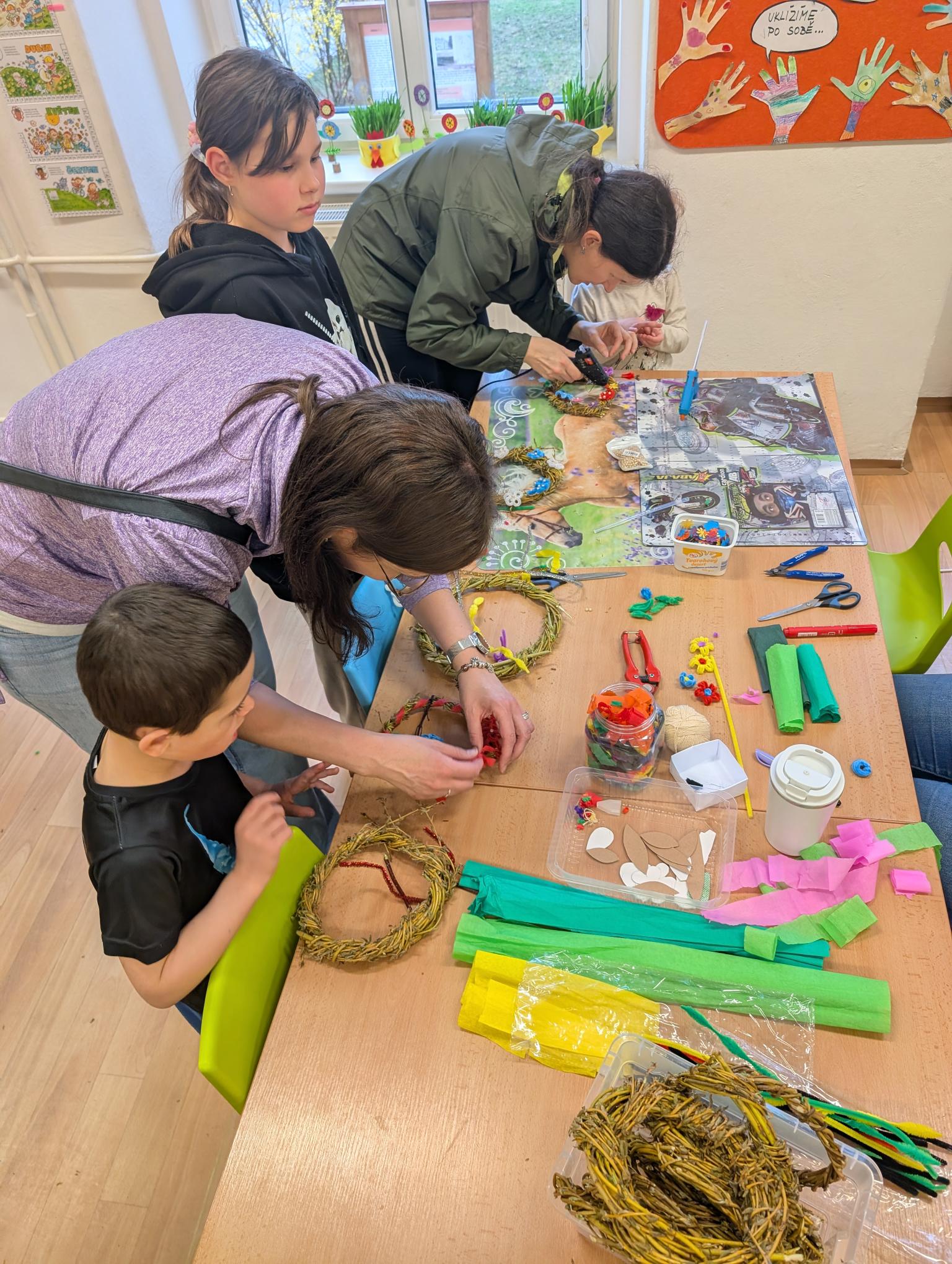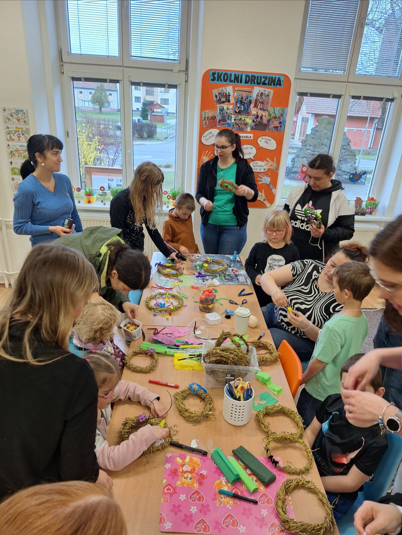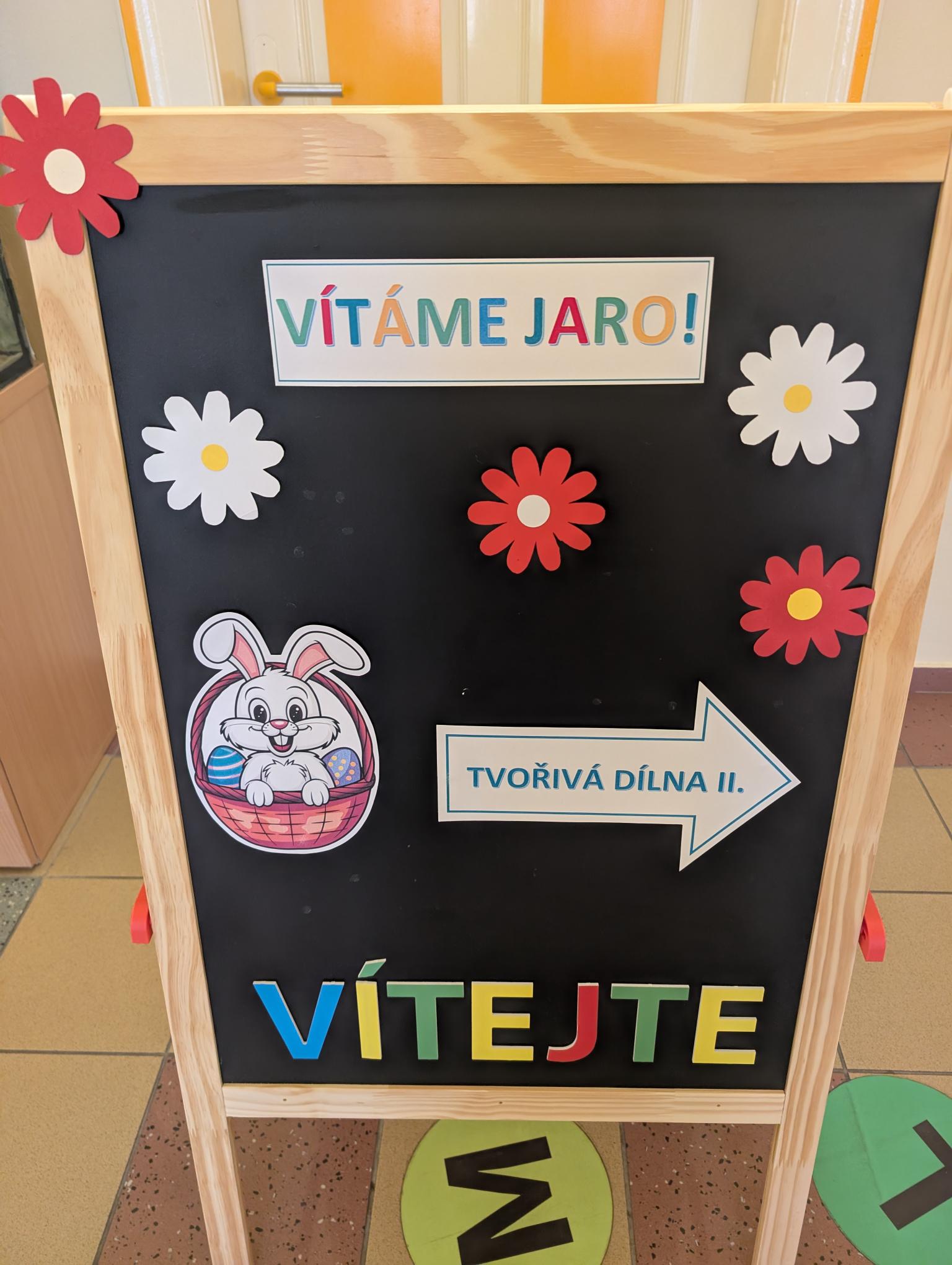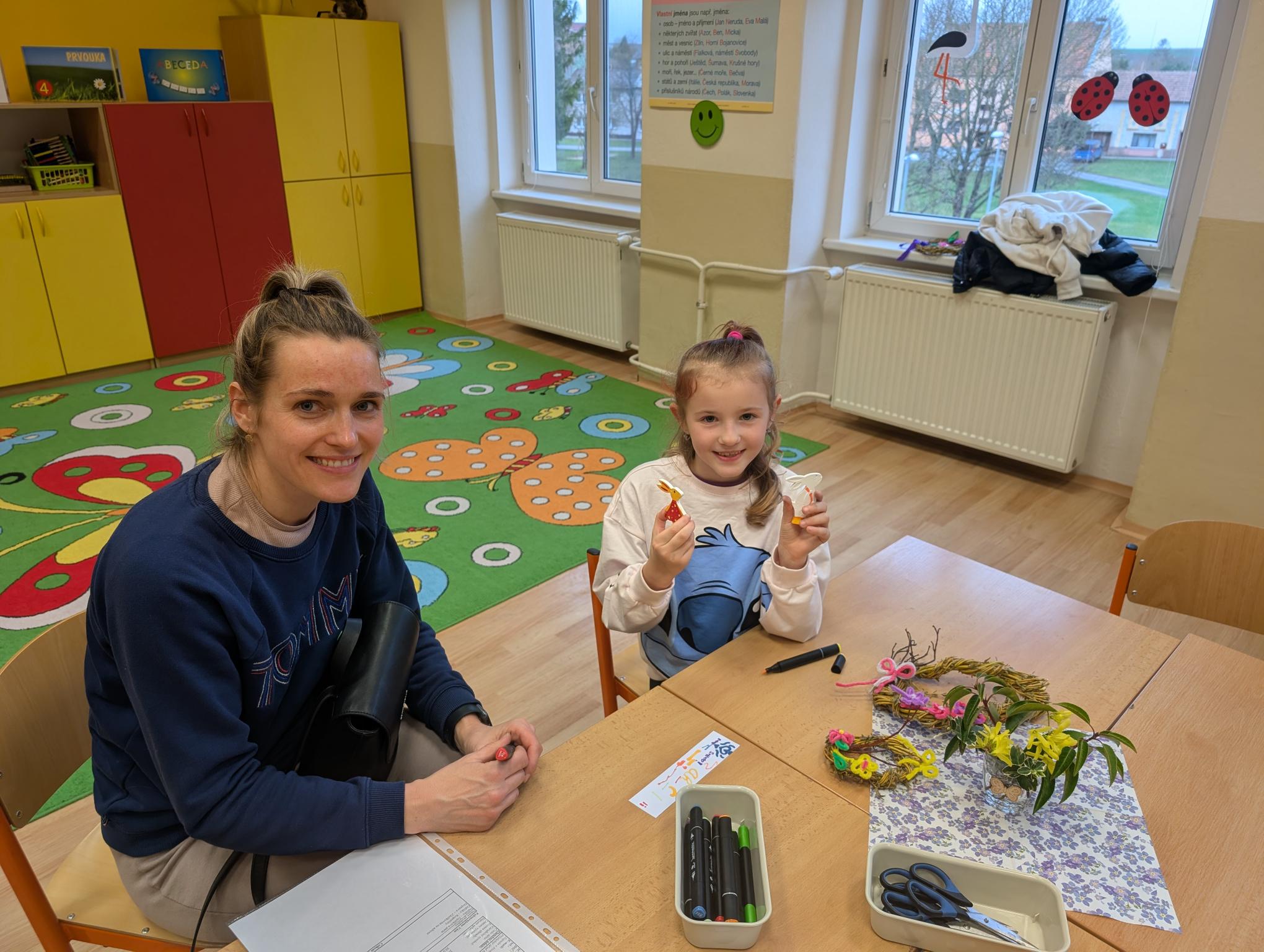 Pozvání přijali rodiče i sourozenci. Na stanovištích si účastníci vyrobili jarní věneček a velikonočního zajíčka. Zajíčka si děti samy vybarvily a věnec ozdobily podle své fantazie. Všichni měli radost ze svých výrobků.
