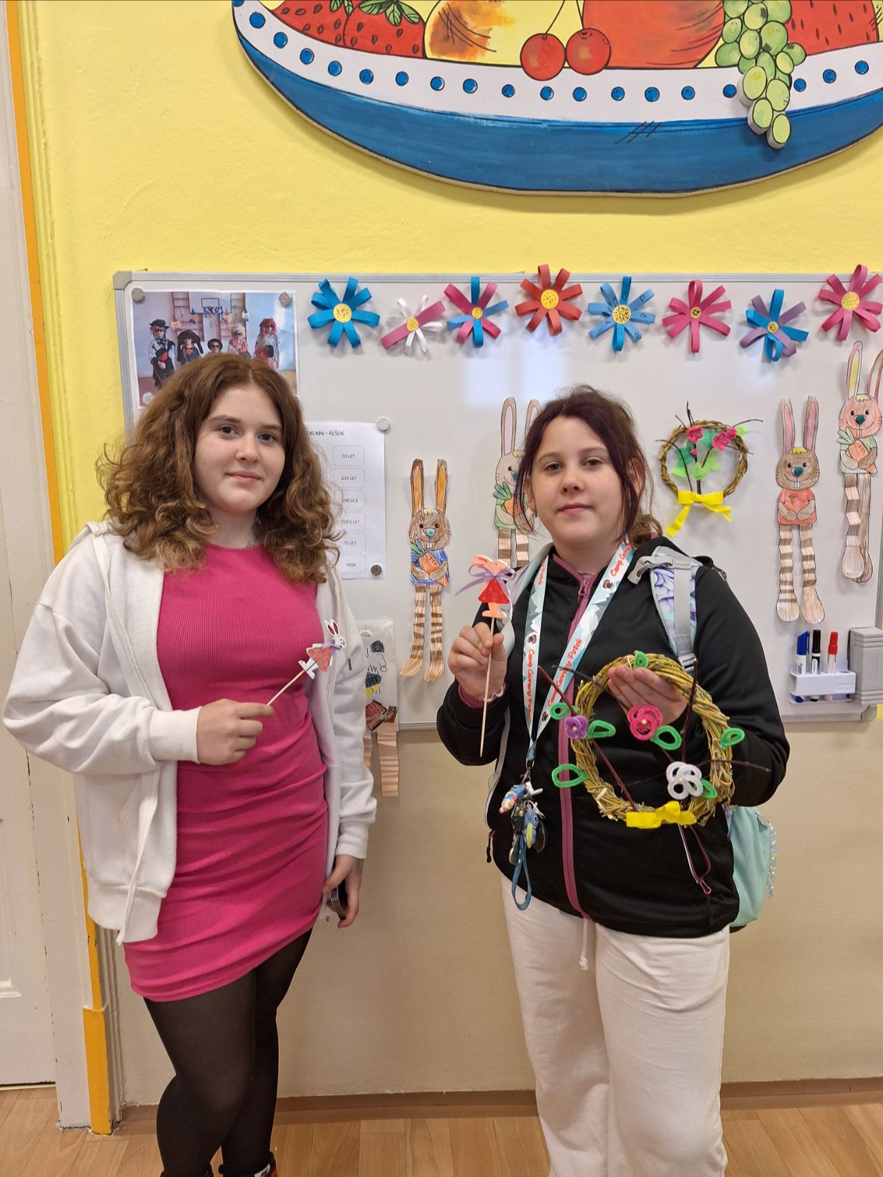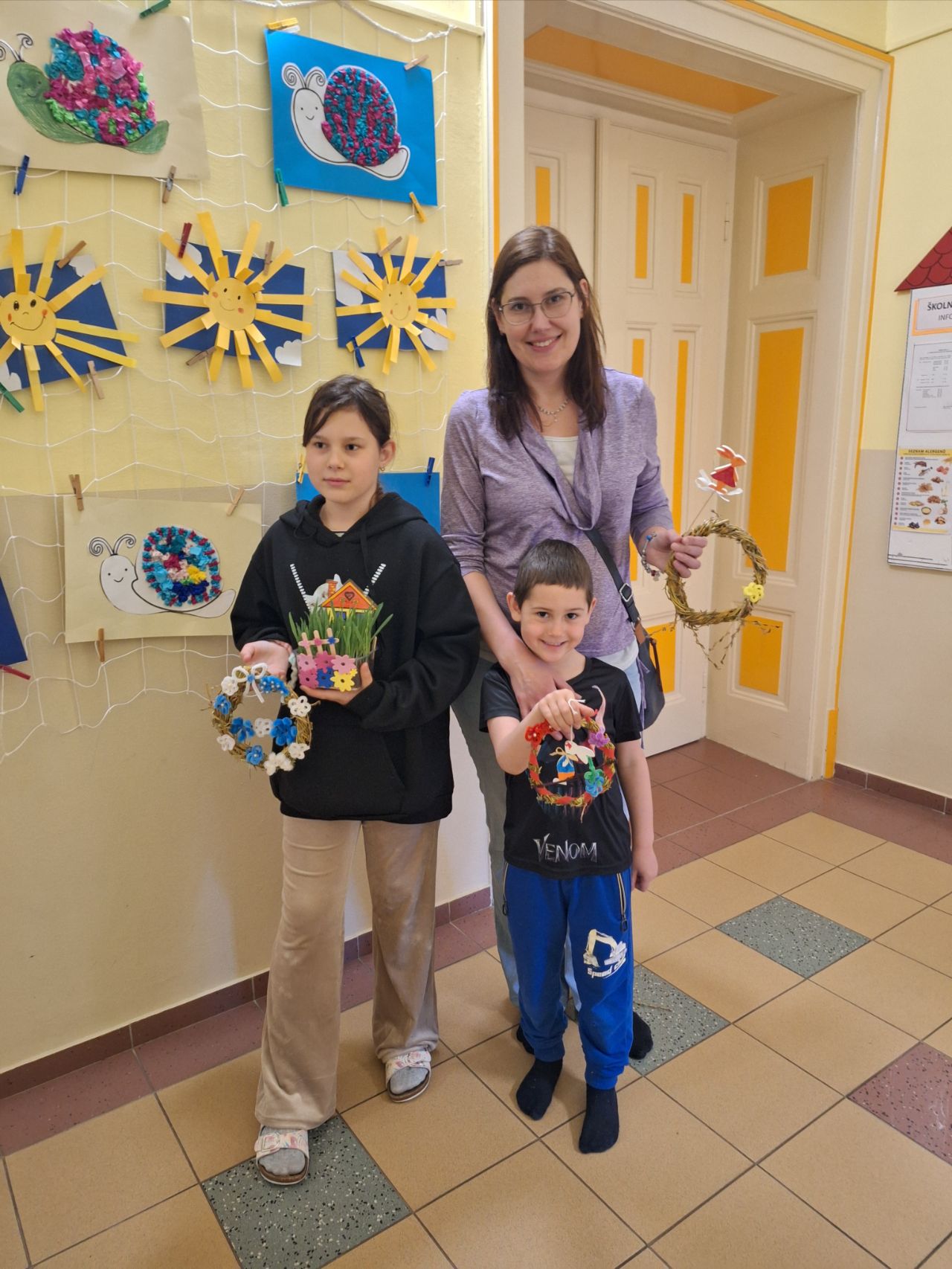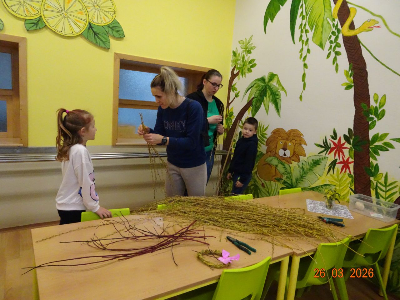 Pozvání přijali rodiče i sourozenci. Na stanovištích si účastníci vyrobili jarní věneček a velikonočního zajíčka. Zajíčka si děti samy vybarvily a věnec ozdobily podle své fantazie. Všichni měli radost ze svých výrobků.