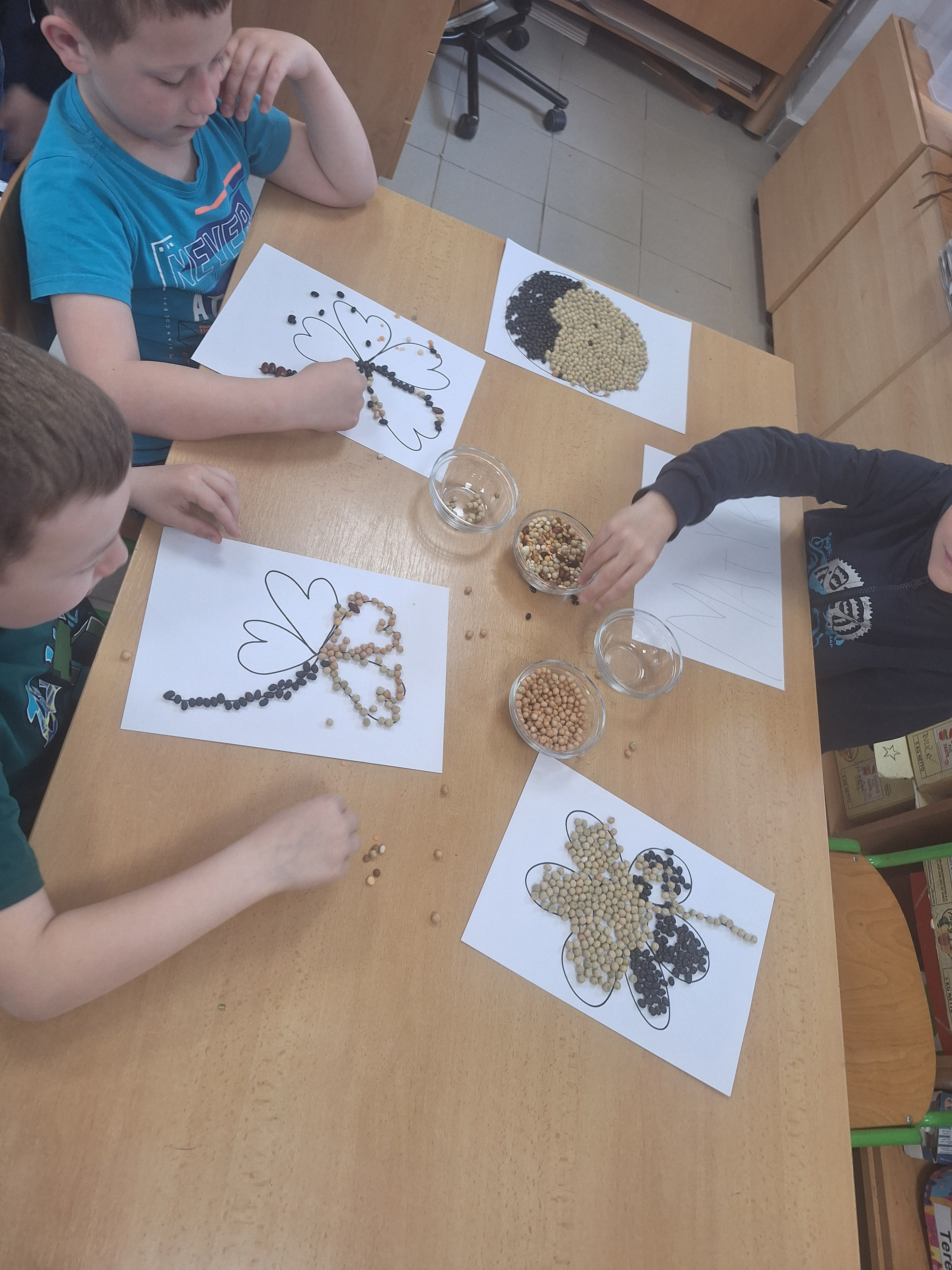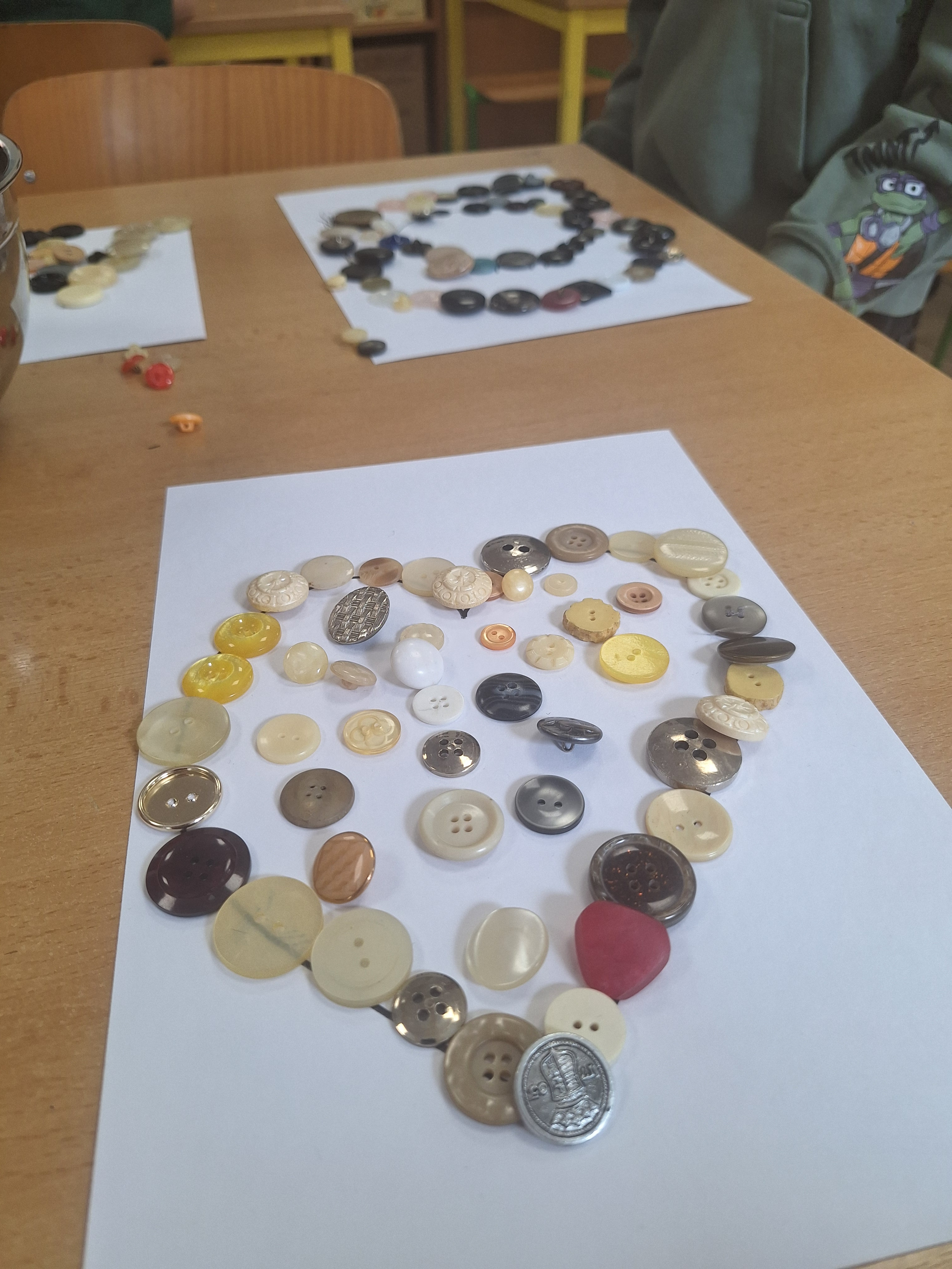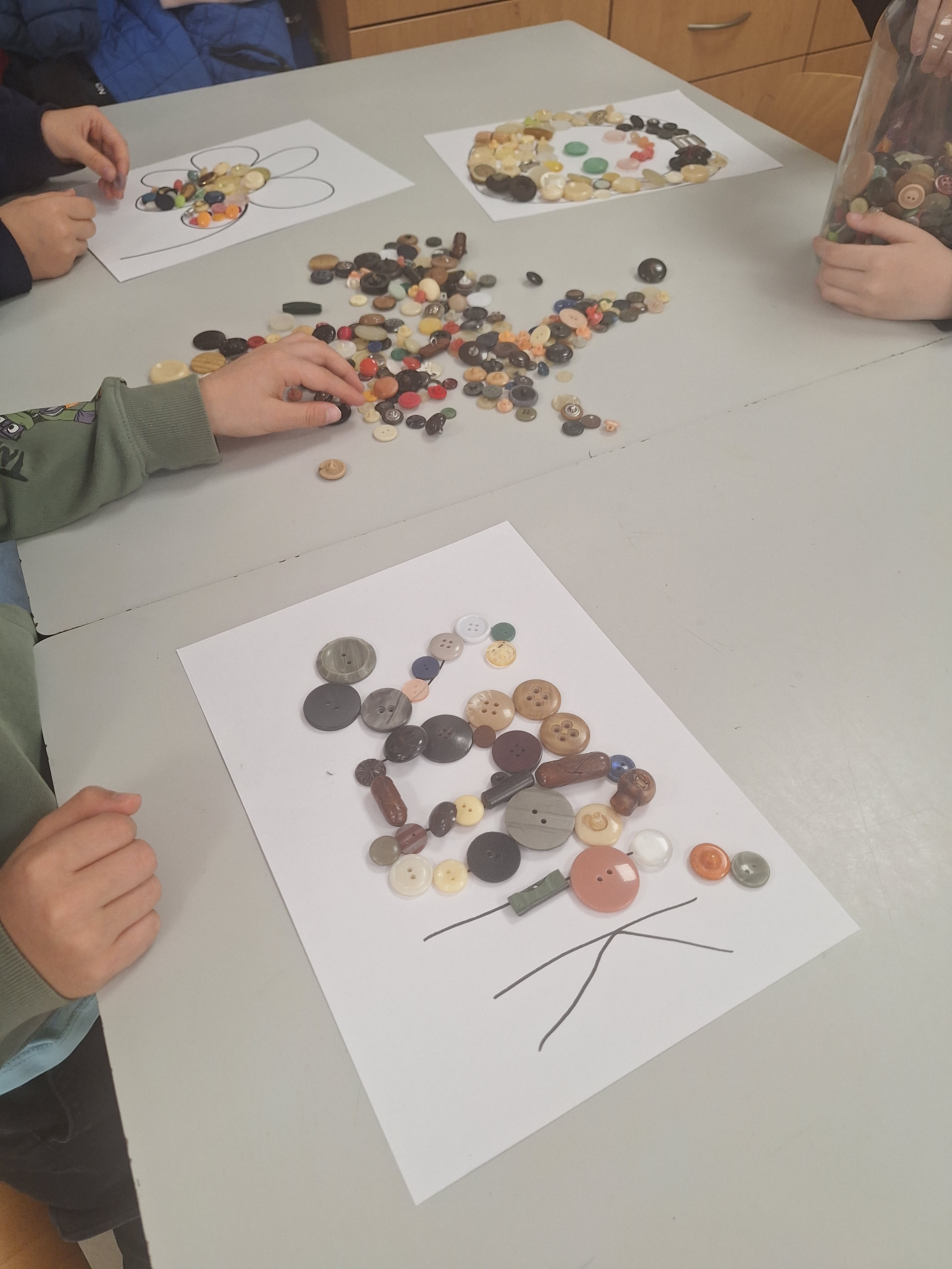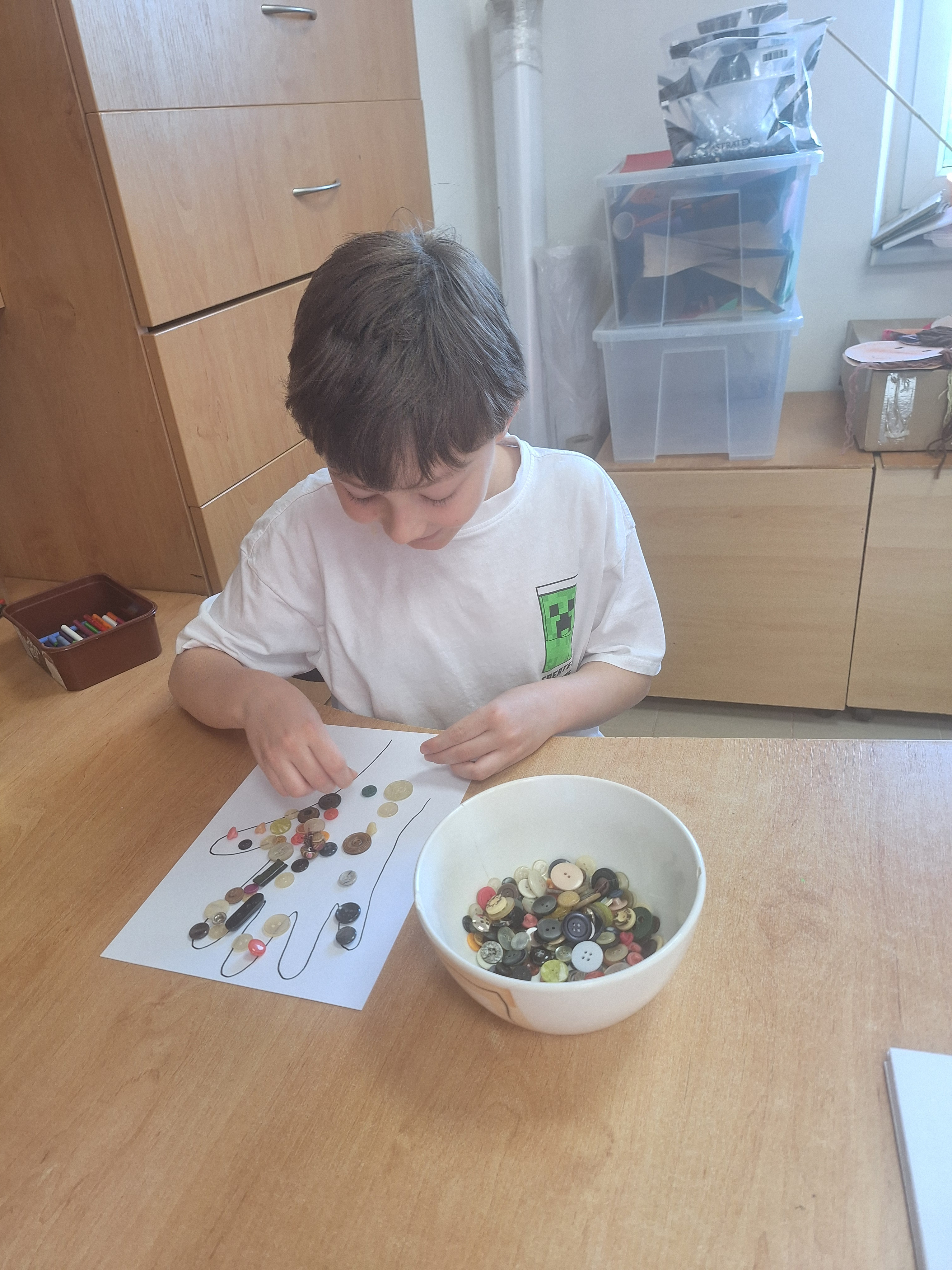 Na pěti stanovištích skládali různé obrazce podle předloh, které si sami vybrali. K dispozici měli pestrý materiál, například knoflíky, vršky od PET lahví či různé druhy luštěnin.