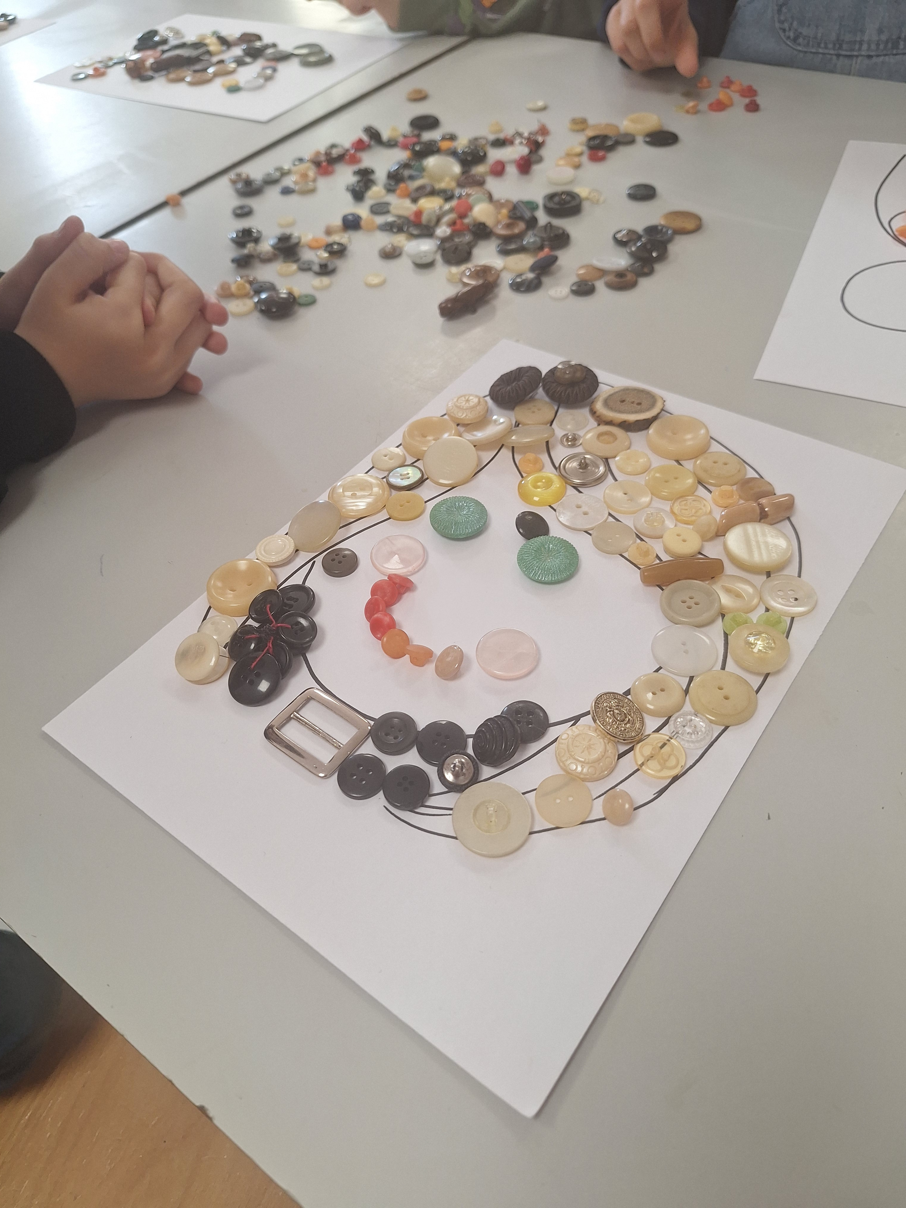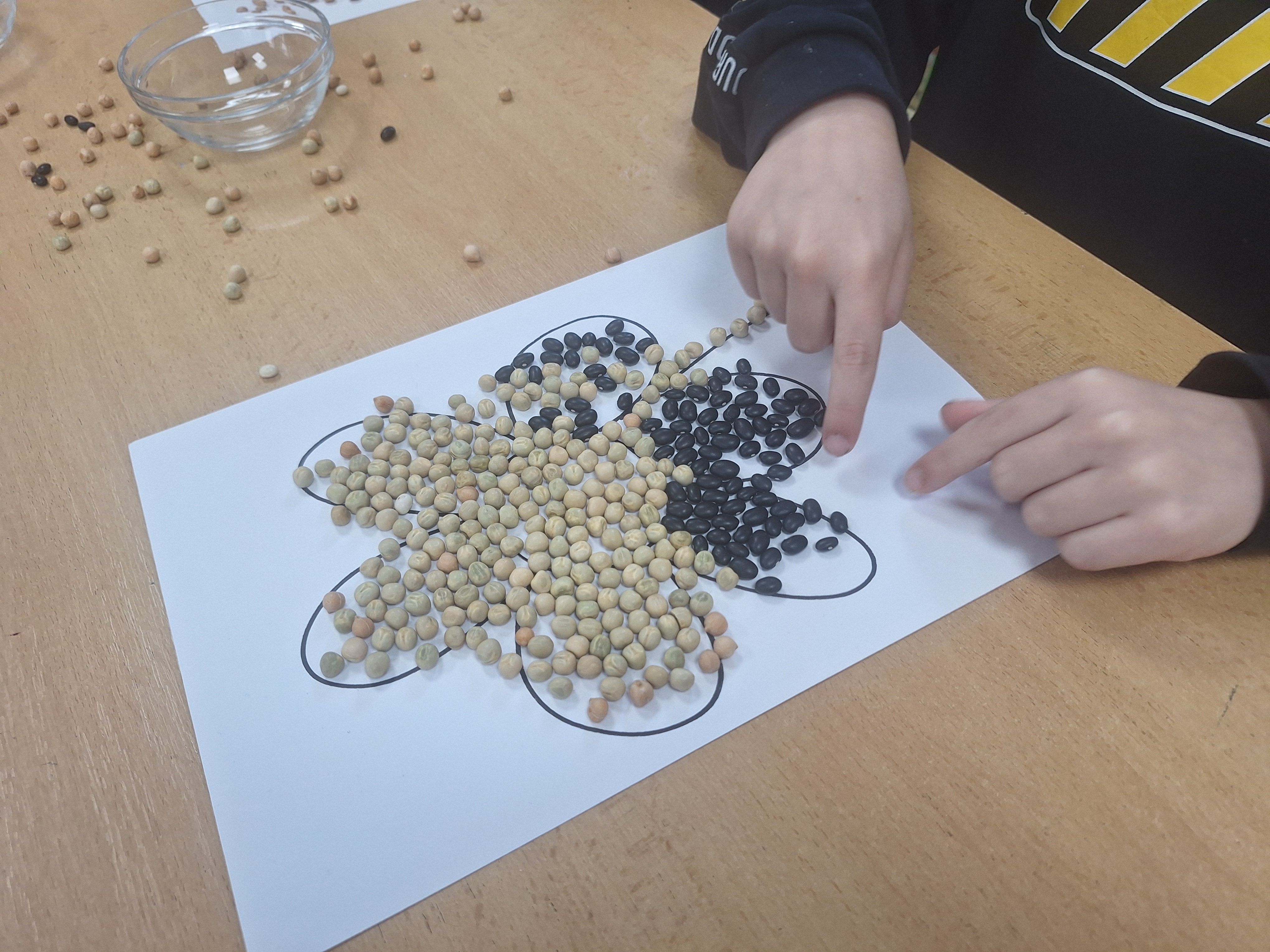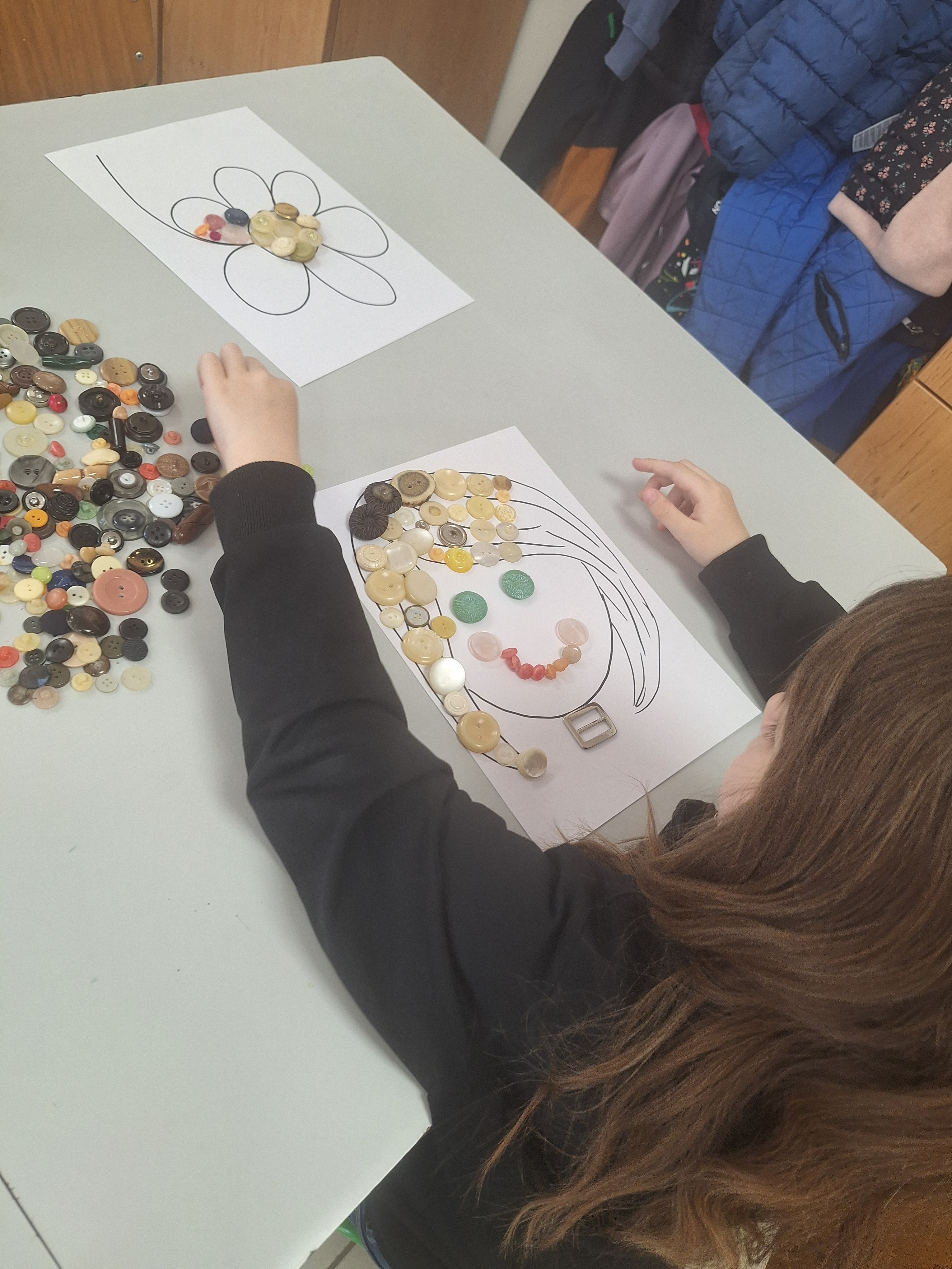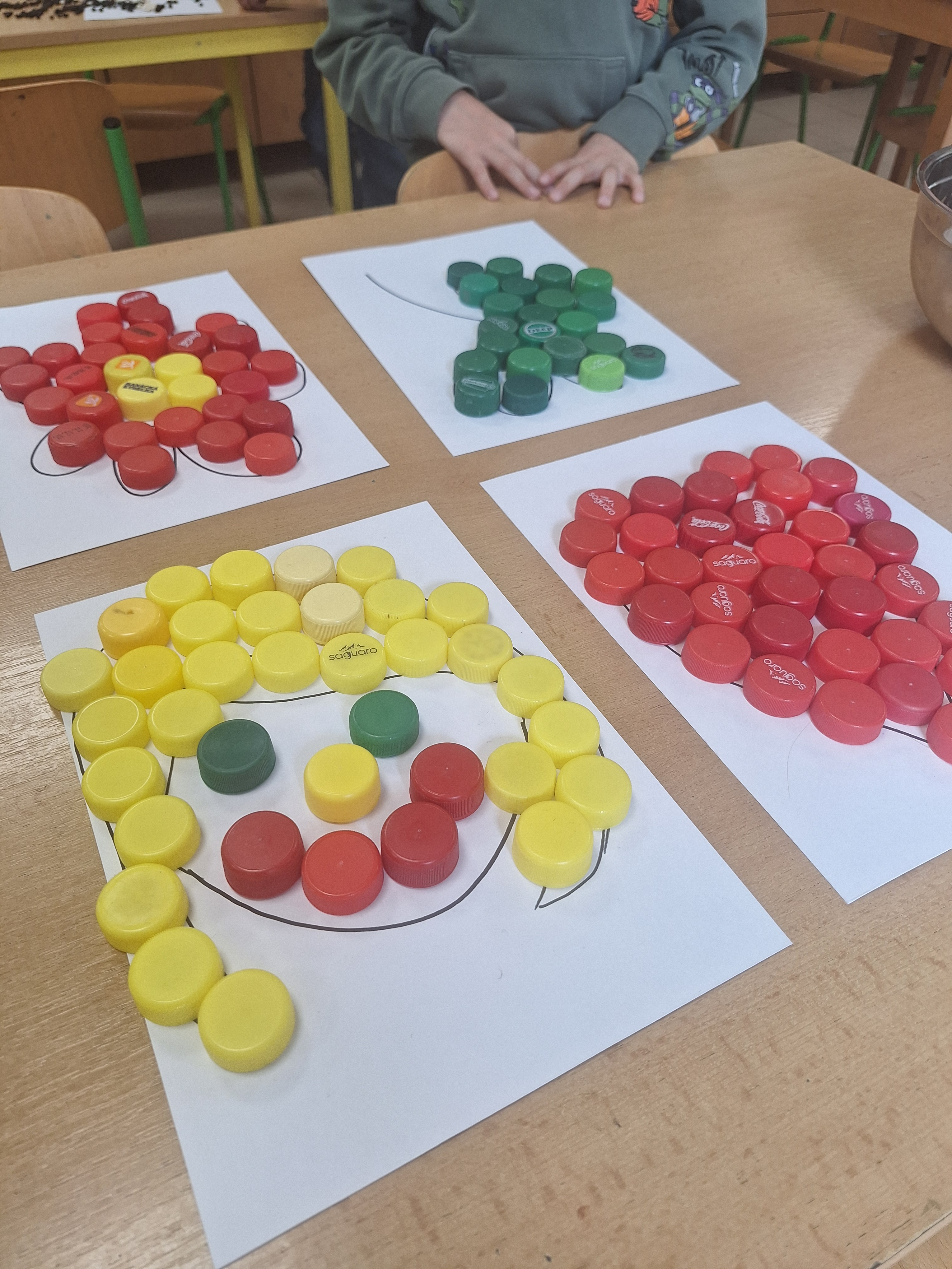 Na pěti stanovištích skládali různé obrazce podle předloh, které si sami vybrali. K dispozici měli pestrý materiál, například knoflíky, vršky od PET lahví či různé druhy luštěnin.
