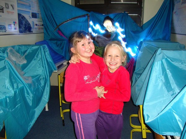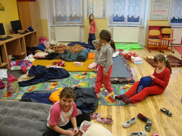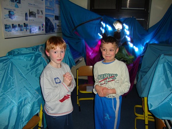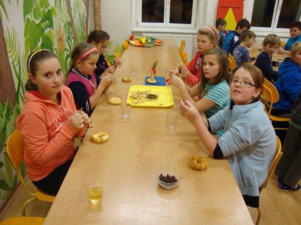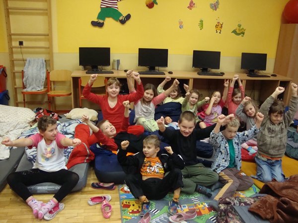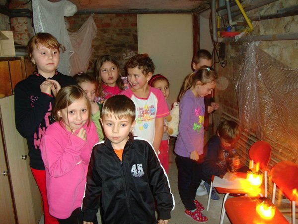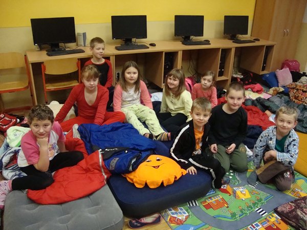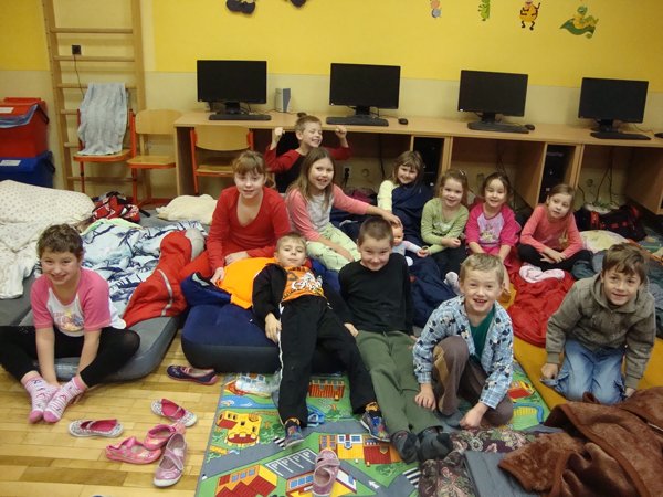Počáteční nadšení, že se vydají jednotlivě, po nakouknutí do ztemnělé chodby vzalo u většiny dětí za své. Najednou se začaly tvořit dvojice, případně trojice a i závěrečná skupinka těch „nejodvážnějších“ přilepená na paní ředitelku se pomalu vydala na cestu noční školou. Jindy důvěrně známé prostředí školy totiž ve tmě vypadá přece jen jinak. Navíc se dalo očekávat, že na jednotlivých stanovištích potkají děti strašidelné bytosti, kterým se musí vlastnoručně podepsat. Tentokrát je čekala smrtka s kosou, pavučina plná menších nebo větších pavouků a ve školním sklepě čert. Popravdě je ale potřeba přiznat, že vítězi jsou nakonec všichni, protože procházet se školou v noci chce pořádnou dávku odvahy. Abychom zapomněli na prožitý strach, šli jsme si potom zasoutěžit čertovské soutěže do tělocvičny. Poté následovala lehká večeře, čištění zubů a zalehnutí do spacáků. Prváčci si poslechli pohádku a než ji paní učitelka dočetla, spali jako dudci. To starší žáci vydrželi být vzhůru mnohem déle. Noční promítání se protáhlo do pozdních hodin, ale pak bylo slyšet jen spokojené odfukování dětí.