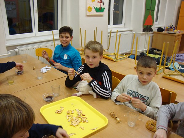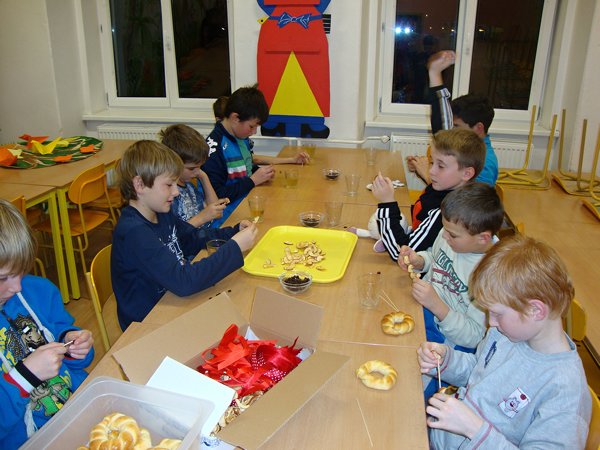 Ve středu 4. prosince nastal v naší škole kolem 18. hodiny neobvyklý ruch. Přicházeli rodiče se svými dětmi, aby je dovedli na tolik očekávané „Spaní ve škole a Mikulášskou stezku odvahy“. Pro prvňáčky to bylo letos poprvé, proto je starší žáci zasvěceně informovali, co je čeká. Po ubytování už děti netrpělivě vyčkávaly, kdy nastane noční stezka odvahy.
