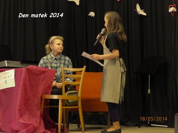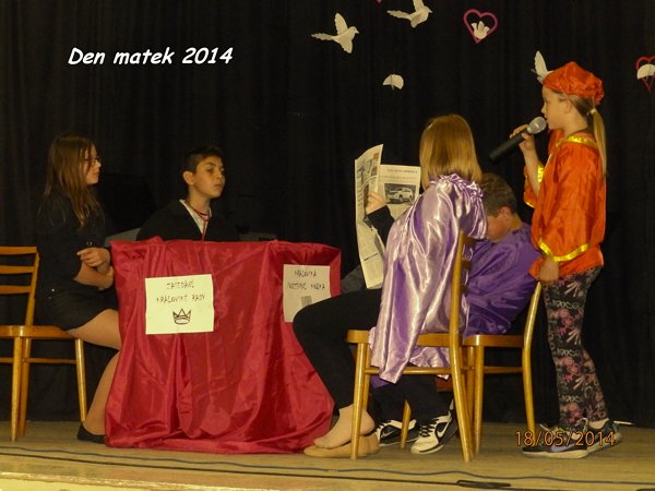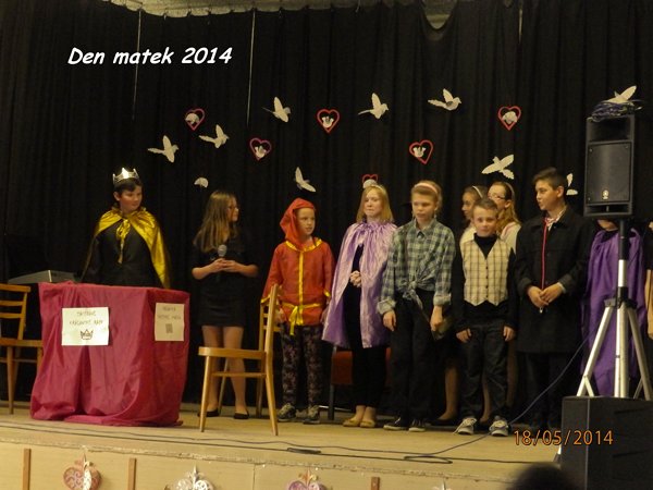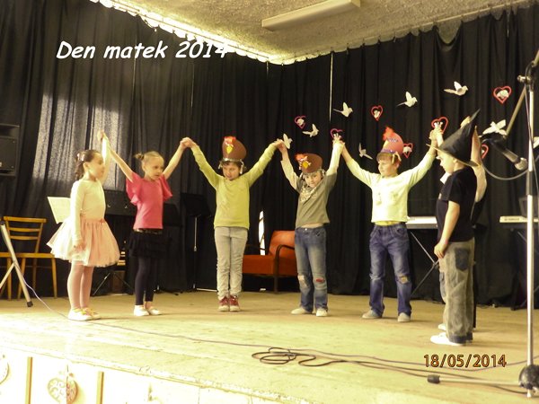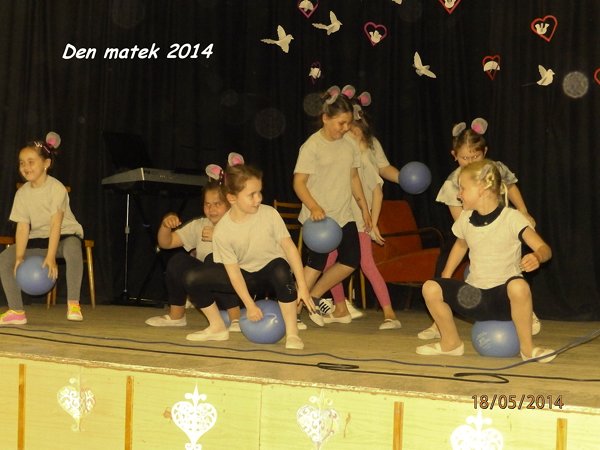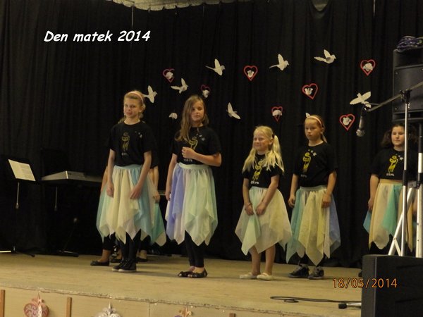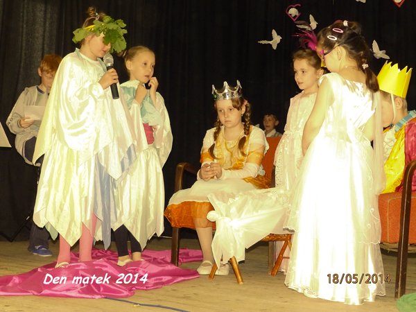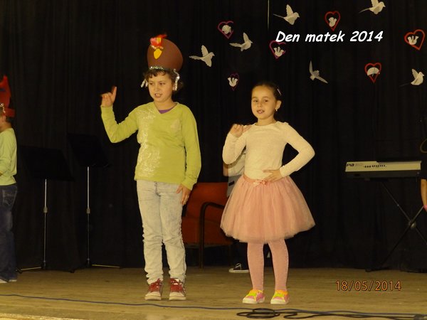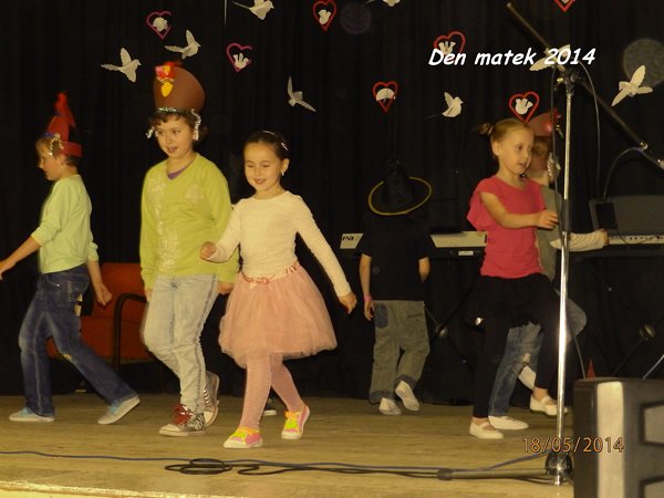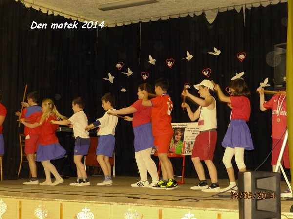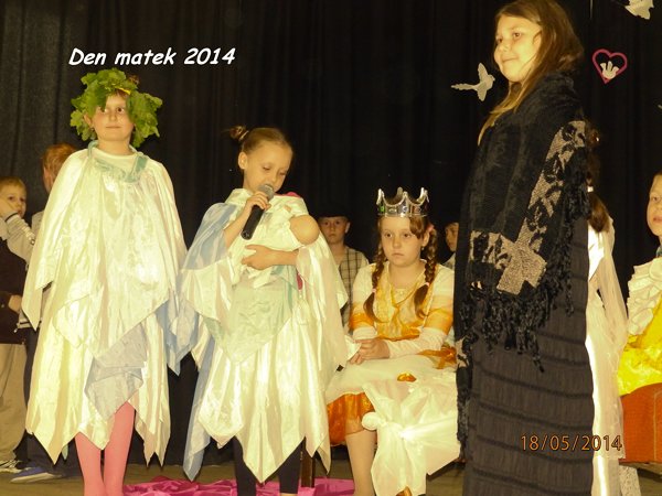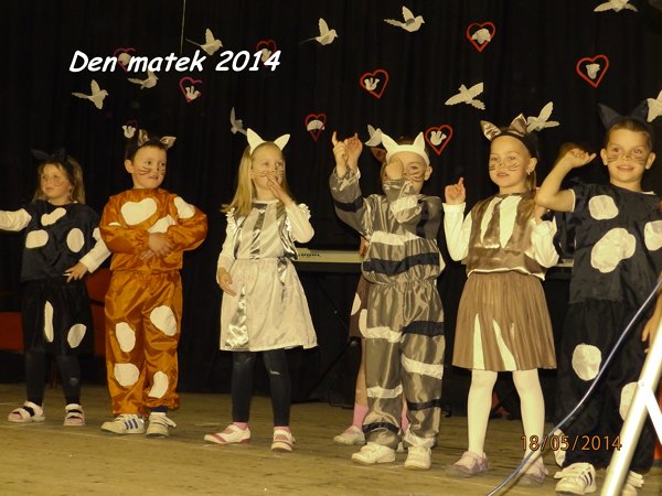 Děti z MŠ předvedly pohybové cvičení „Kočičí školka“, žáci 1. ročníku se pochlubili pohybovým cvičením „My jdem…“, spolu s 2. ročníkem předvedli také zkrácenou podobu pohádky o Šípkové Růžence. Pohybové cvičení „Být jako Bára“ o naší olympijské vítězce si připravili žáci 3. a 4. ročníku. Příběh „Až vysvitne Slunce“, který vypráví o smutném království, v němž je zakázáno se smát a radovat, si připravili žáci 5. ročníku. Mladší dívky předvedly „Japonskou myší polku“ od Pavla Nováka a starší dívky z tanečního kroužku Cats si připravily vystoupení s písní „Rain Over Me“. Během celého programu vystupovali se svými skladbami žáci ZUŠ a na závěr zazpíval čtyři písně sbor naší školy. Doufáme, že se vystoupení našich žáků maminkám, babičkám a tetám líbilo.