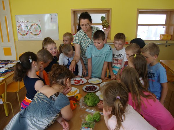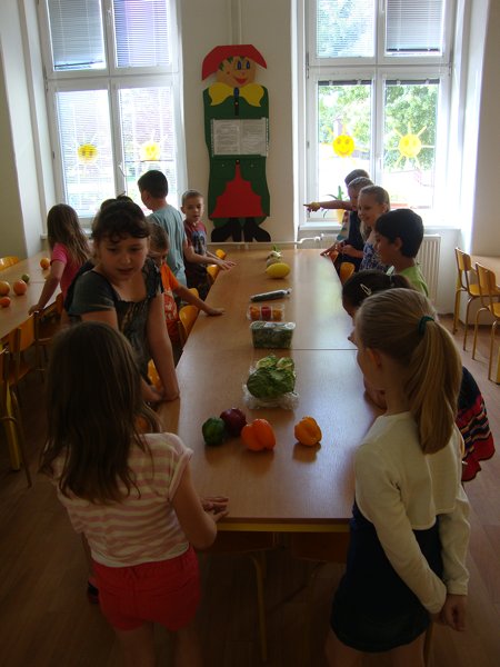 V rámci doprovodných opatření Projektu Ovoce do škol, jsme dostali Ochutnávkový koš, dvě krabice plné dobrot v podobě známých i neznámých druhů ovoce a zeleniny. Ve čtvrtek 4. června 2015 jsme připravili výstavu jednotlivých druhů. Nejdříve jsme se s jednotlivými druhy ovoce a zeleniny seznámili.
