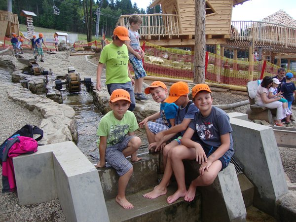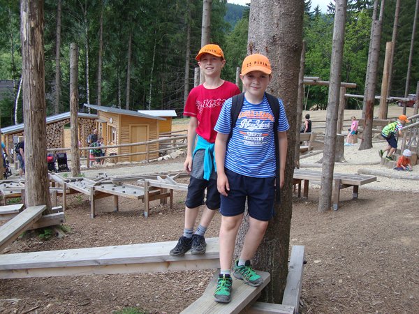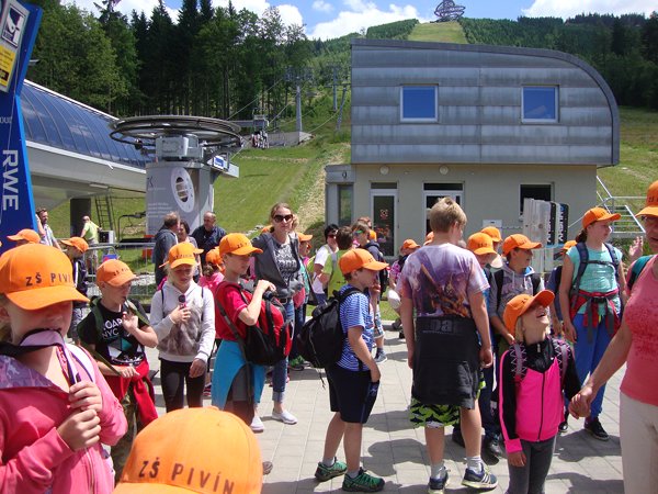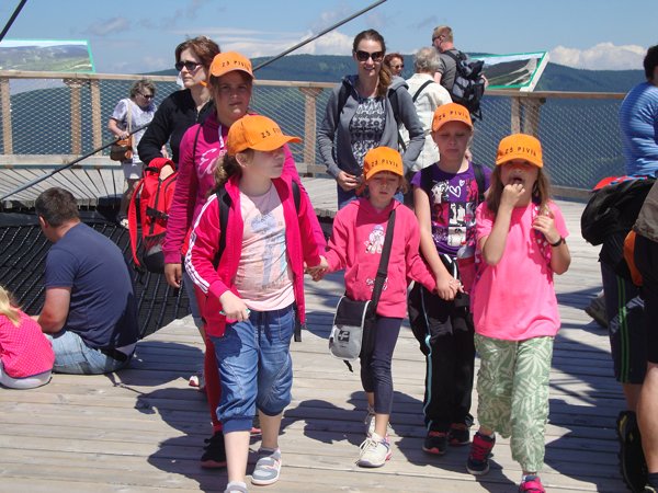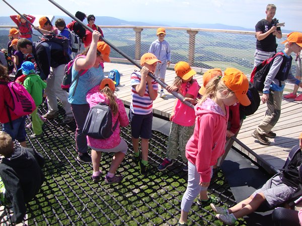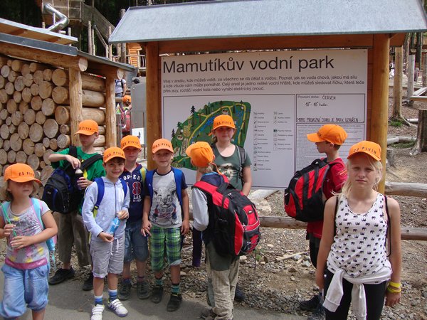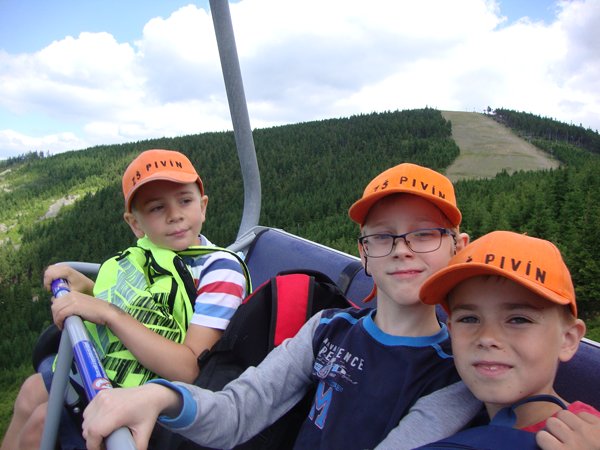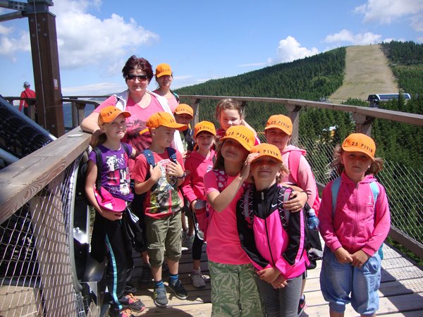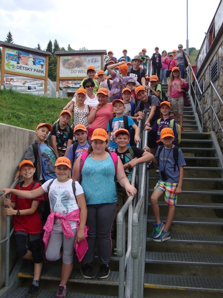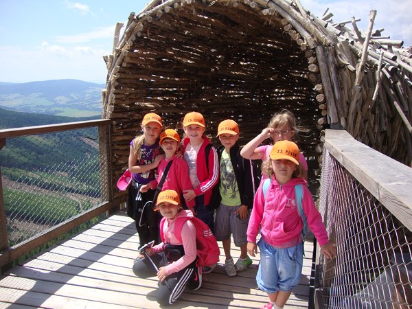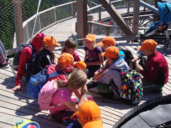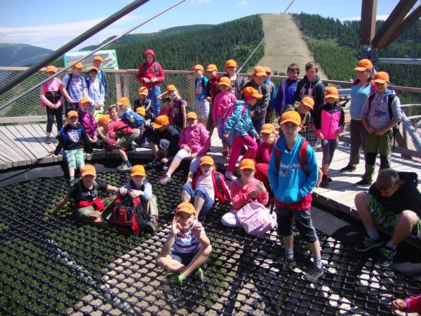 Děti byly odvážné, zvládly cestu lanovkou na Sněžník do výšky 1116 m i vyjít na vrchol samotné stezky, která je vysoká 55 m. K přesunutí mezi patry využili někteří odvážlivci tzv. rukáv, což je tunel z husté sítě a velkou odvahu vyžadoval i vstup na tzv. kapku, síť, která byla na samotném vrcholu. Potom už následoval méně náročný, ale o to více zábavný program – návštěva Mamutíkova vodního parku. Jedná se o vodní přírodní areál, kde voda je základním prvkem k hraní, experimentování a získávání zkušeností o přírodě a jejích zákonitostech. Všechny části parku jsou interaktivní a děti si mohou vše sami regulovat, vyzkoušet, uchopit či roztočit, a protože bylo teplo, mohly se ve vodě i osvěžit. Na areál navazuje Lesní zážitkový park s domečky, houpačkami, lanovými žebříky a tobogánem, kde se děti pořádně vyřádily. Tři hodiny uplynuly jako voda v potůčcích Mamutíkova parku a my jsme se museli vydat na dalekou cestu domů. Den byl náročný, ale výlet se povedl a všem se moc líbil.
