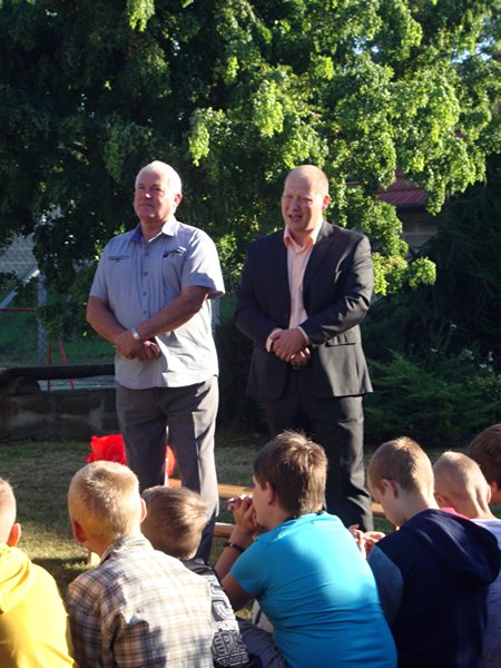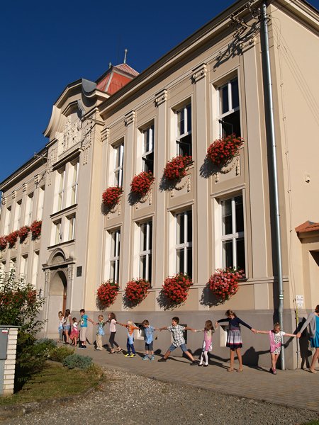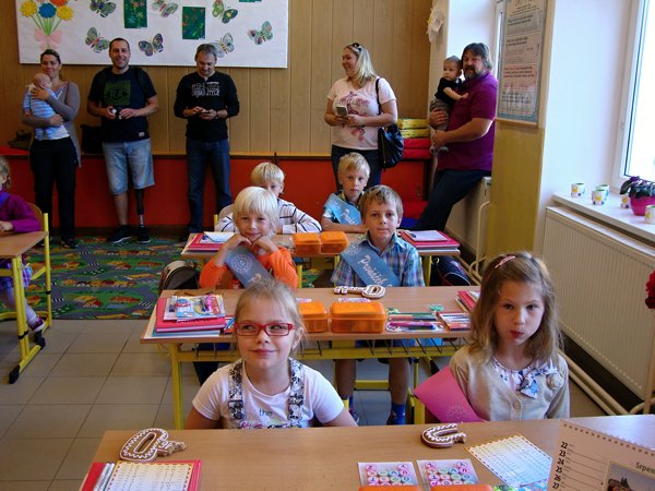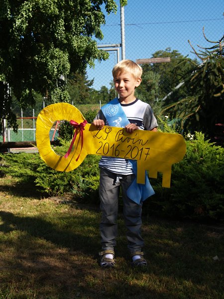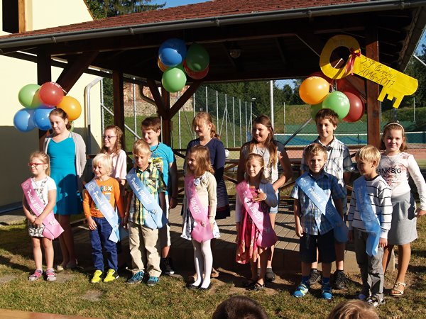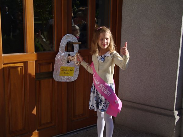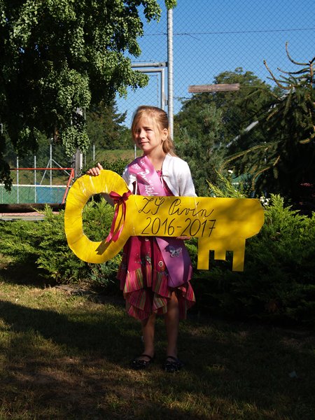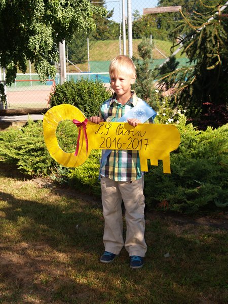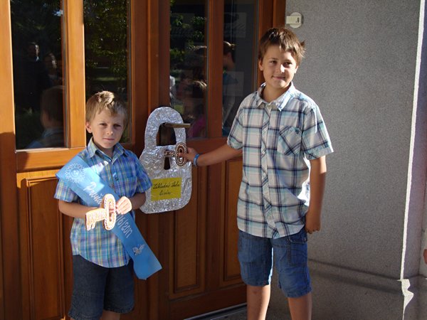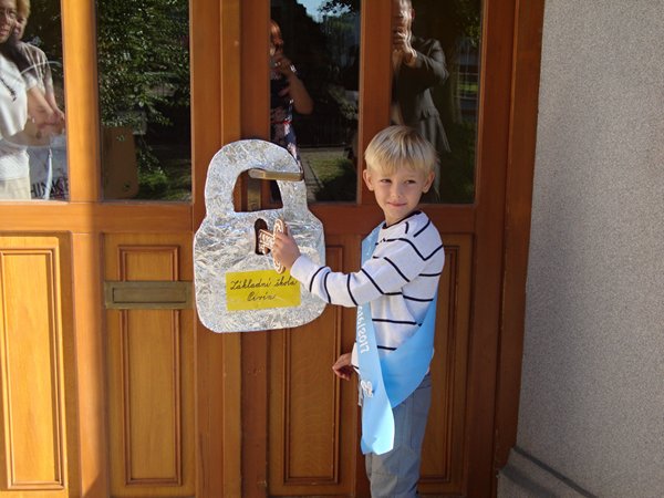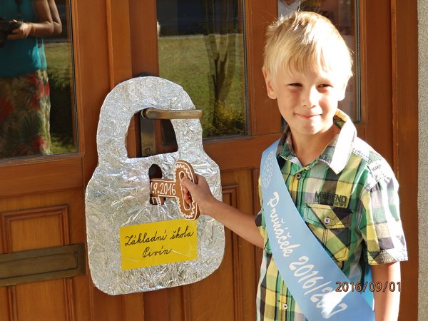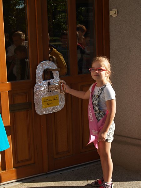 Nejdříve všechny žáky přivítala paní ředitelka, poté pan starosta a místostarosta. Své mladší kamarády přišli pozdravit i žáci a žákyně starších ročníků. Opět se stali patrony jednotlivých prvňáčků a slavnostním šerpováním na sebe vzali závazek, že budou dohlížet na to, aby se novým žáčkům ve škole líbilo a dobře dařilo. Na přivítanou jsme potom všichni společně naši školu objali a perníkovým klíčem si ji žáci otevřeli. Viktorko, Jirko, Štěpáne, Vanessko, Lucinko, Míšo a Matěji, přejeme vám, ať se vám v naší škole líbí a zažijete v ní mnoho úspěchů. Do nového roku přejeme všem žákům i paní učitelkám hodně úspěchů při práci. Rodičům přejeme radost z výsledků svých dětí a spokojenost s prací naší školy. Přejeme všem úspěšný školní rok 2016/2017.