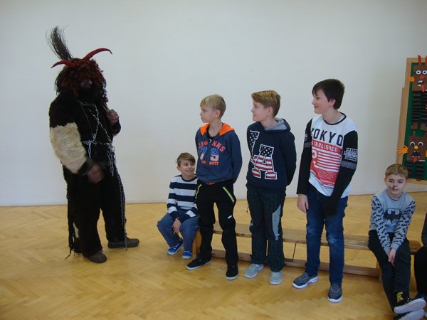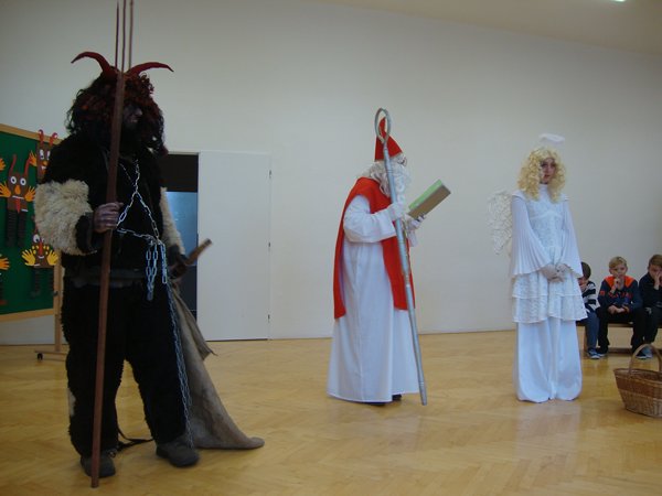 V úterý 5. prosince nás navštívil v naší škole svatý Mikuláš se svojí družinou. Dozvěděl se, že v naší škole je mnoho hodných žáků, ale najde se tu i několik těch zlobivých, kteří vyrušují, neplní si školní povinnosti a neumí se slušně chovat.