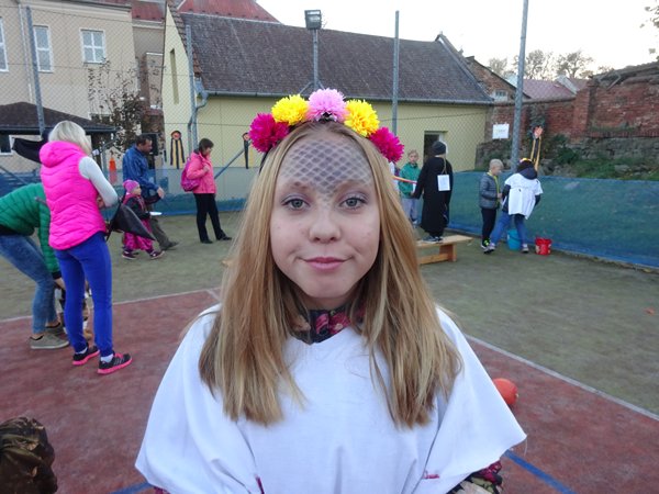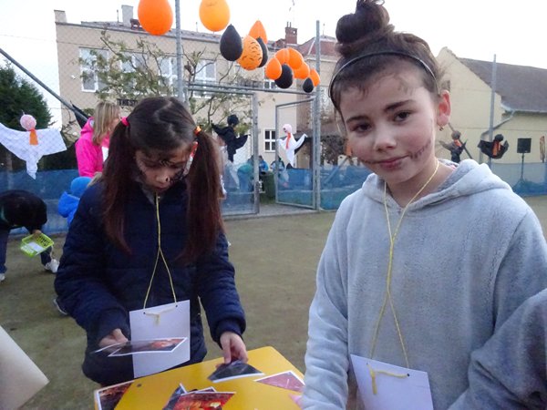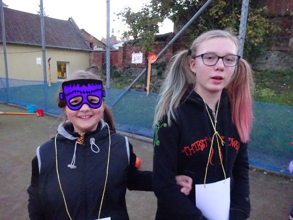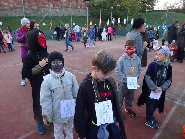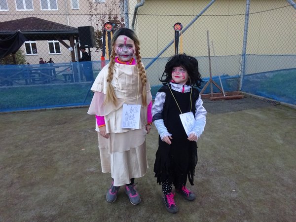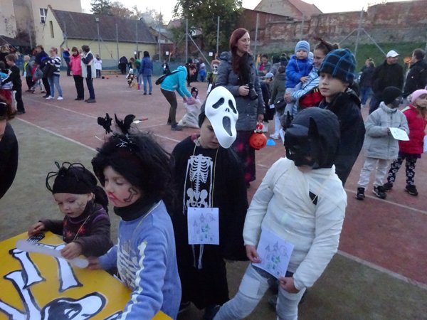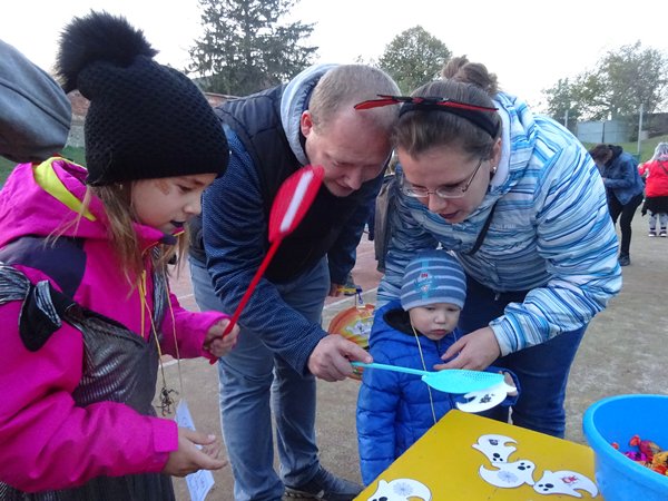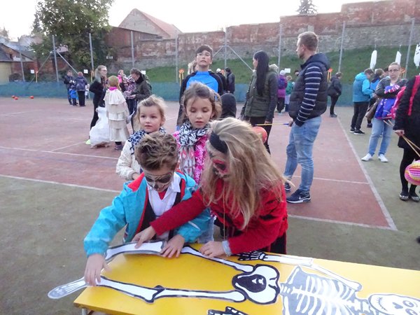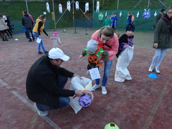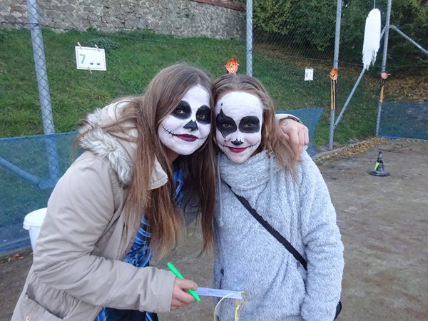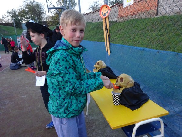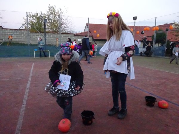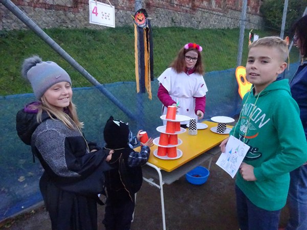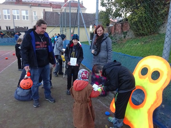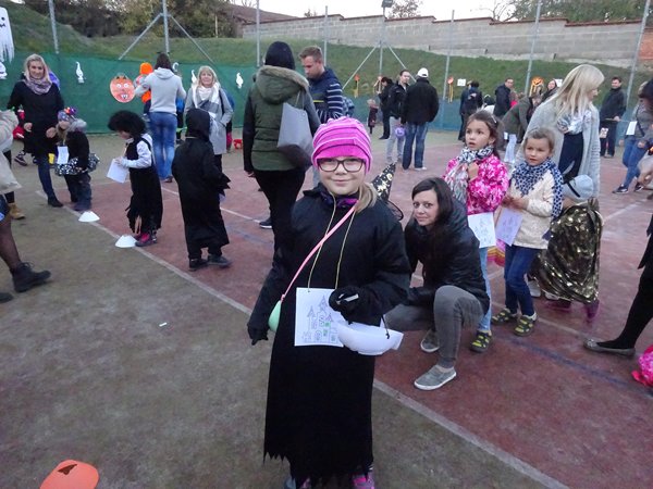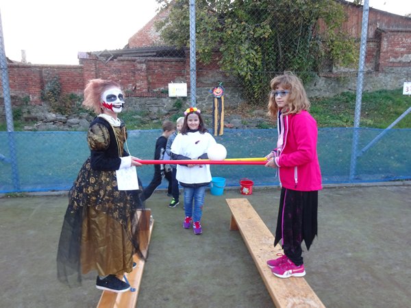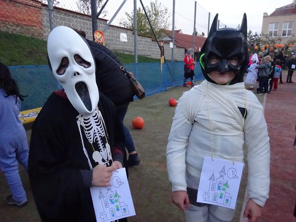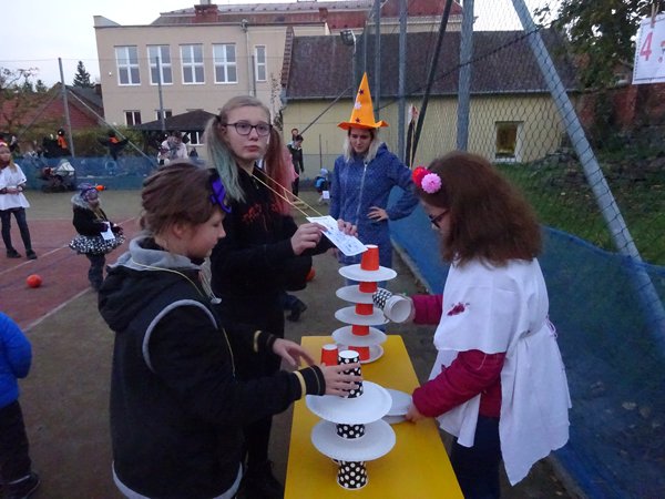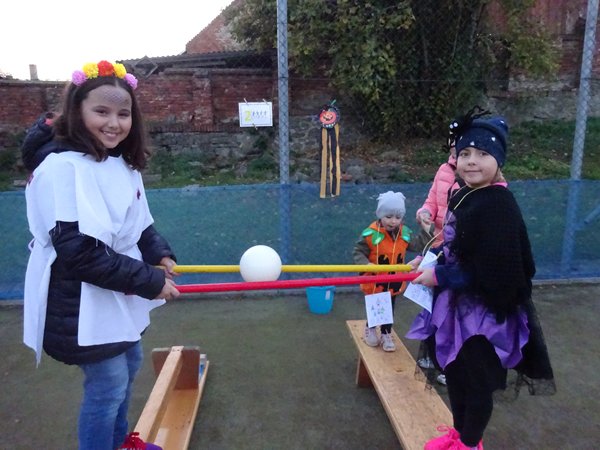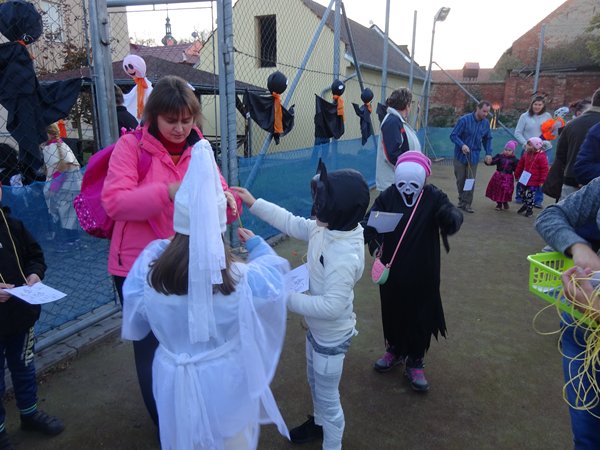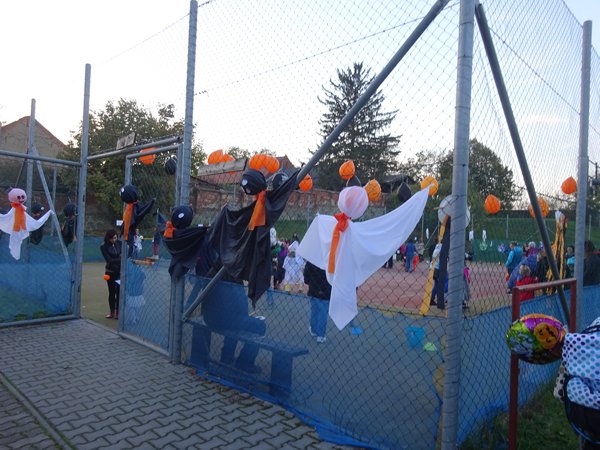 Na vyzdobeném školním hřišti připravily paní učitelky pro děti patnáct zajímavých disciplín. Po jejich splnění si děti zašly na párek a čaj, dospělí měli připravený výborný punč. Kolem sedmé se strašidla vydala na stezku odvahy, která vedla opět za školními humny. Všichni stezku zvládli, vyluštili správně tajenku a tak je na konci čekala sladká odměna. Počasí se nám vydařilo a tak všichni jistě odcházeli domů spokojení. Děkujeme všem rodičům, kteří se podíleli při přípravě a organizaci celé akce, paní učitelkám za přípravu soutěží a dětem za přípravu výzdoby.