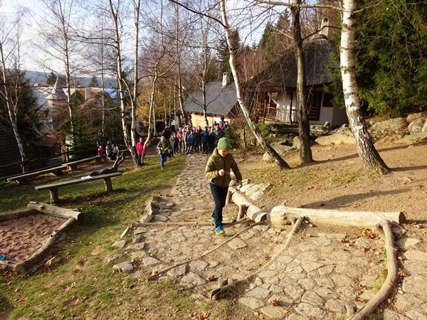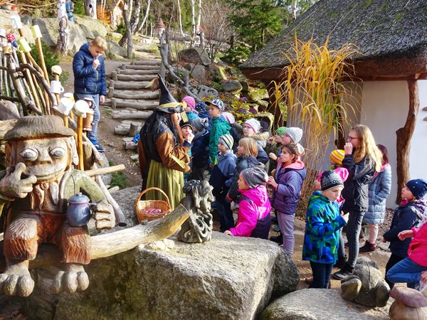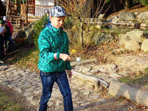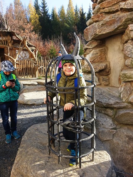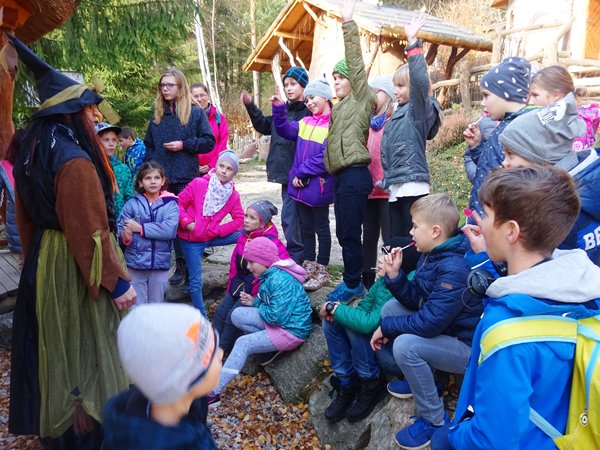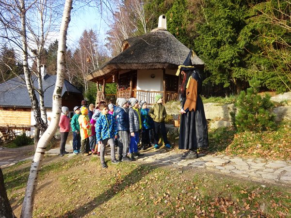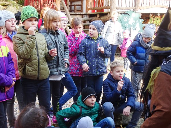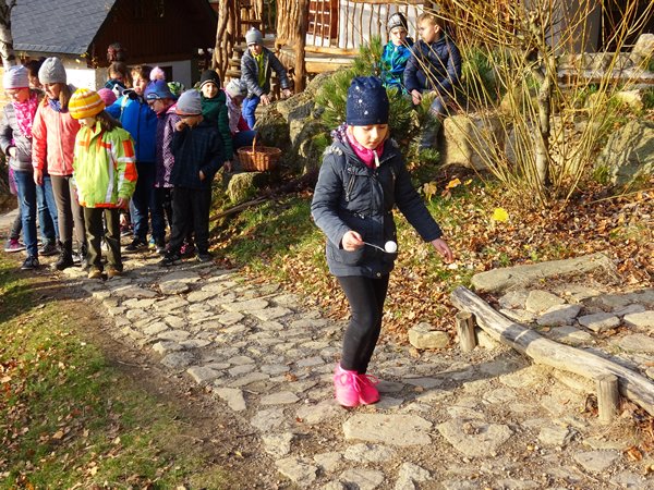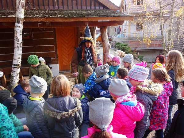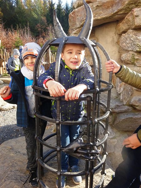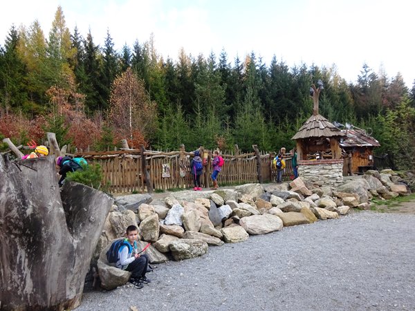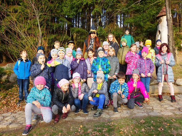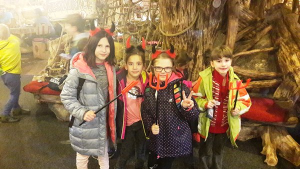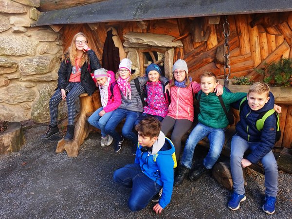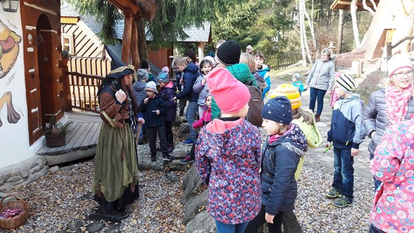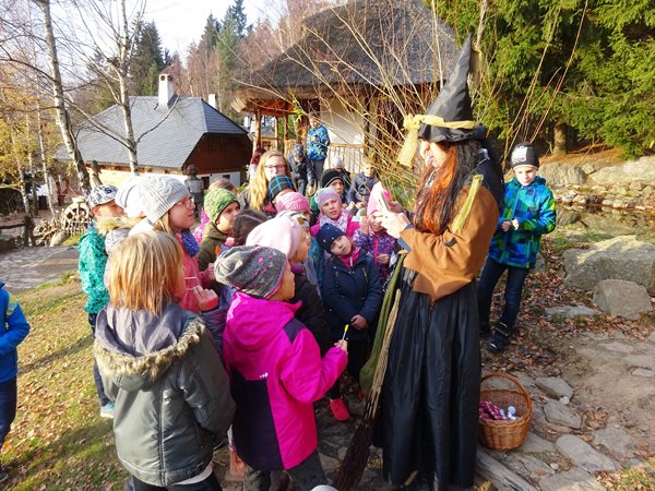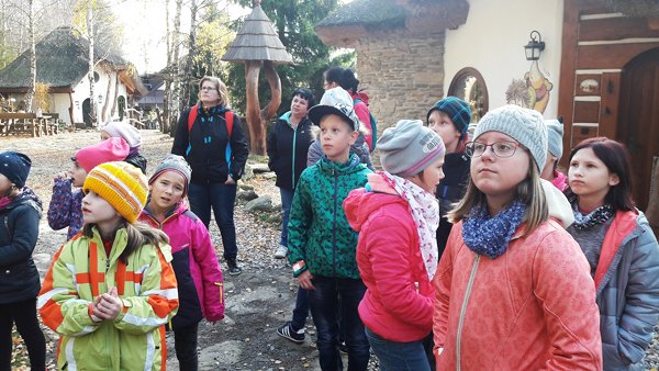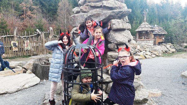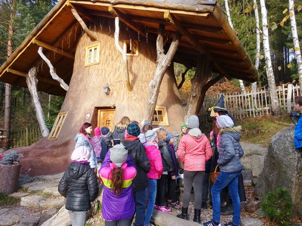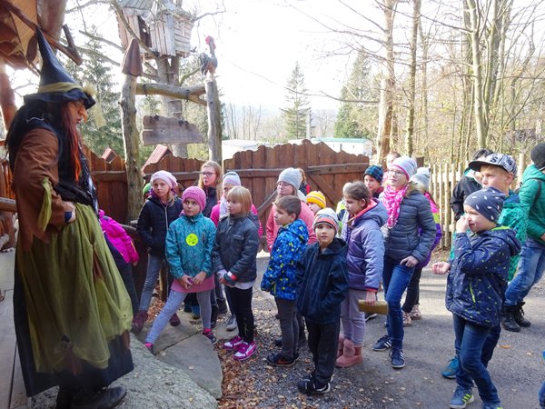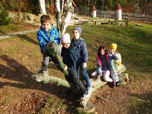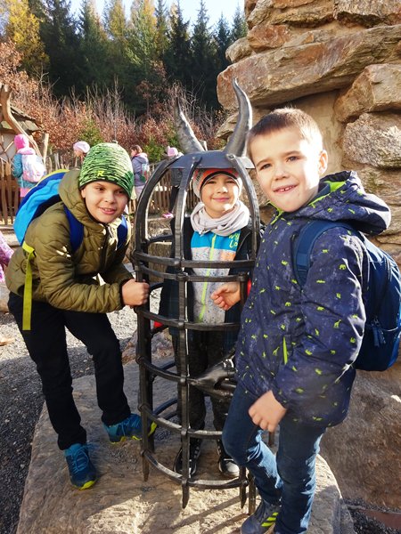 My „holota hříšná“ jsme měli možnost osobně se seznámit nejen s obyvateli pekla, ale někteří z nás dokonce v trapírně vyzkoušeli na vlastní kůži pekelné stroje jako zadkoplesk a huboplesk. Řinčení řetězů, kvílení hříšníků a praskání ohně bylo velmi věrohodné a někteří menší návštěvníci se dokonce chvilku i báli. Všechny obavy ale rychle zmizely, protože čerti a čertice byli přátelští. Podívali jsme se do čertovské školy i kuchyně a nakonec jsme došli do pekelného sálu s Luciferovým trůnem a pekelnou váhou. Tam nás přivítal sám Lucifer a sdělil nám, že po důkladné inspekci Knihy hříchů se rozhodl, že z naší výpravy zatím nikdo není tak velký hříšník, aby si ho Peklo muselo nechat. Ještě pár roků si prý na nás počkají. Po prohlídce pekelného doupěte jsme si dopřáli pohoštění v pekelné hospůdce. V obchůdku jsme nakoupili dárečky a vydali jsme na další cestu. Ta nás dovedla do nedaleké Pohádkové vesničky Podlesíčko, kde na nás už čekala čarodějnice Kanimůra. Prošla s námi všech 10 malebných domečků a připomněla nám ty nejznámější české pohádky a jejich postavičky. Na závěr jsme si zasoutěžili a pak už jsme se příjemně unaveni vydali na dalekou cestu domů. Výlet se nám všem líbil, počasí bylo nádherné, cesta bez komplikací a Peklo i Podlesíčko zajímavé.