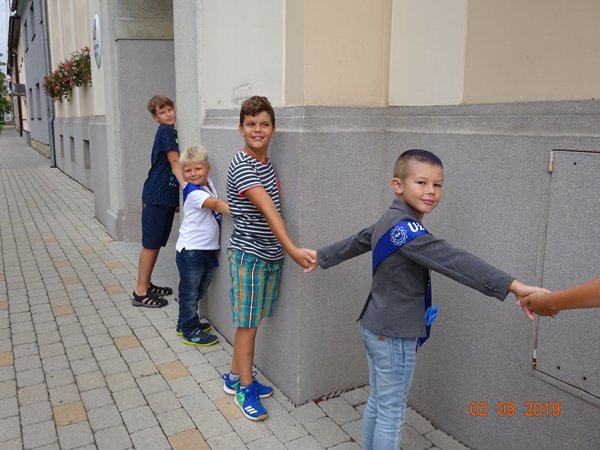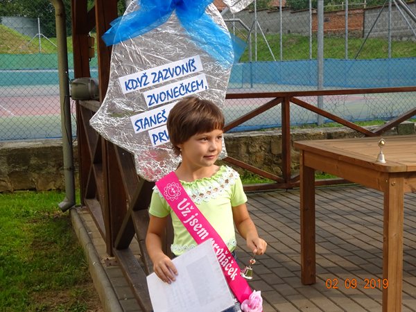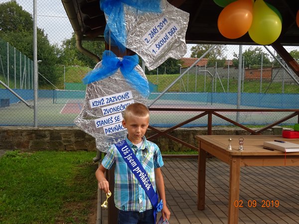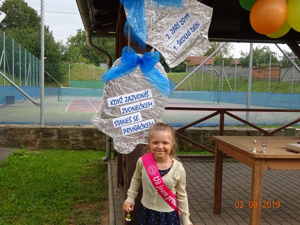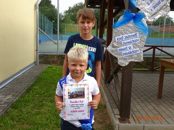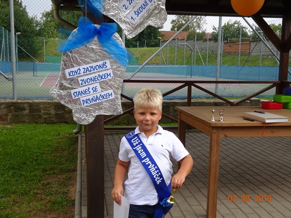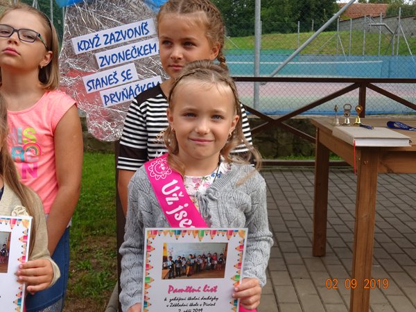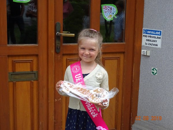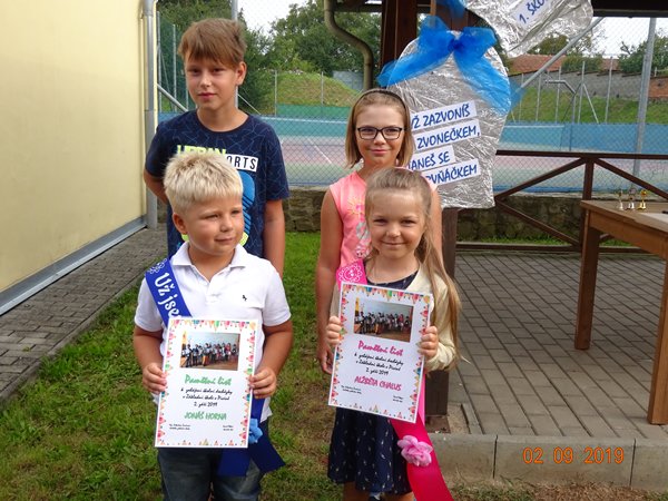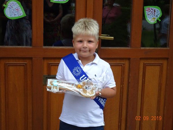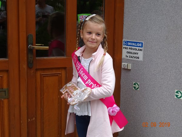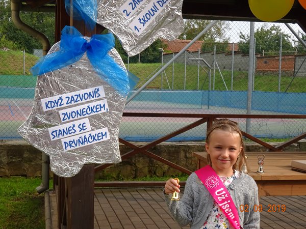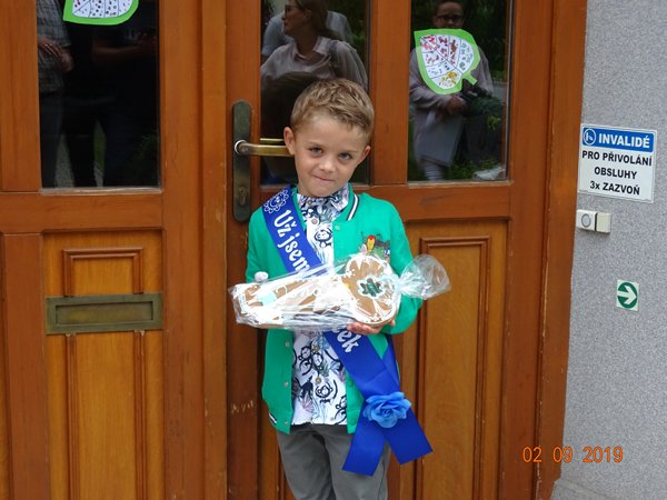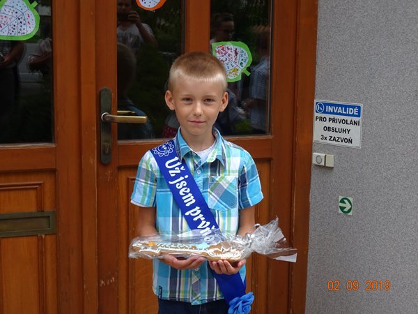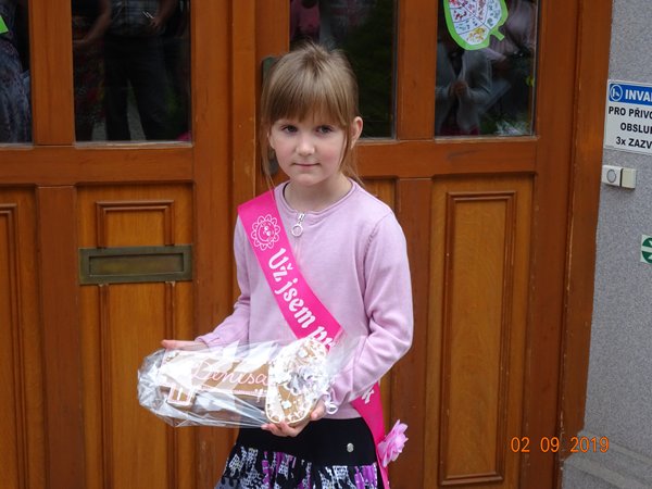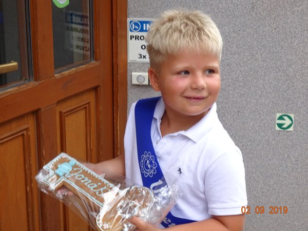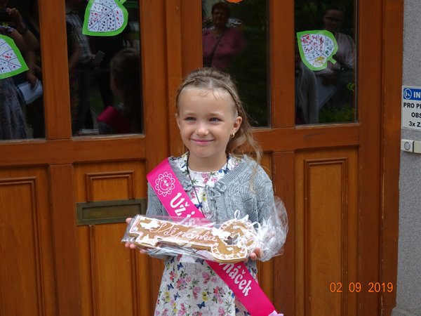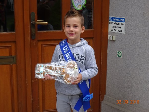 Nejdříve všechny žáky přivítala paní ředitelka a poté pan starosta. Své mladší kamarády přivítali i žáci a žákyně starších ročníků. Patroni ze starších ročníků přivítali své prvňáčky. Po slavnostním šerpováním jsme všichni objali naši školu a potom si Jonáš H., Alžbětka, Štěpánka, Deniska, Sofinka, Lucinka, Lukáš, Tadeáš, Jonáš T. a Miloš odemkli perníkovým klíčem svoji školu. Prváčci, přejeme vám, ať se vám v naší škole líbí a zažijete v ní mnoho úspěchů. Úspěšný školní rok 2019/2020 přejeme také všem žákům, jejich rodičům i paní učitelkám.