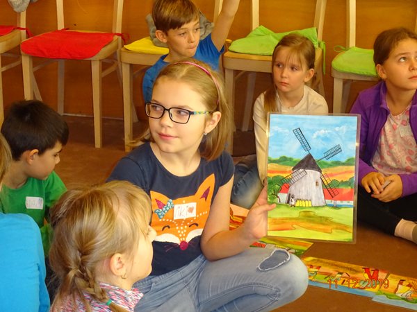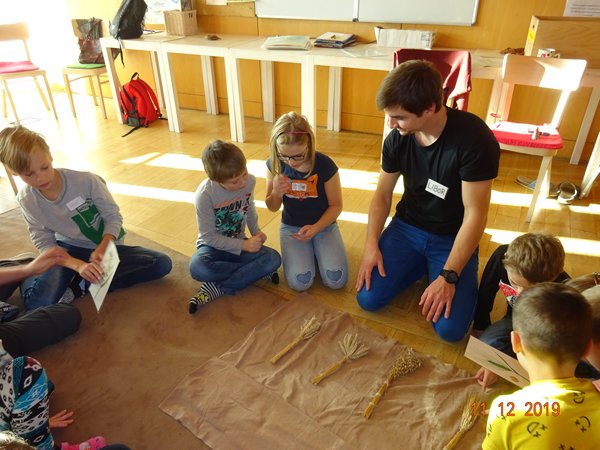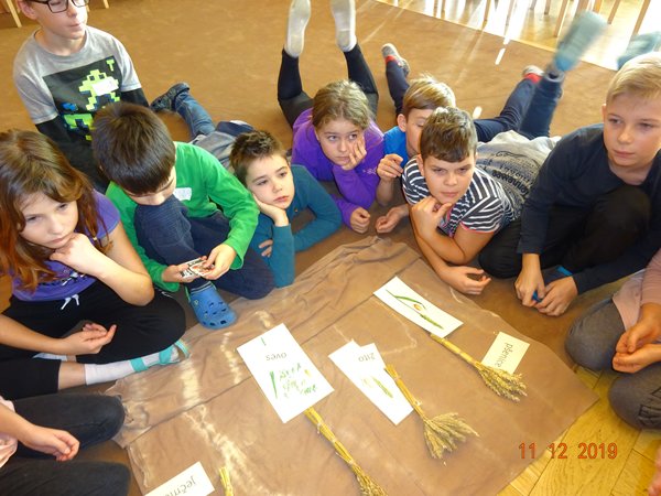 Během dvouhodinového programu jsme se dozvěděli, co všechno je potřeba udělat, než se dostane houska na náš stůl. Připomněli jsme si také, jaké známe druhy obilí, vyzkoušeli jsme si mlácení obilí cepem, zkusili jsme práci s mlýnkem, hnětli těsto, pletli housky, pekli a pak už jen ochutnávali.