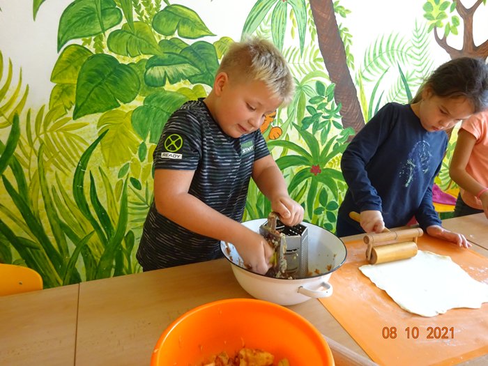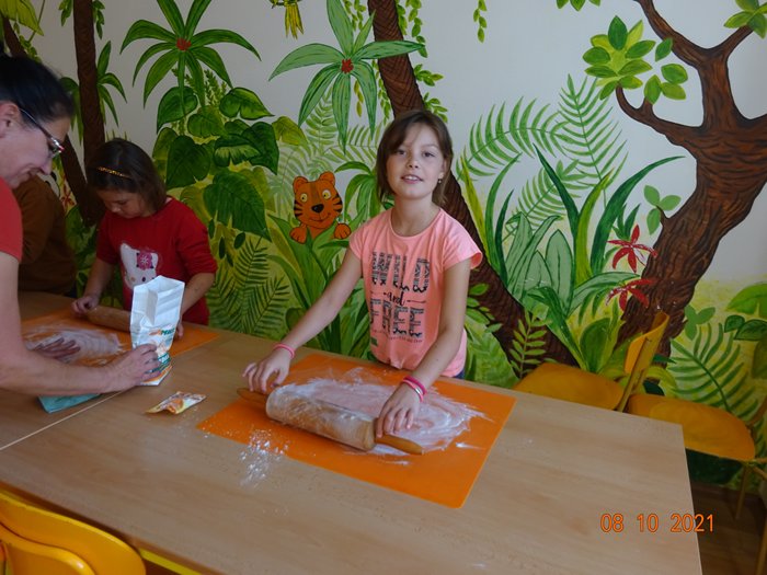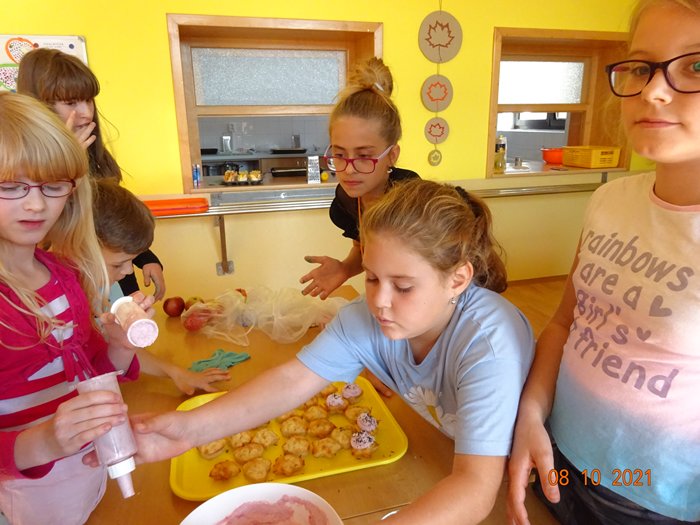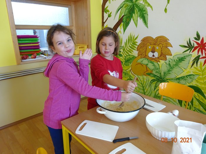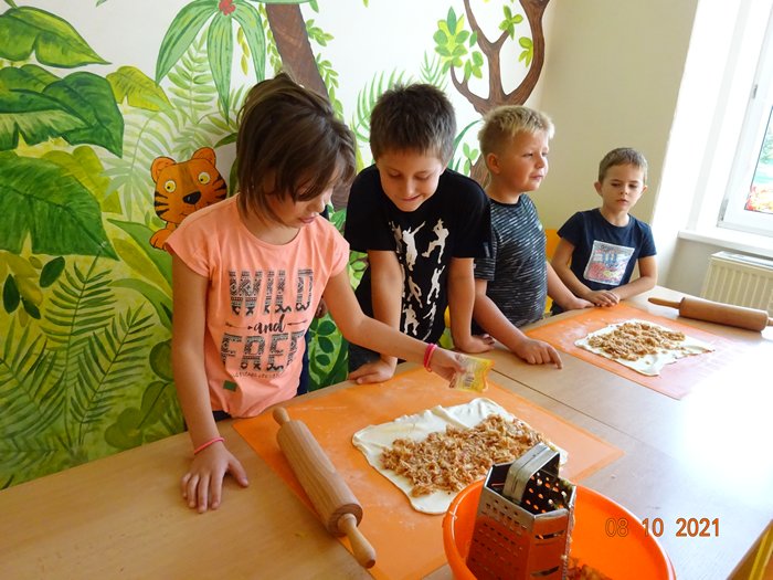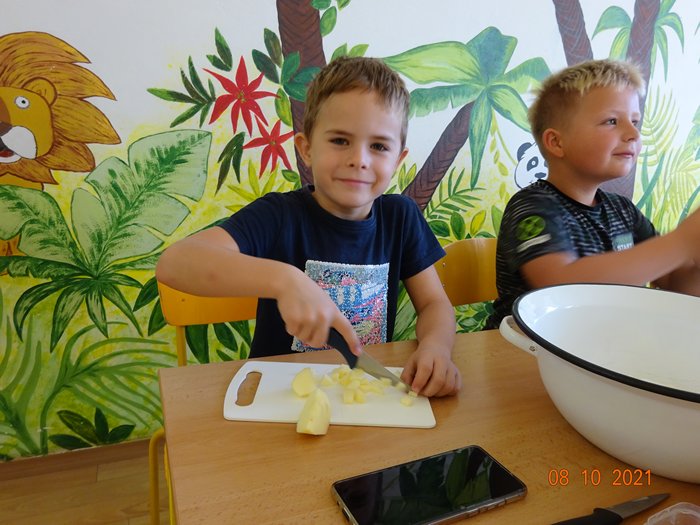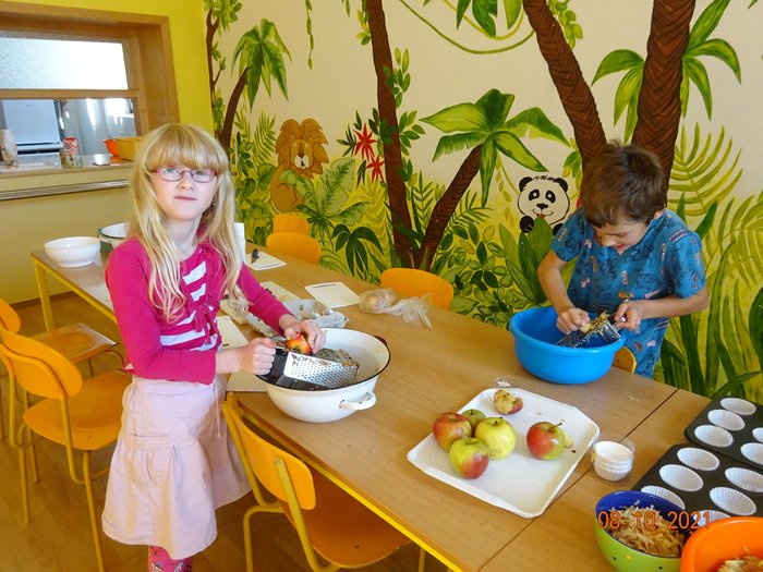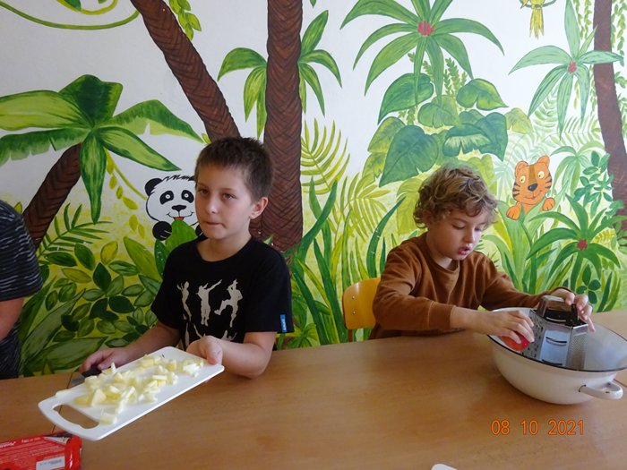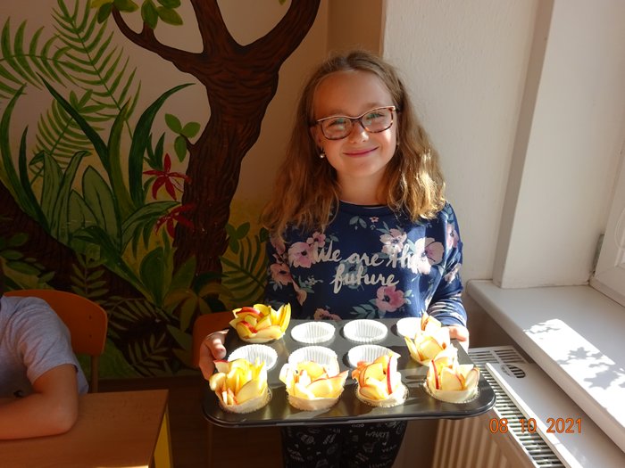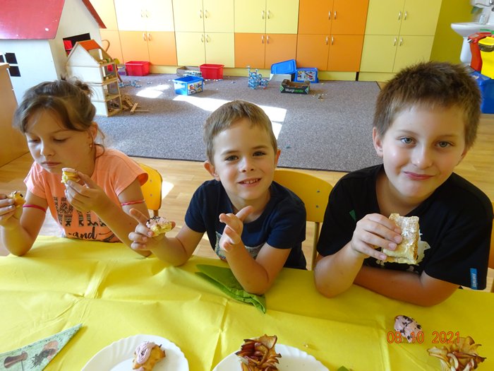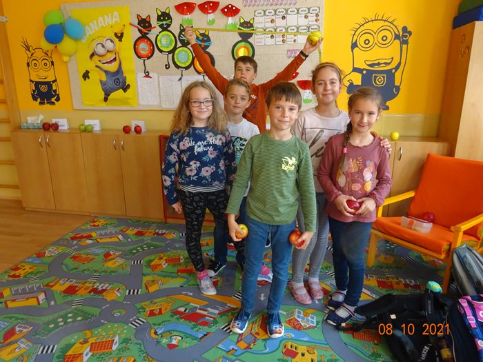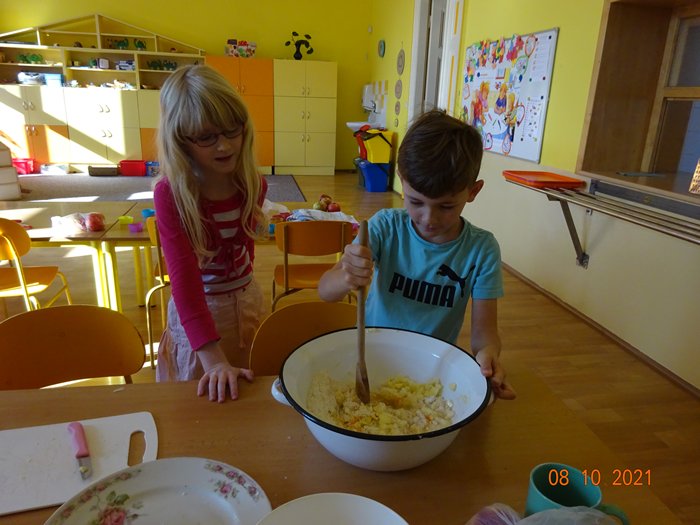 Na 1. stanovišti jsme měřili a vážili největší a nejmenší jablko, seznámili jsme se s různými odrůdami jabloní, s jejich pěstováním a využitím. Skládali jsme puzzle, vyhledávali informace a hádali hádanky. Na 2. stanovišti jsme malovali a lepili jablíčka a na 3. stanovišti jsme si vyzkoušeli upéct z jablíček různé dobroty – štrúdl, muffiny a jablečné růžičky.