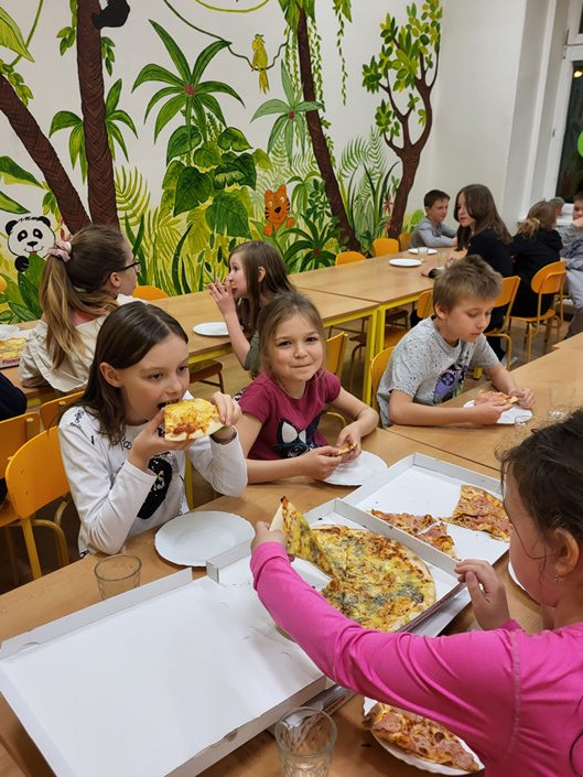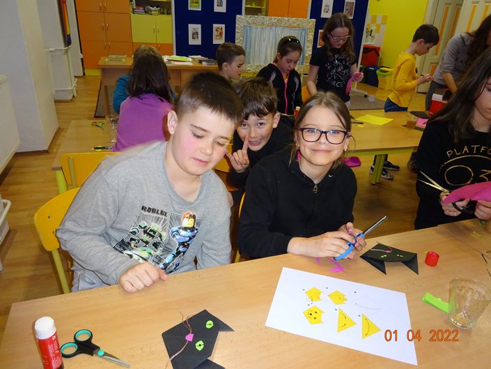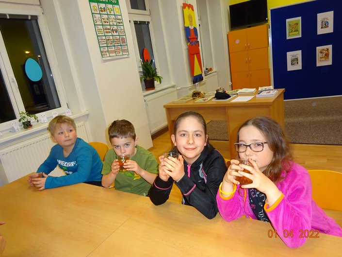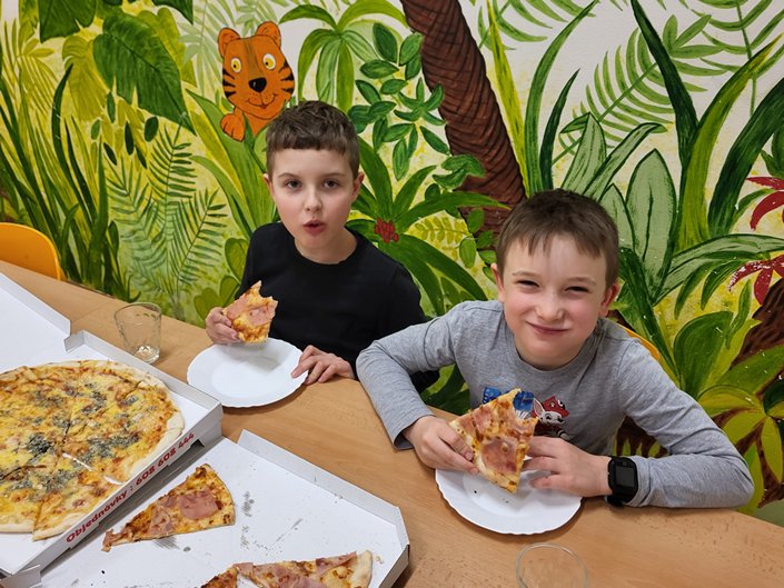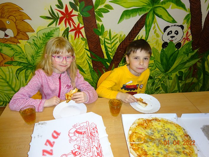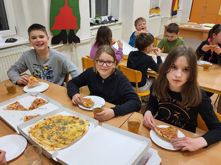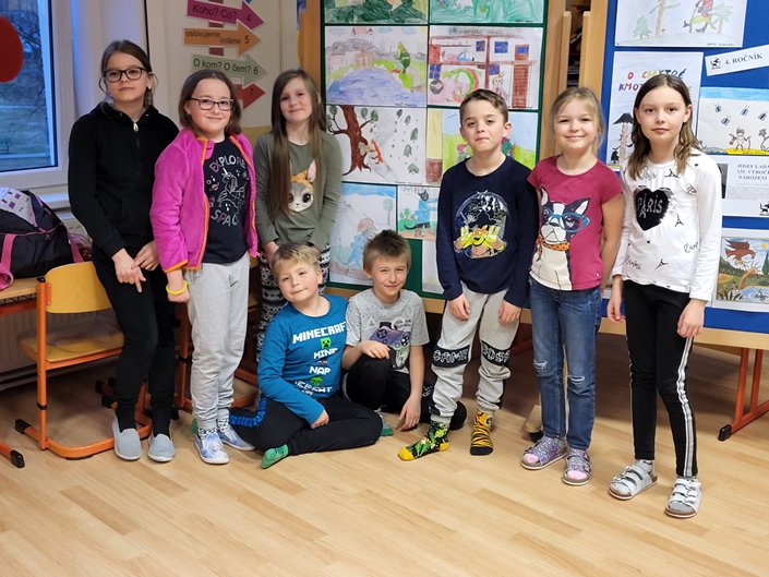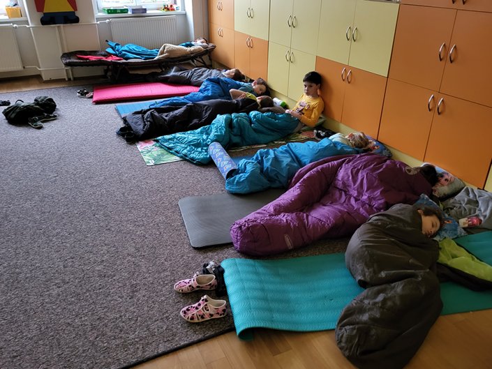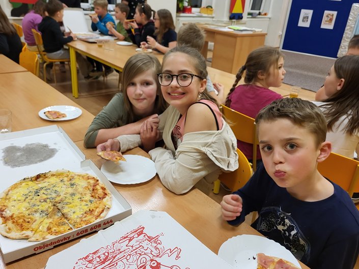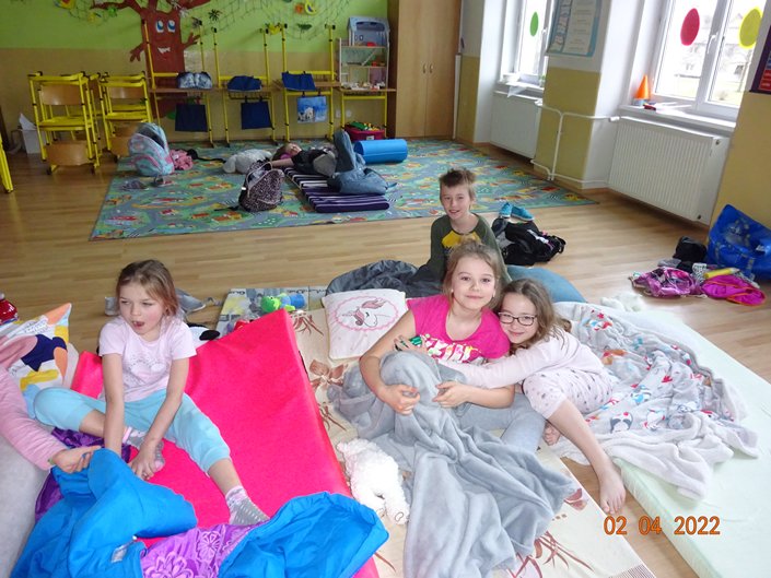 Nejdříve jsme kladli otázky duchu pana Andersena, který nám odpovídal na vše, co nás zajímalo. Potom jsme se během prezentace dozvěděli mnoho informací o našem malíři Josefu Ladovi, který by se letos dožil 135 let. Hned nám bylo jasné, proč jsme měli za úkol namalovat jeho obrázek jako vstupenku na spaní ve škole. Z jeho pohádkové knížky O kocouru Mikešovi jsme si potom v přestrojení za babičky a dědečky navzájem předčítali. Vyplnili jsme pracovní listy a vyrobili kocourka Mikeše. Po občerstvení v podobě výborné pizzy jsme se vydali na pohádkovou stezku večerní školou. Setmělými chodbami se občas ozývaly strašidelné zvuky, ale všichni jsme došli do cíle a složili puzzle s obrázkem Josefa Lady. Pak jsme se už zavrtali do svých pelíšků. Starší děti se ještě podívaly na film, ale mladší děti brzy usnuly. Ráno jsme se sbalili, rozdali si diplomy a odměny a po snídani (maminky napekly výborné koláčky, děkujeme) jsme se vydali domů.