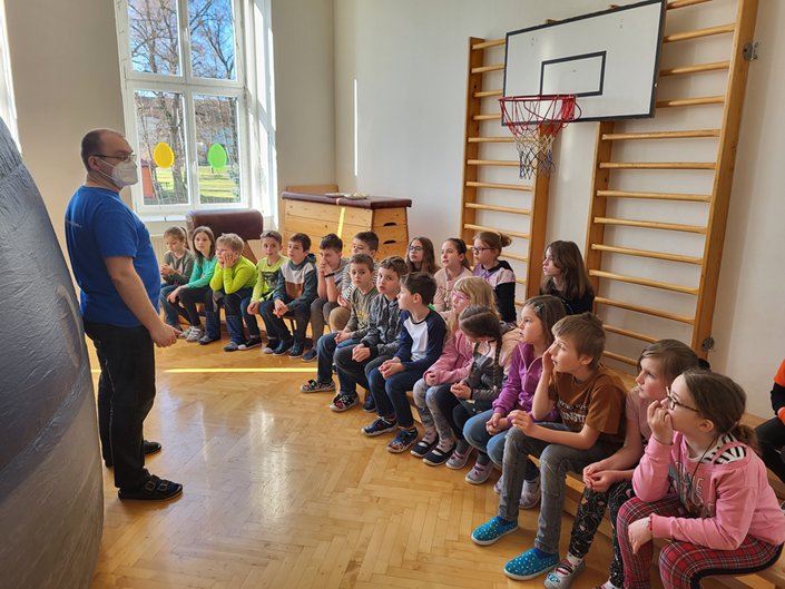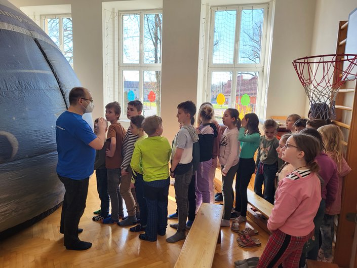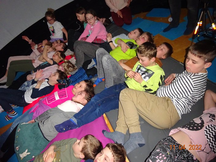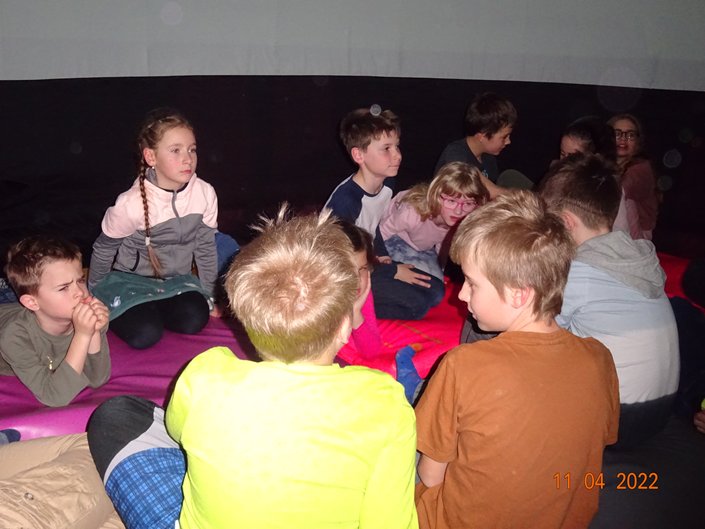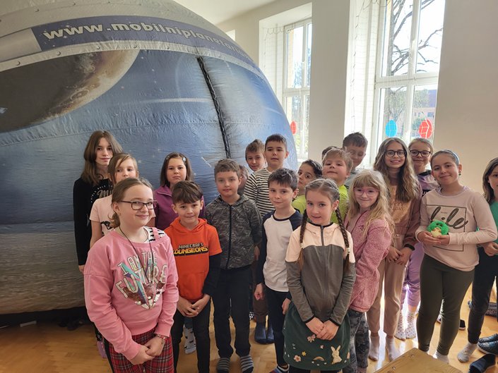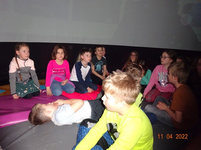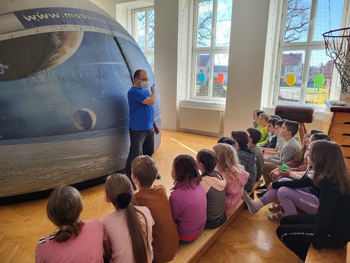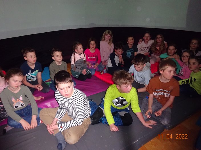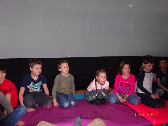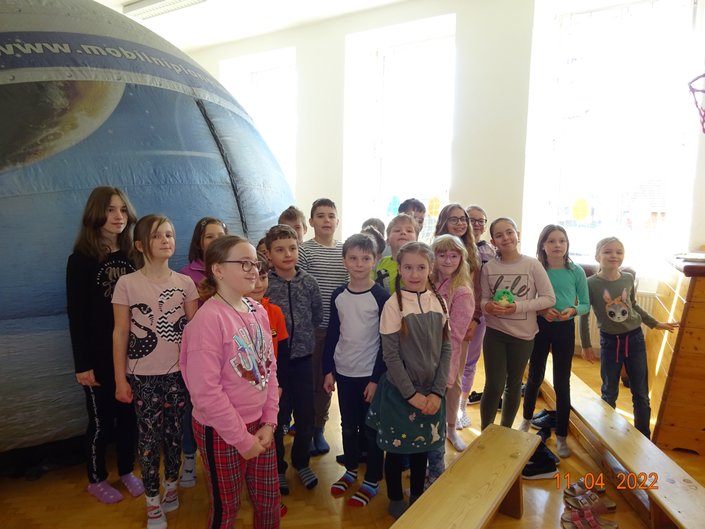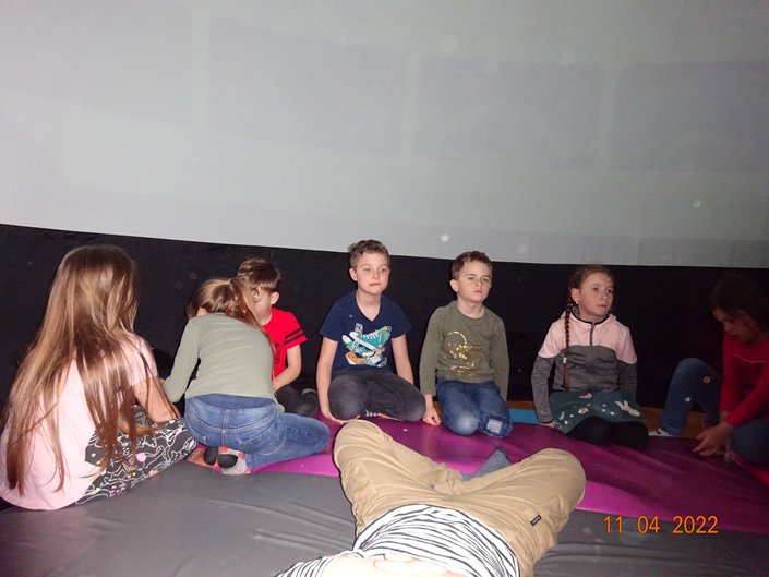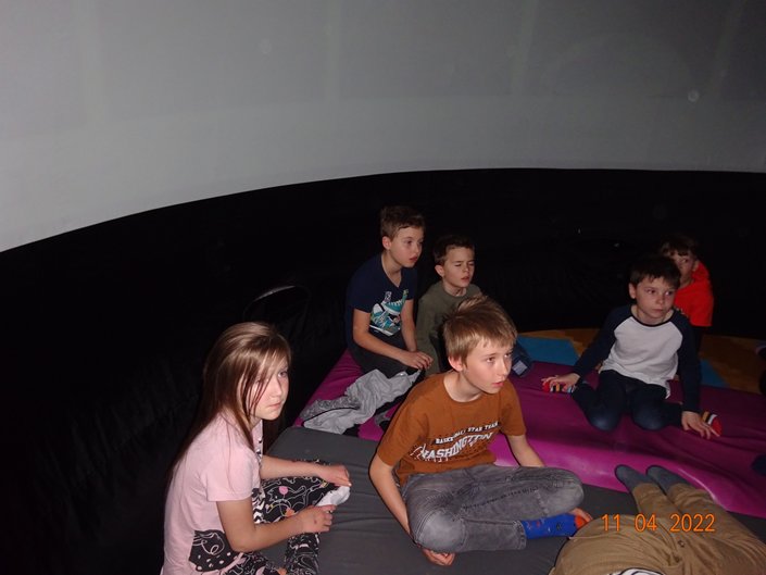 V pondělí 11. 4. 2022 naši školu navštívil pracovník mobilního planetária Mgr. Richard Štoudek, který v nafukovací kupolovité projekční ploše promítal dětem film Astronomie pro děti. Promítání doprovázel svým odborným a poutavým komentářem. Děti měly možnost seznámit se základními poznatky astronomie.