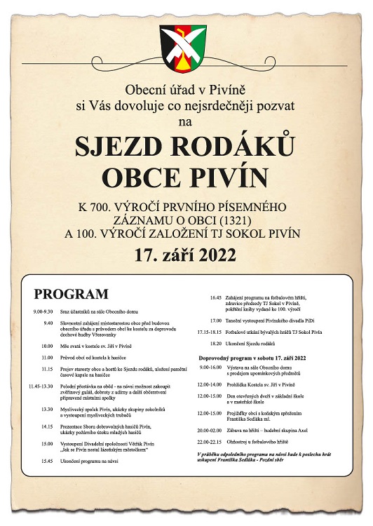 V sobotu 17. září 2022 se při příležitosti 700. výroční prvního písemného záznamu o obci (1321) a 100. výročí založení TJ Sokol Pivín konal Sjezd rodáků obce Pivín. Program slavnosti byl bohatý, jeho součástí byla v naší škole výstava dobových fotografií a výtvarných prací našich žáků.