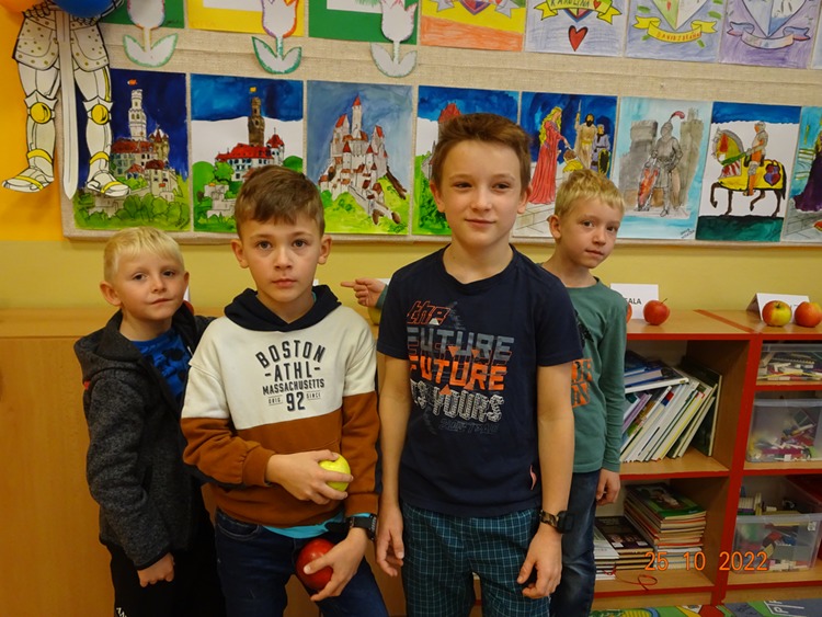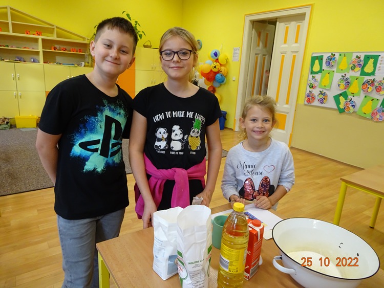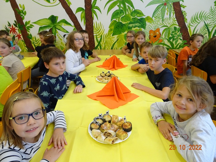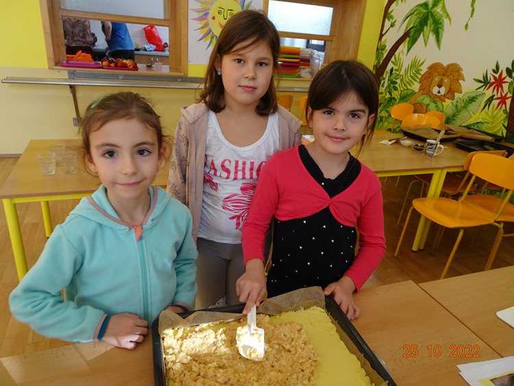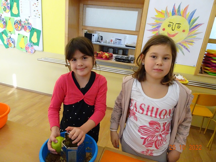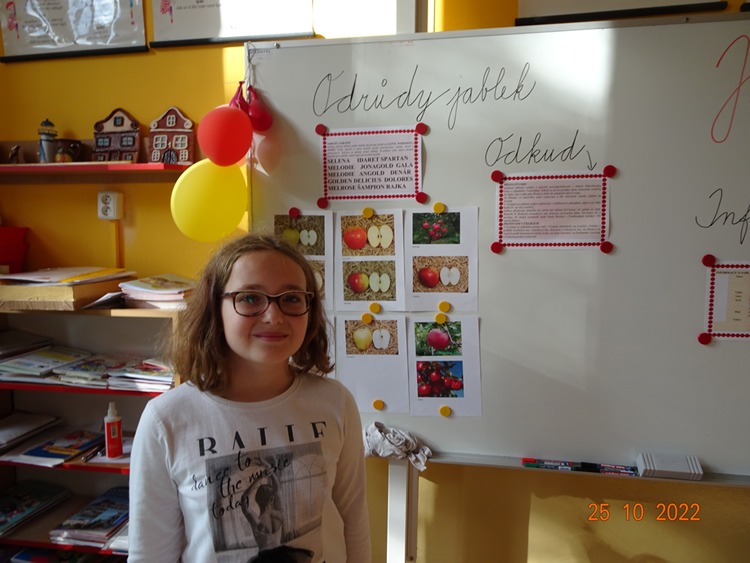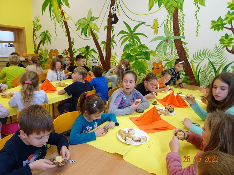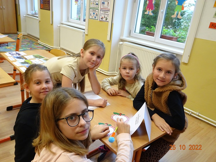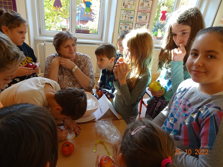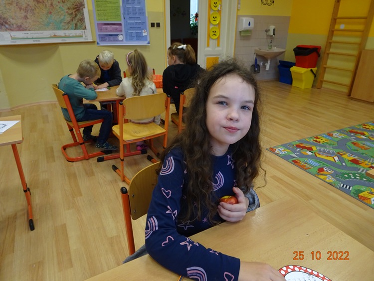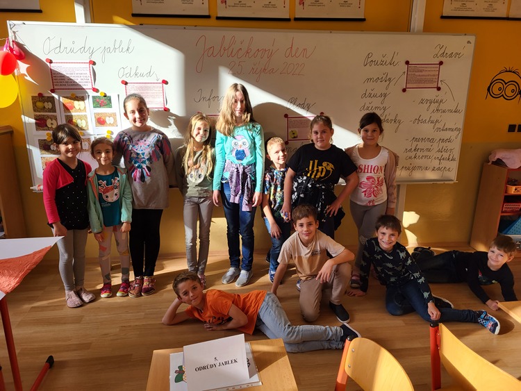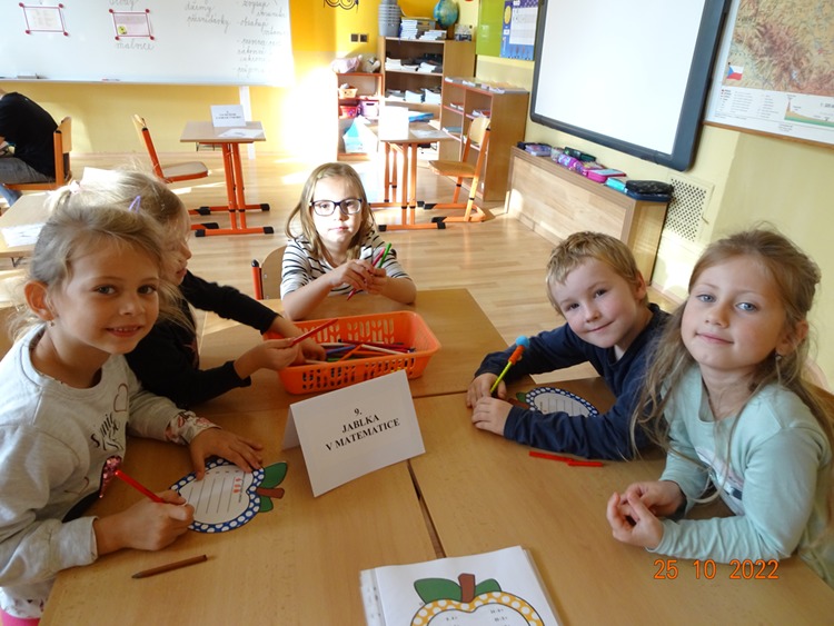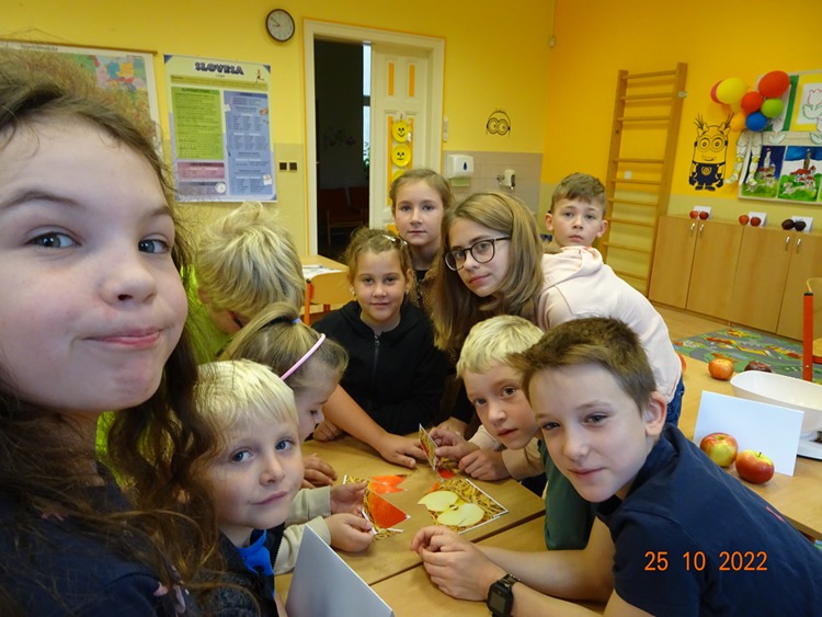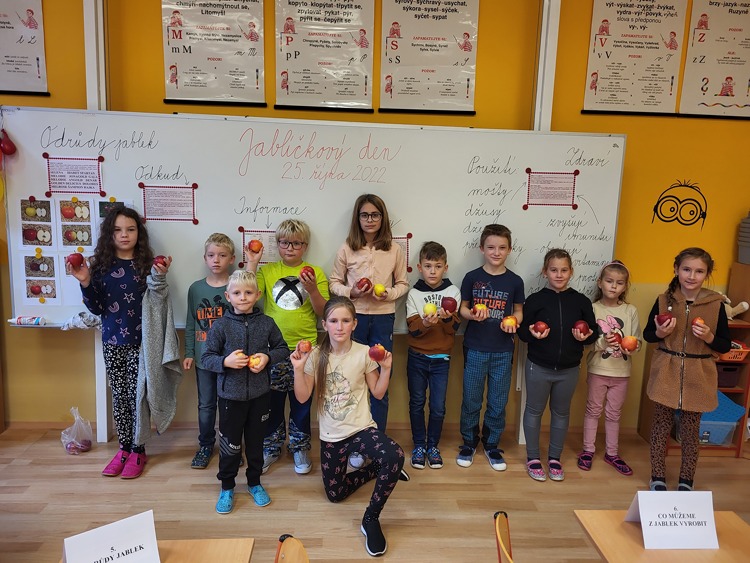 Na 1. stanovišti jsme měřili a vážili největší a nejmenší jablko, seznámili jsme se s různými odrůdami jabloní, s jejich pěstováním a využitím. Skládali jsme puzzle, vyhledávali informace a hádali hádanky. Na 2. stanovišti jsme výtvarně zpracovávali téma jablíček – malovali a lepili jsme jablíčka a na 3. stanovišti jsme pekli z jablíček různé dobroty – štrúdl, muffiny a hraběnčiny řezy. Na závěr jsme si prostřeli stůl a všechny dobroty jsme snědli. Jablíčkový den se nám vydařil.