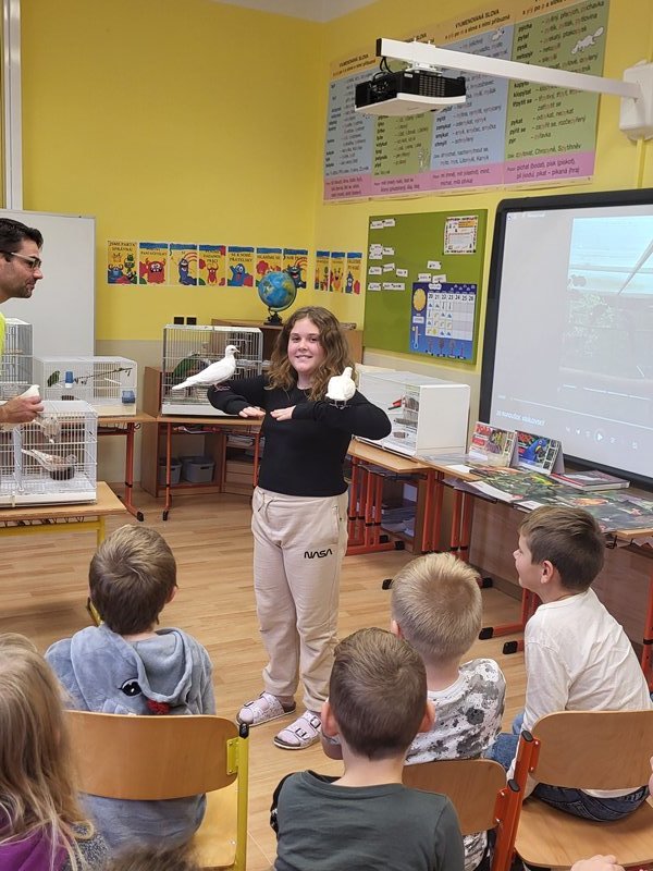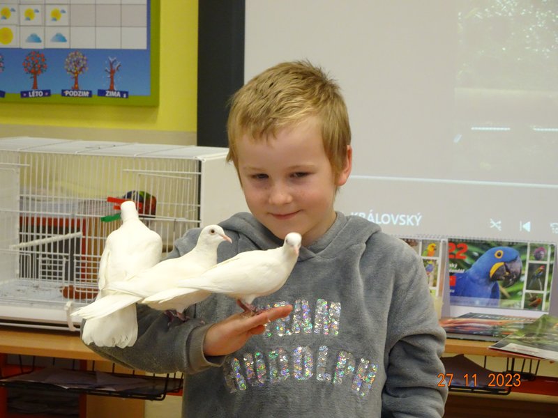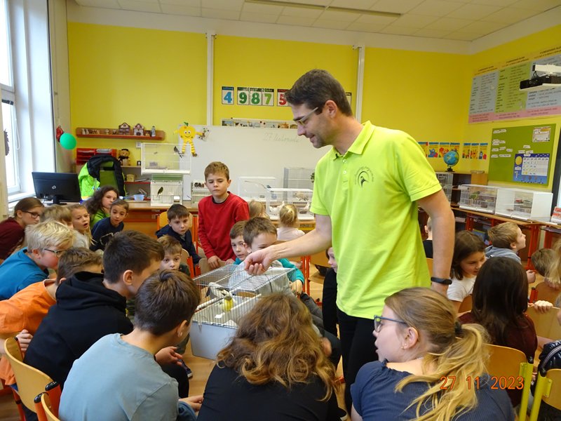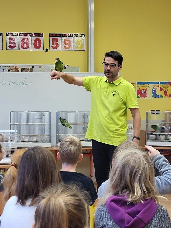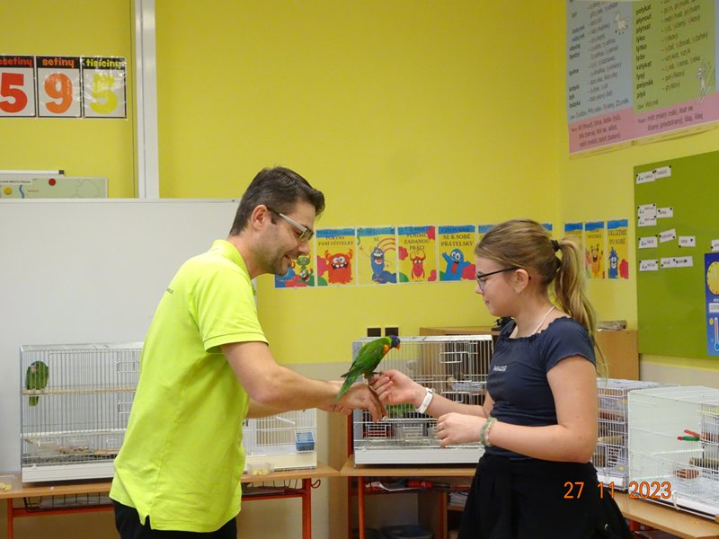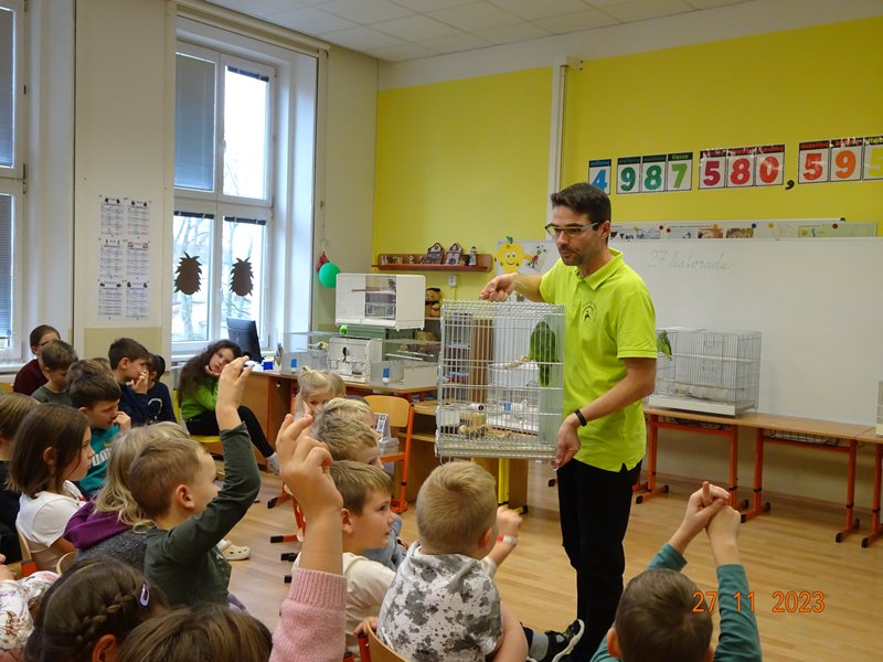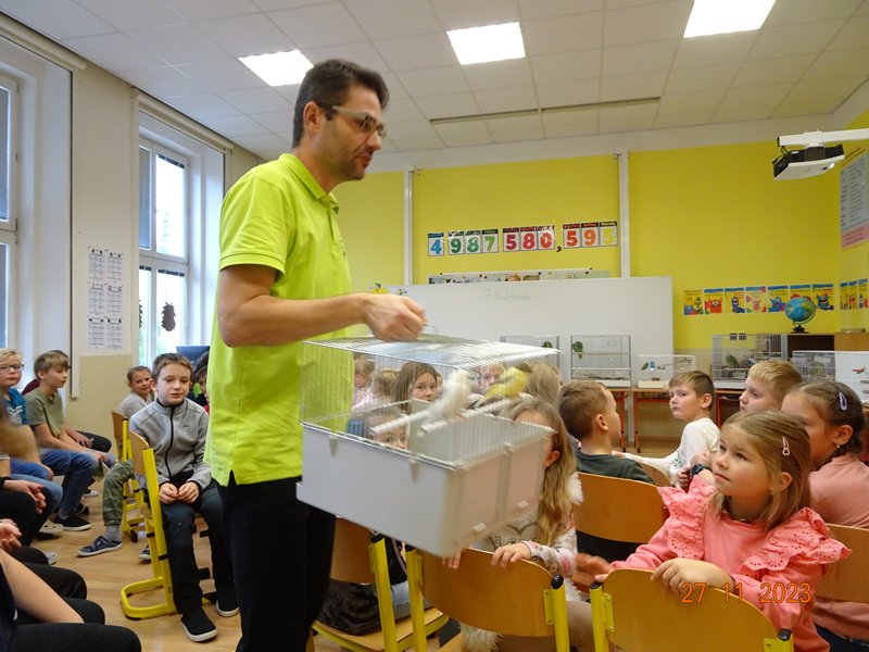 V pondělí 27. listopadu 2023 se uskutečnila pro žáky naší školy v pořadí již druhá zajímavá beseda „Od záchranných programů k chovatelství“, se kterým přišel do naší školy opět RNDr. Bc. Jaromír Vachutka, učitel, dlouholetý chovatel a držitel titulu Mistr Evropy a bronzové medaile z Mistrovství světa se svými opeřenci.