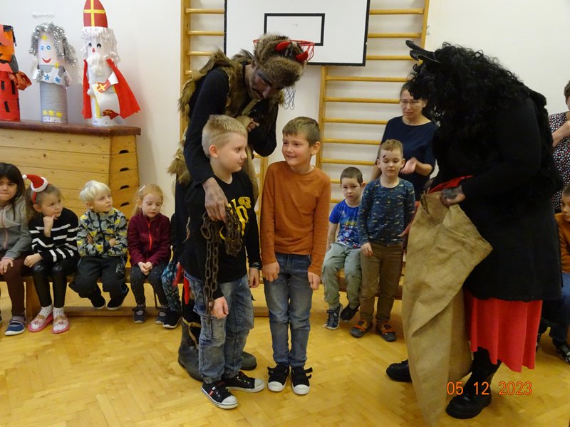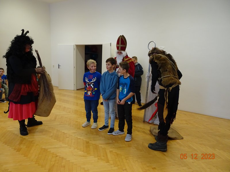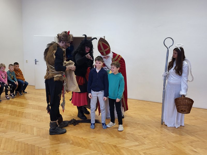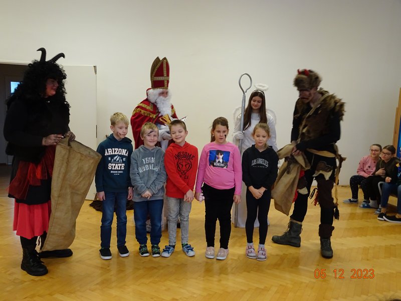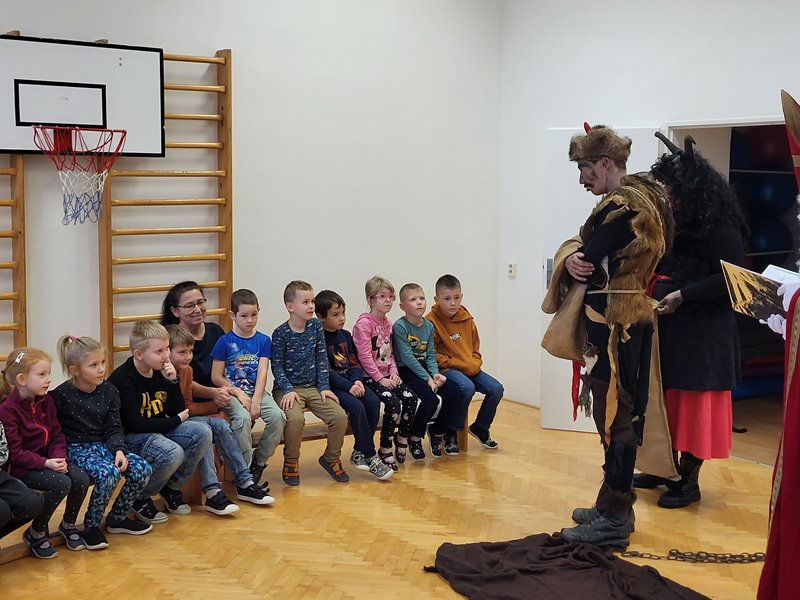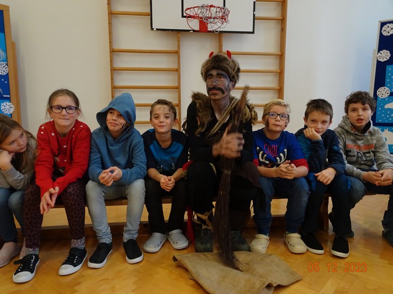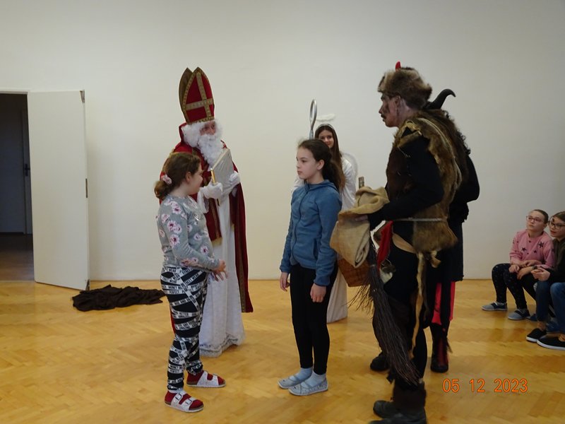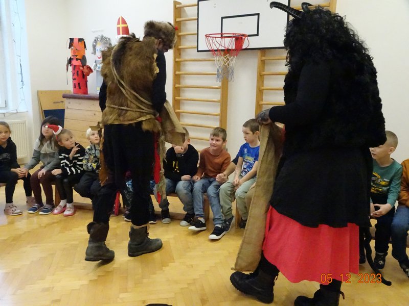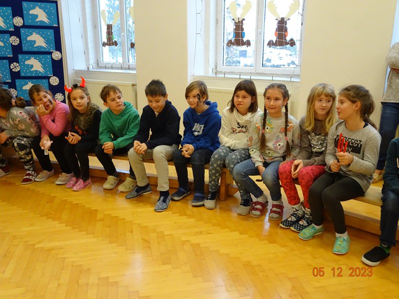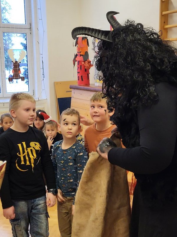 V úterý 5. prosince 2023 navštívil naši školu svatý Mikuláš se svojí družinou – čertem, čerticí a andílkem. Ve své svaté knize měl Mikuláš poznamenané naše hodné i zlobivé žáky.  Hodné žáky andílek odměňoval sladkostmi, zlobiví žáci dostali od čerta metličkou a na tvář černé znamení.