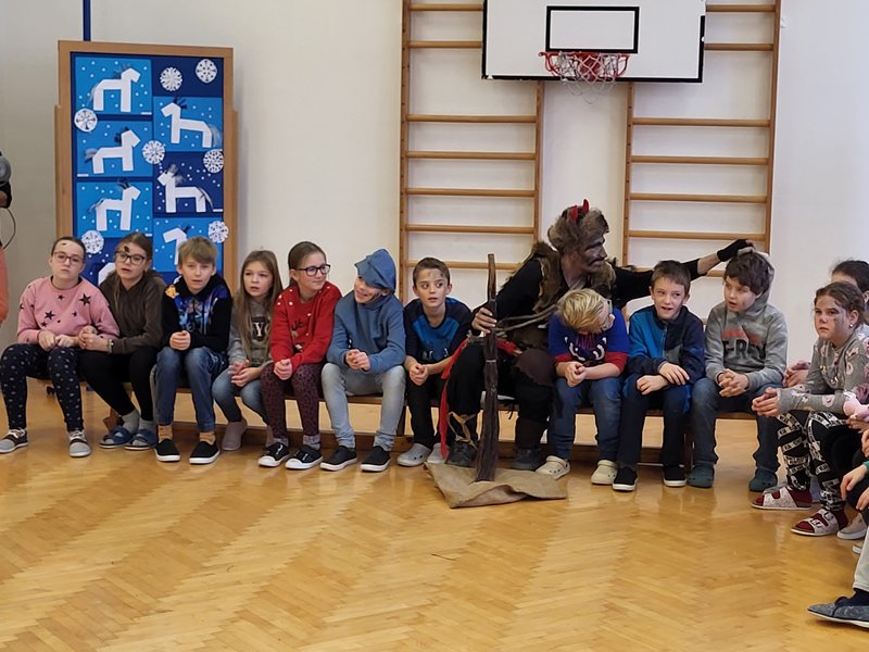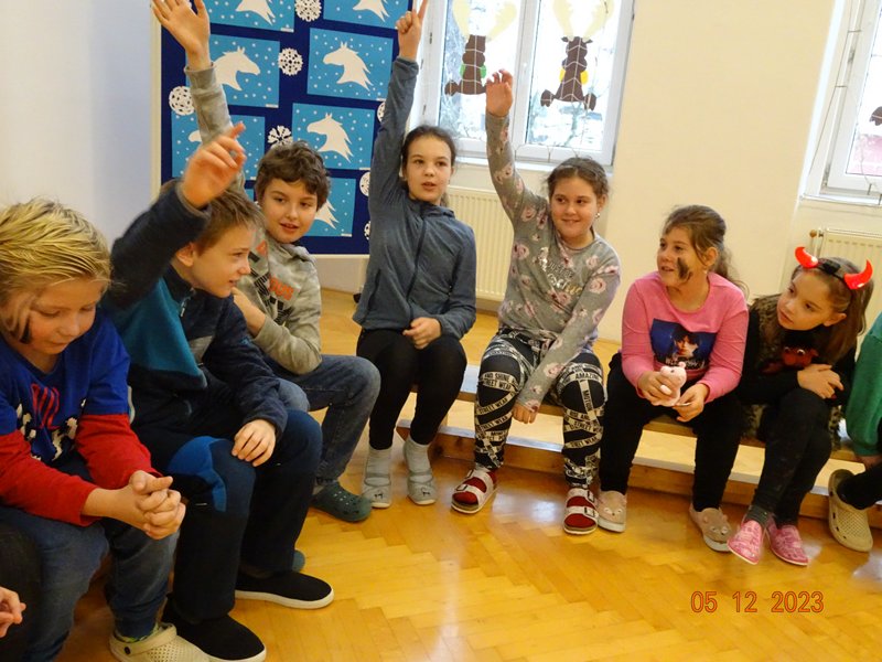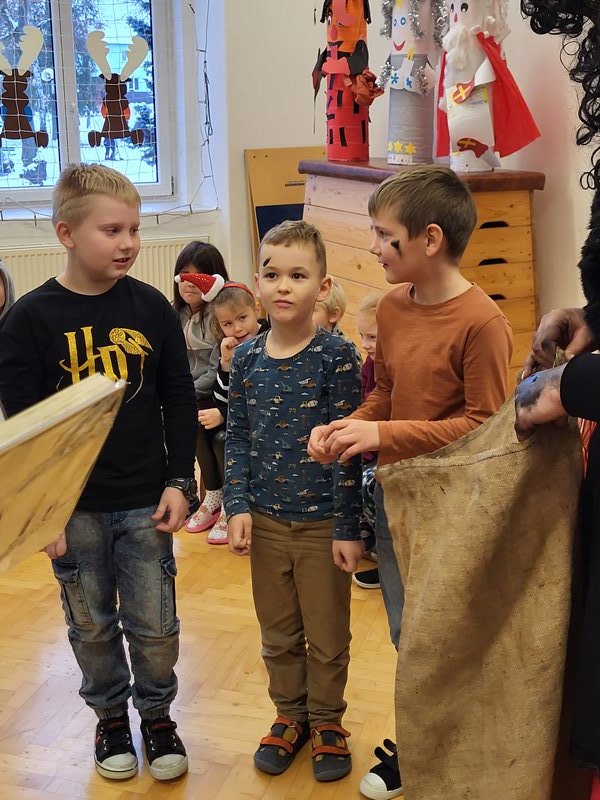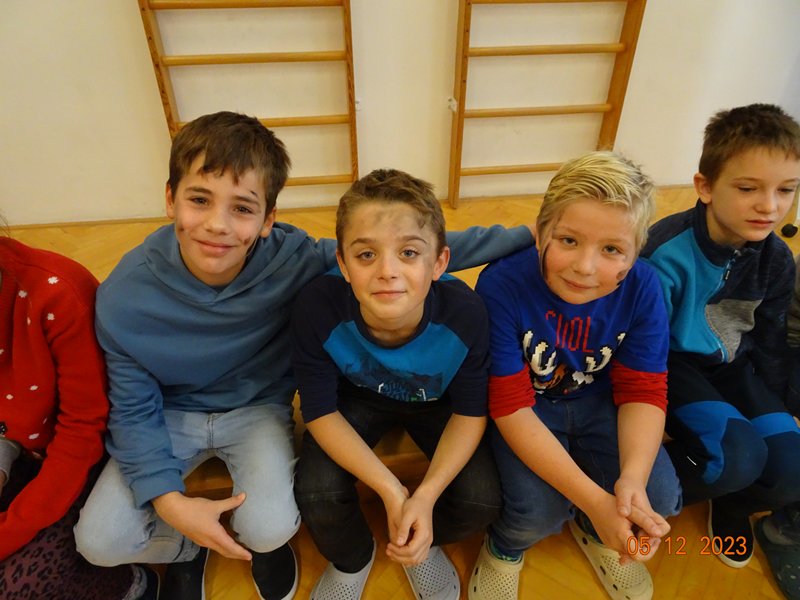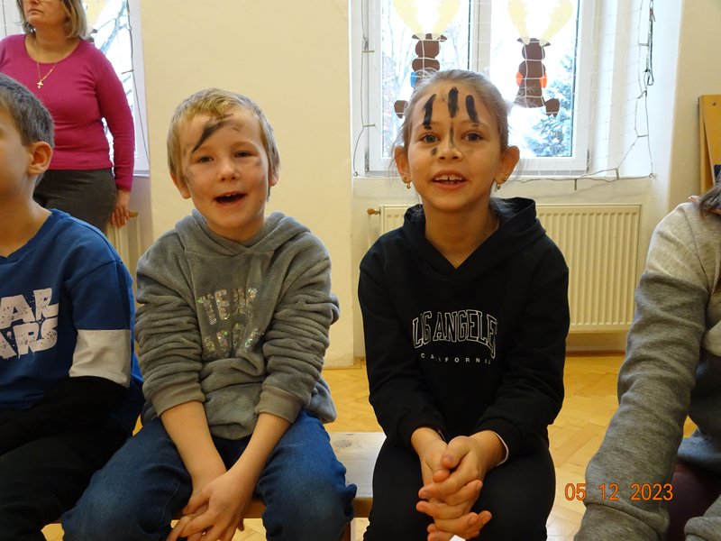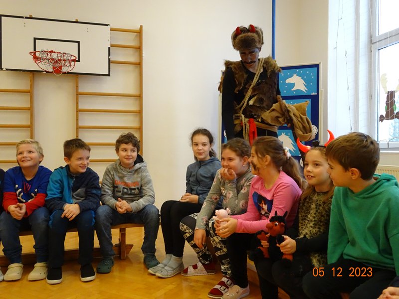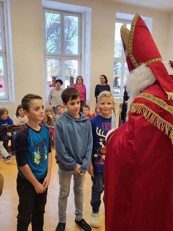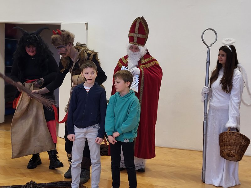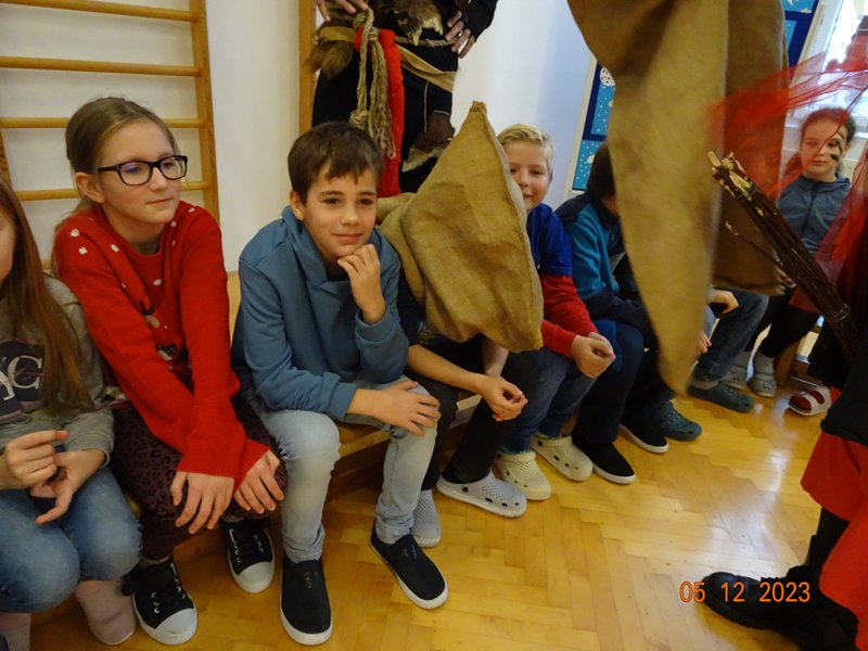V úterý 5. prosince 2023 navštívil naši školu svatý Mikuláš se svojí družinou – čertem, čerticí a andílkem. Ve své svaté knize měl Mikuláš poznamenané naše hodné i zlobivé žáky.  Hodné žáky andílek odměňoval sladkostmi, zlobiví žáci dostali od čerta metličkou a na tvář černé znamení.