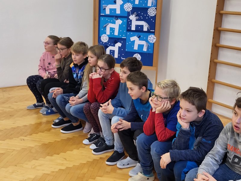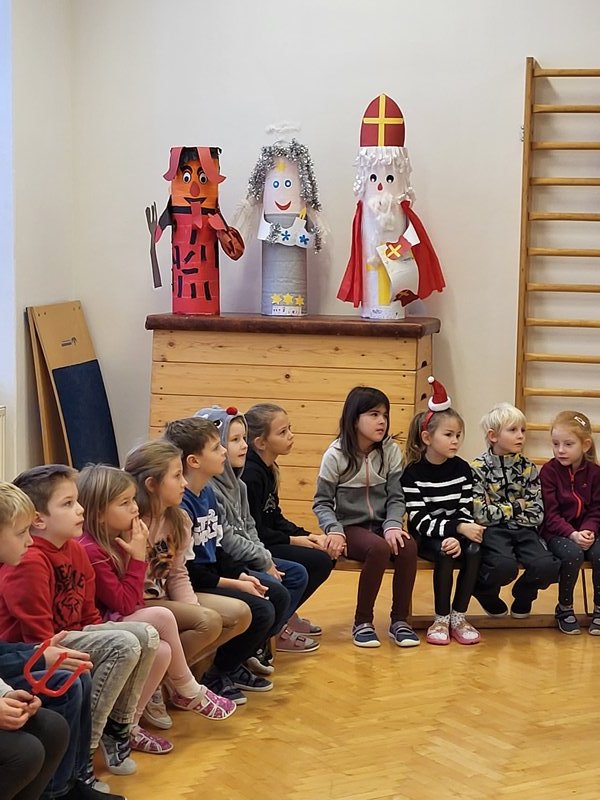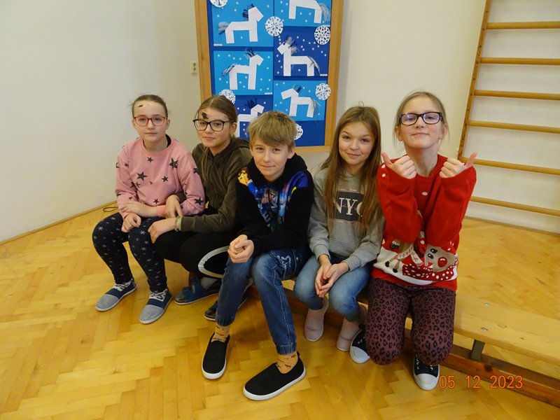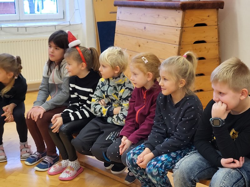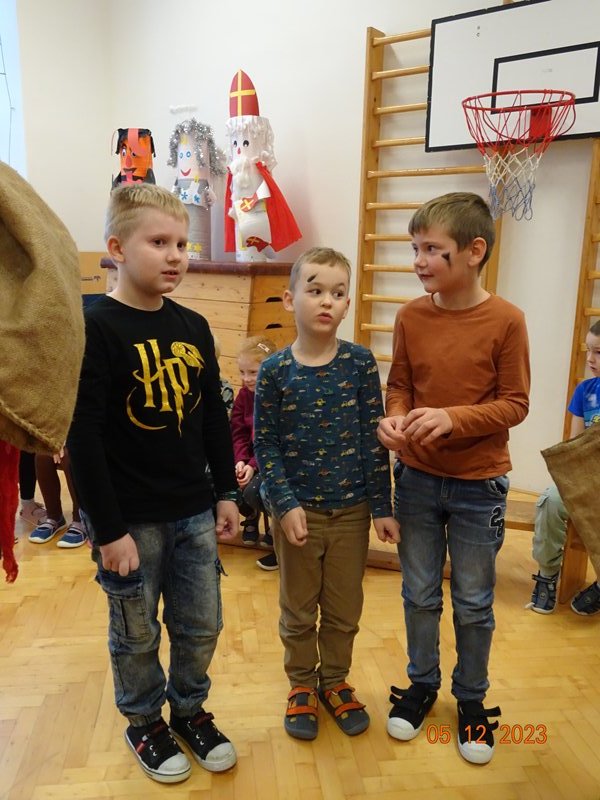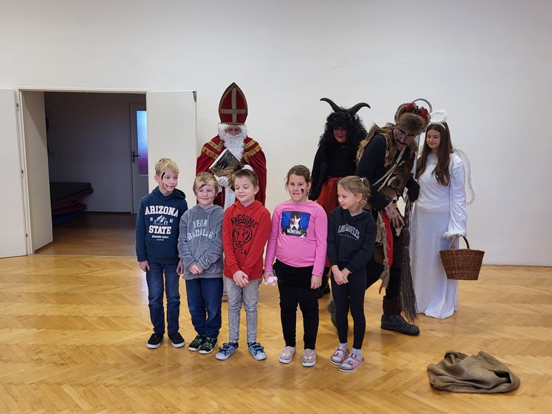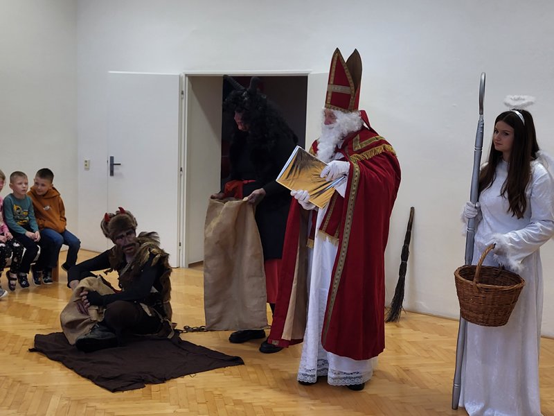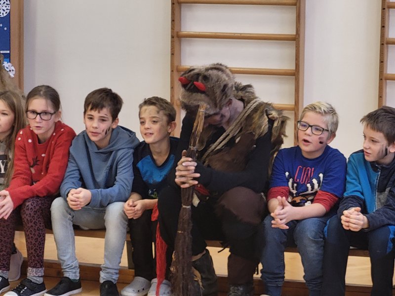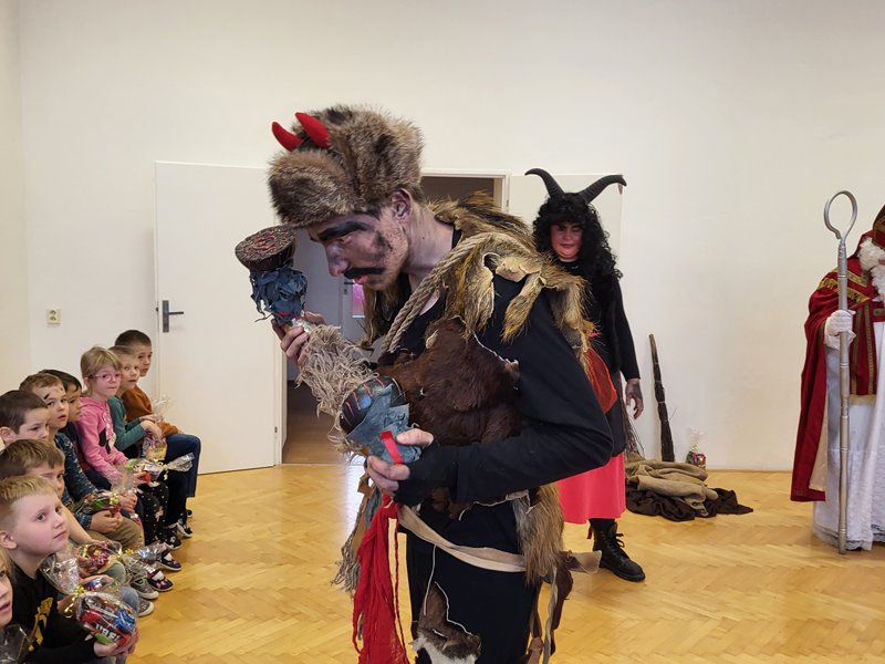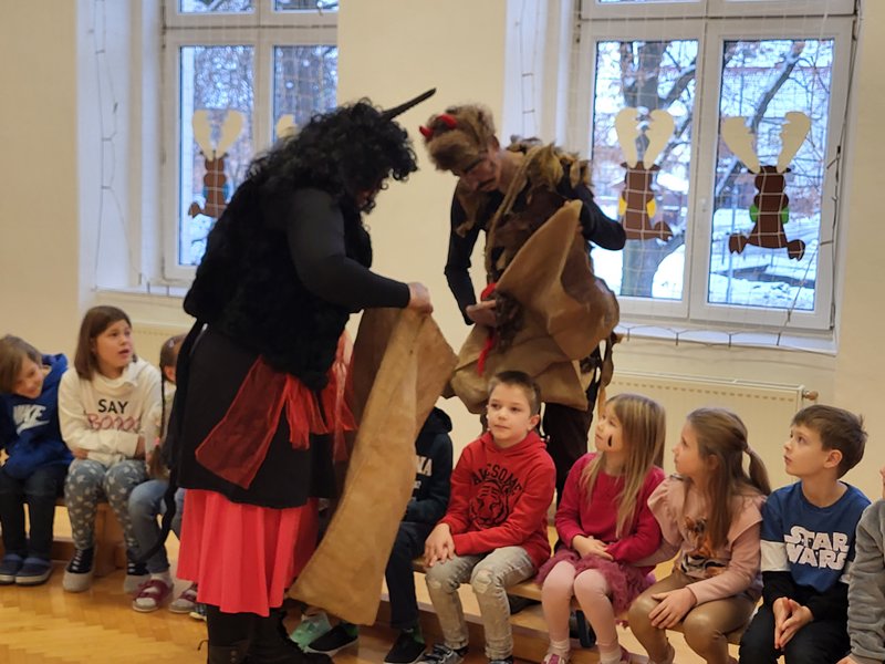 V úterý 5. prosince 2023 navštívil naši školu svatý Mikuláš se svojí družinou – čertem, čerticí a andílkem. Ve své svaté knize měl Mikuláš poznamenané naše hodné i zlobivé žáky.  Hodné žáky andílek odměňoval sladkostmi, zlobiví žáci dostali od čerta metličkou a na tvář černé znamení.