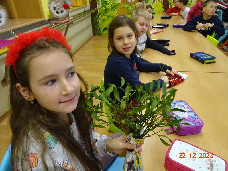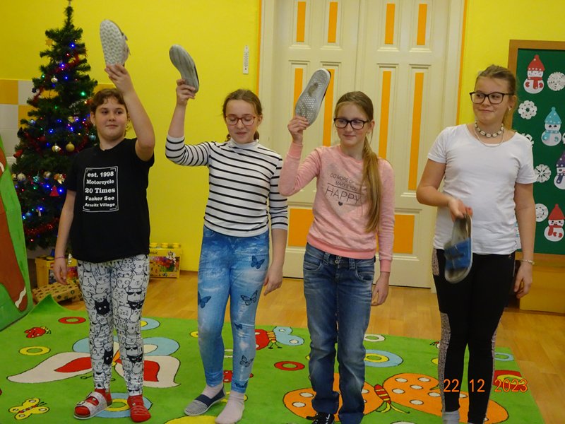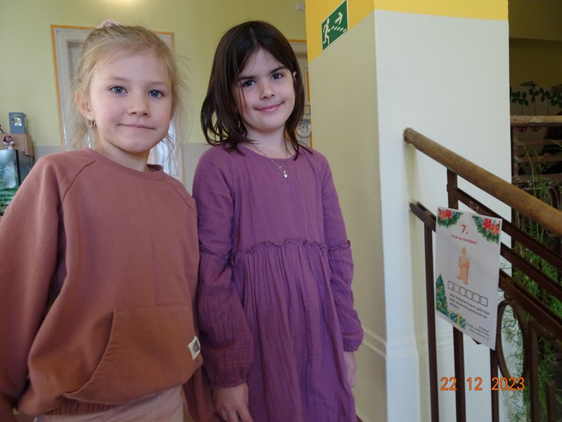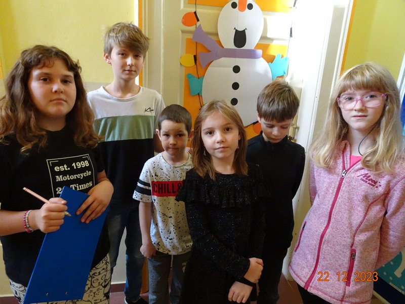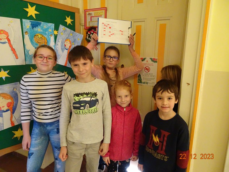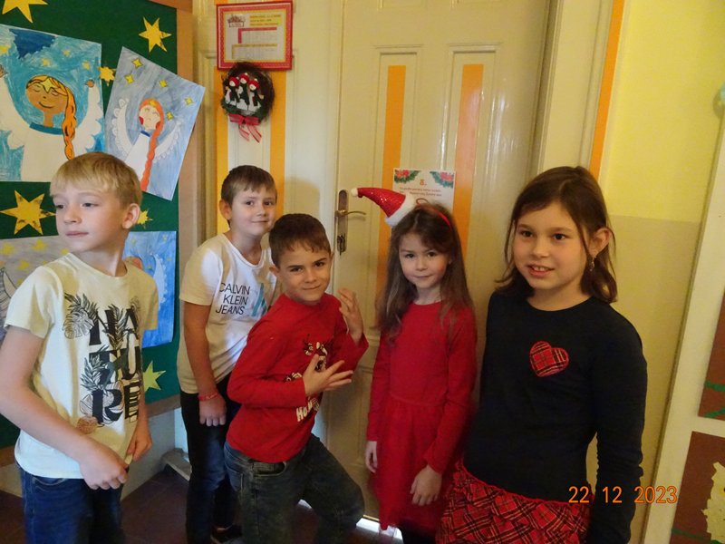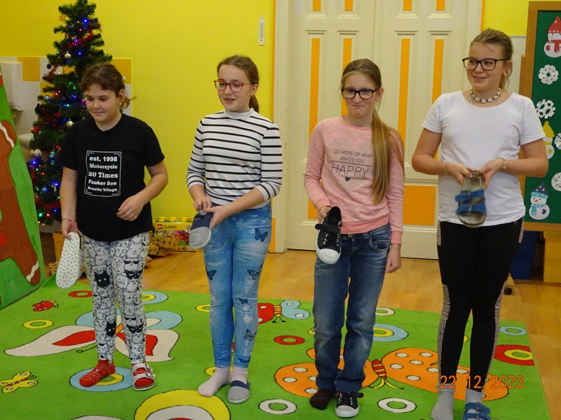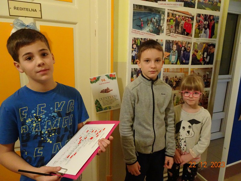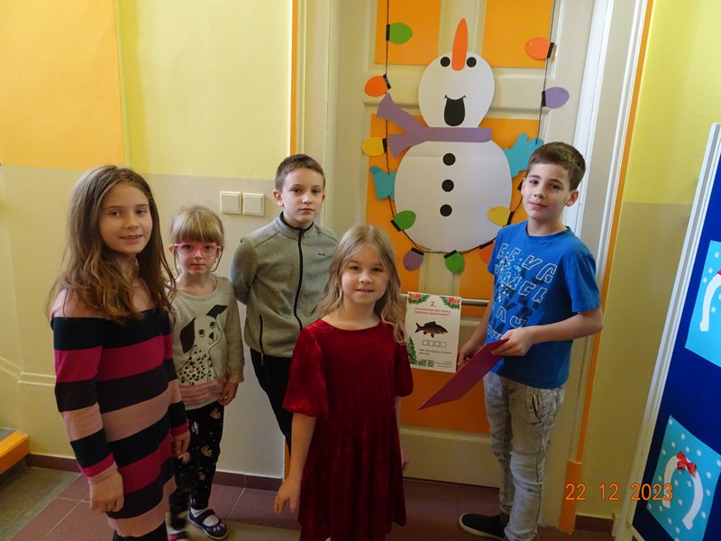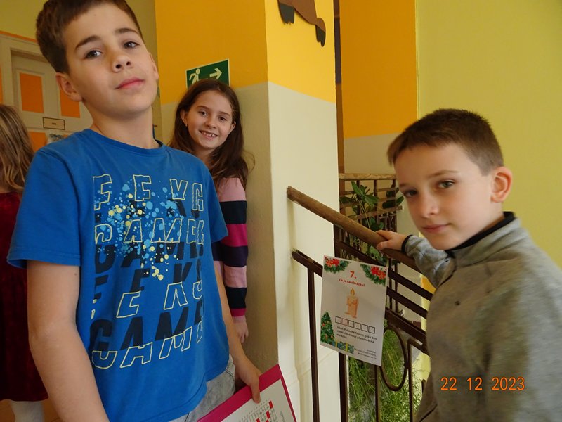 V pátek 22. prosince 2023, poslední školní den před vánočními prázdninami, jsme si udělali v naší škole vánoční oslavu. Na začátku jsme si popovídali o vánočních svátcích a připomněli si některé vánoční zvyky – zavěšování jmelí, rozkrajování jablíčka, pouštění lodiček a děvčata z 5. ročníku házela pantoflem.
