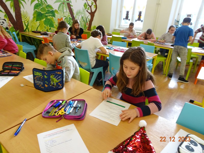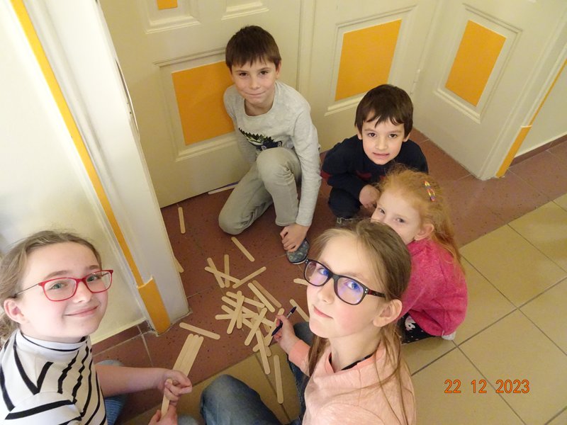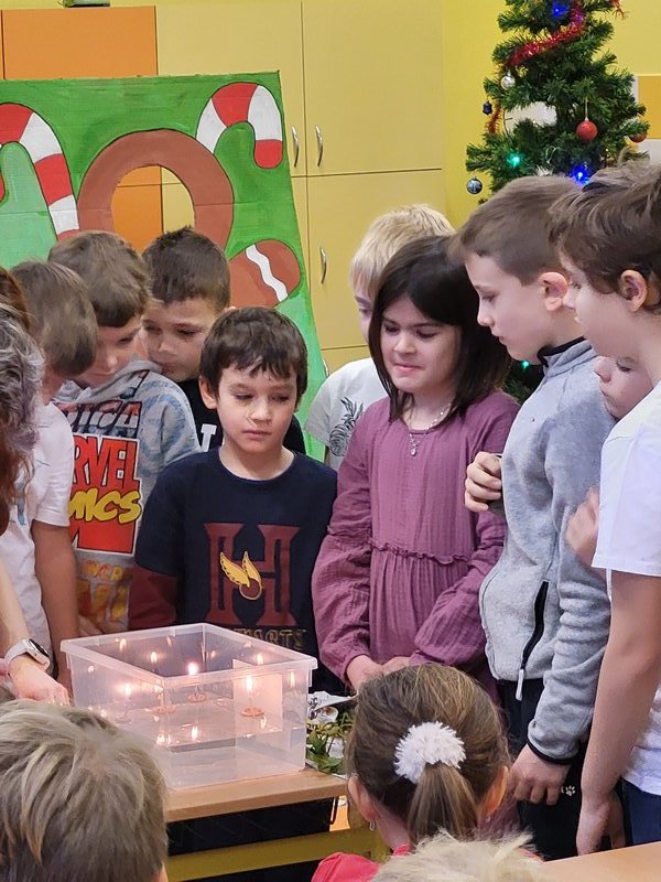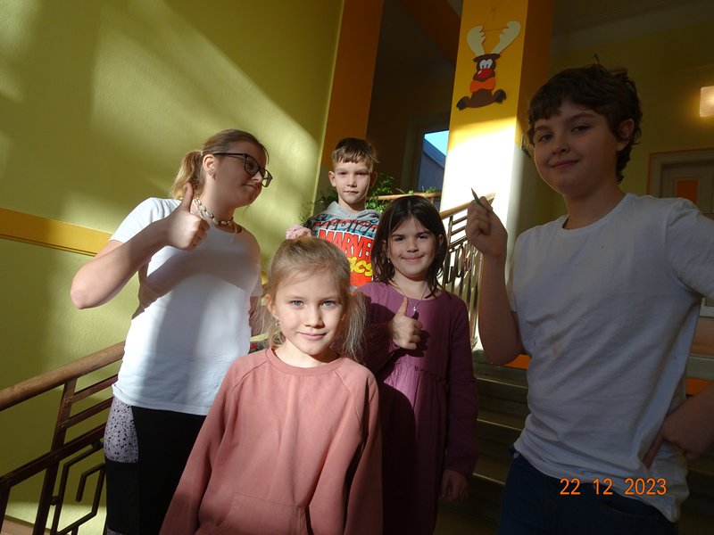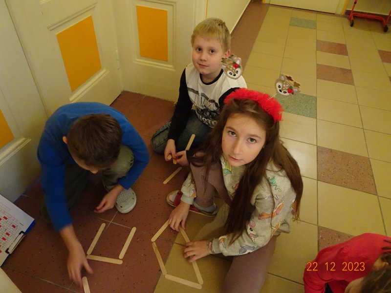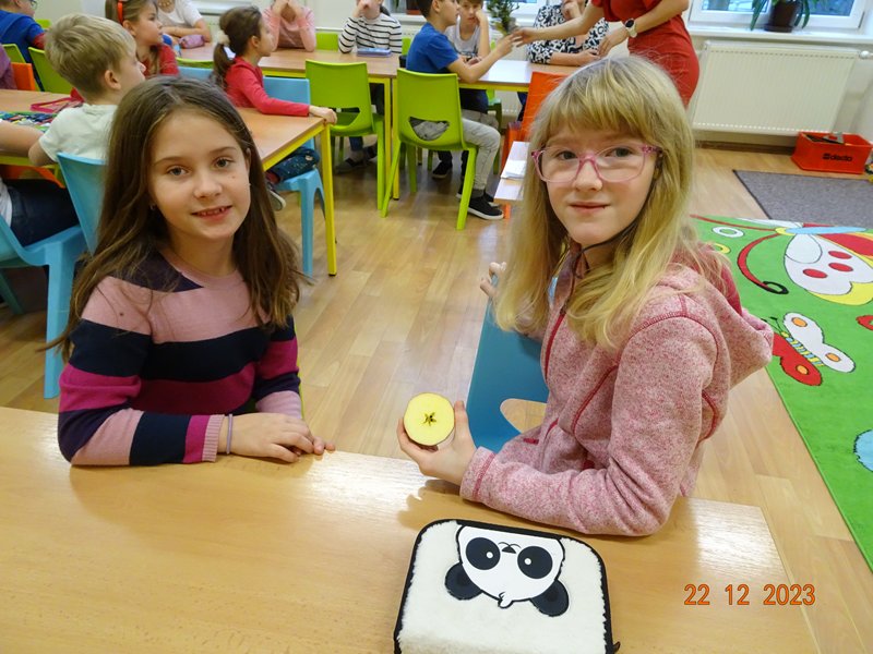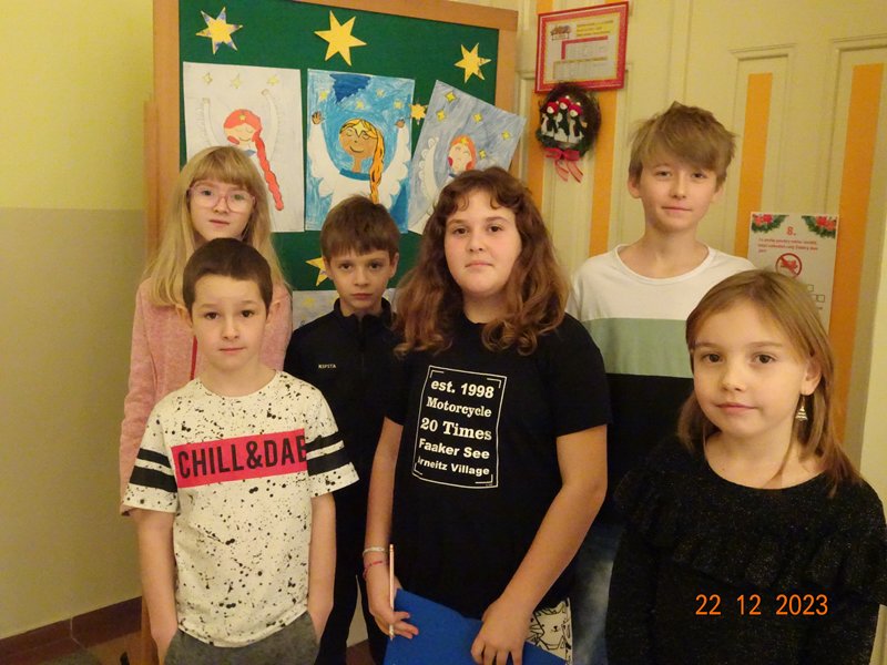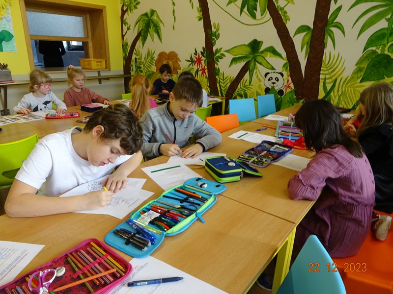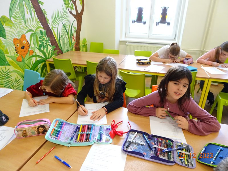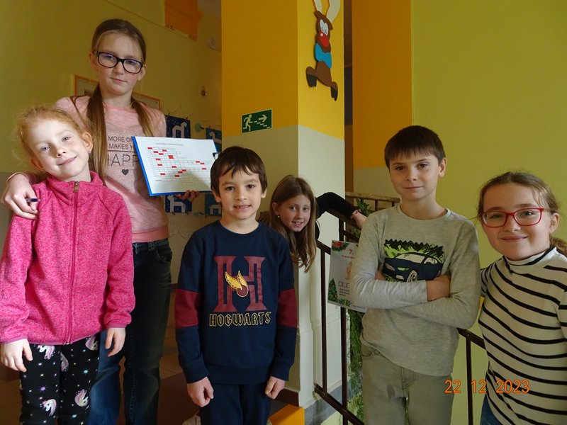 V pátek 22. prosince 2023, poslední školní den před vánočními prázdninami, jsme si udělali v naší škole vánoční oslavu. Na začátku jsme si popovídali o vánočních svátcích a připomněli si některé vánoční zvyky – zavěšování jmelí, rozkrajování jablíčka, pouštění lodiček a děvčata z 5. ročníku házela pantoflem.