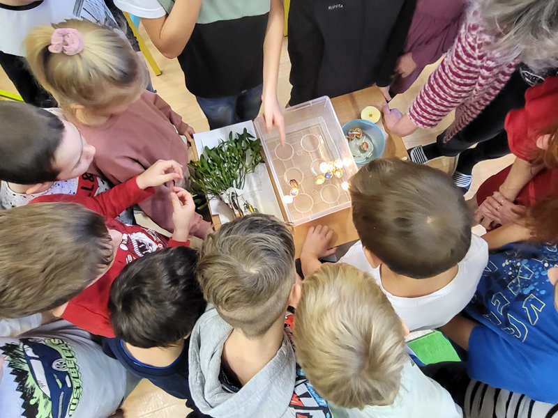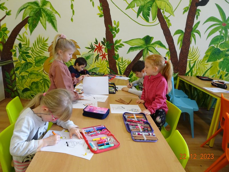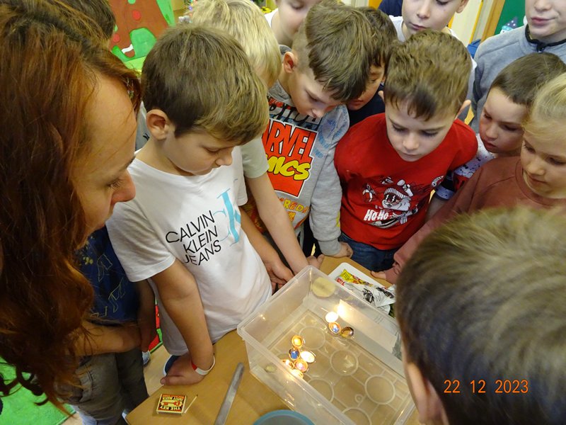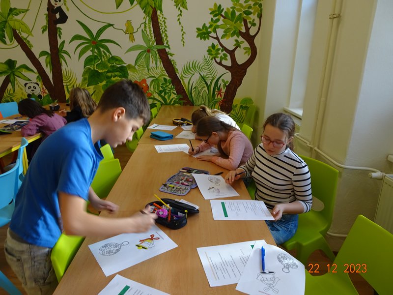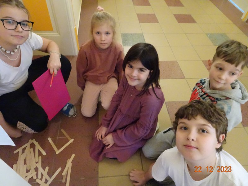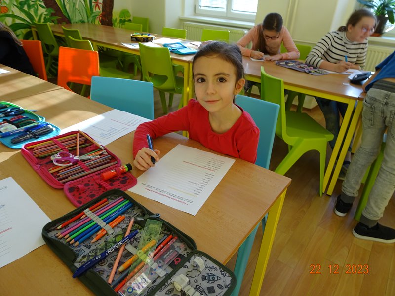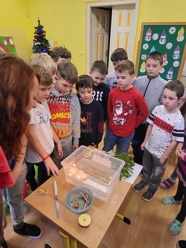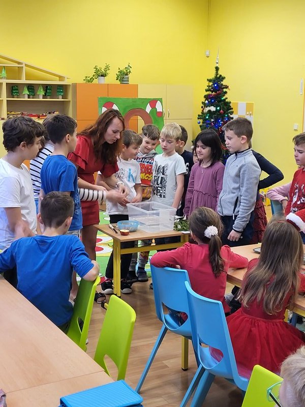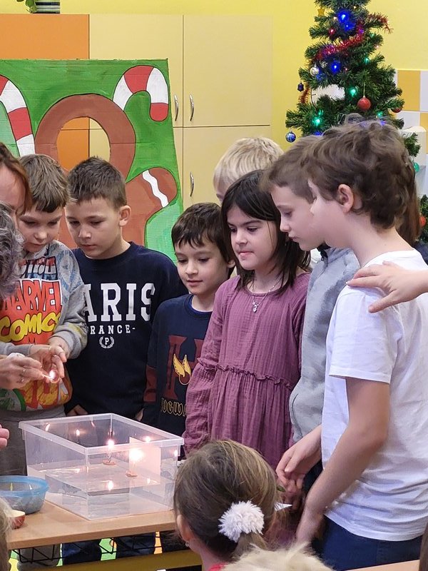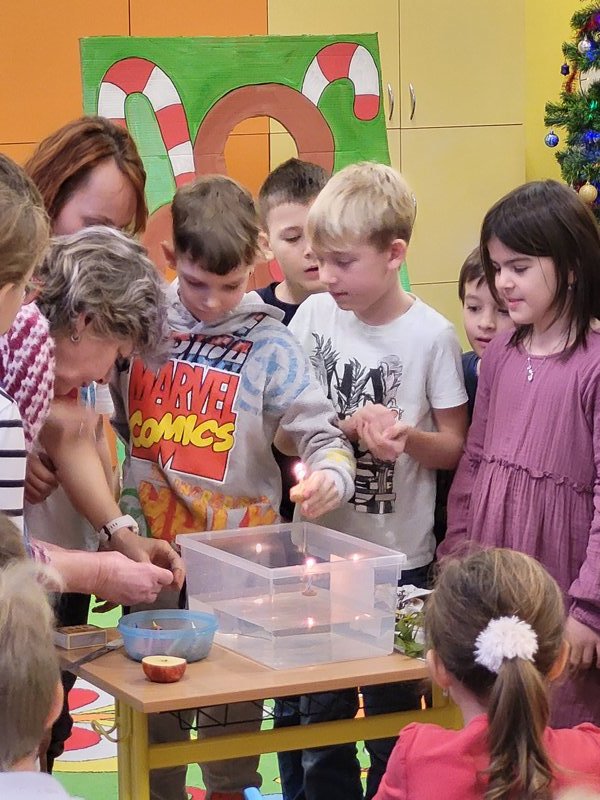 V pátek 22. prosince 2023, poslední školní den před vánočními prázdninami, jsme si udělali v naší škole vánoční oslavu. Na začátku jsme si popovídali o vánočních svátcích a připomněli si některé vánoční zvyky – zavěšování jmelí, rozkrajování jablíčka, pouštění lodiček a děvčata z 5. ročníku házela pantoflem.
