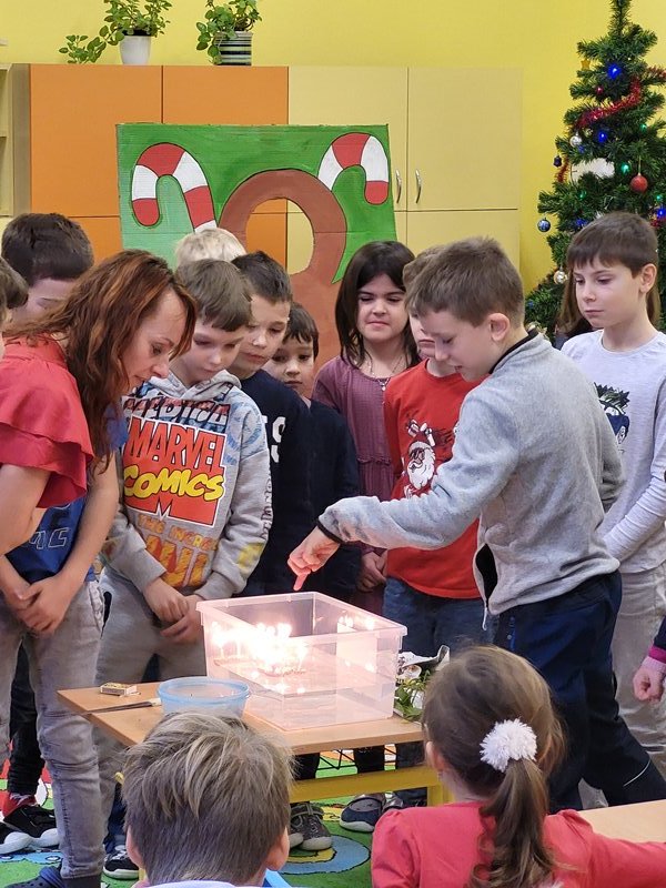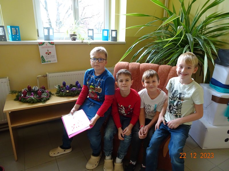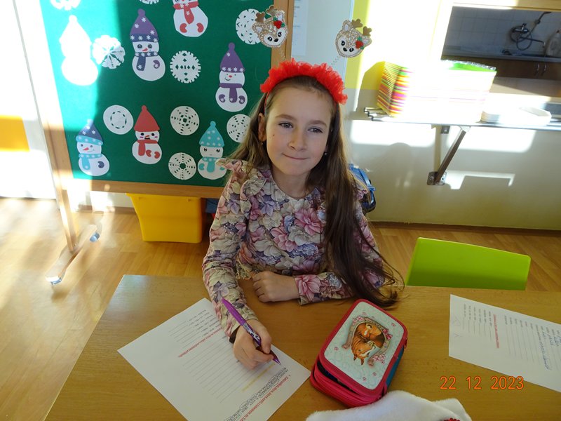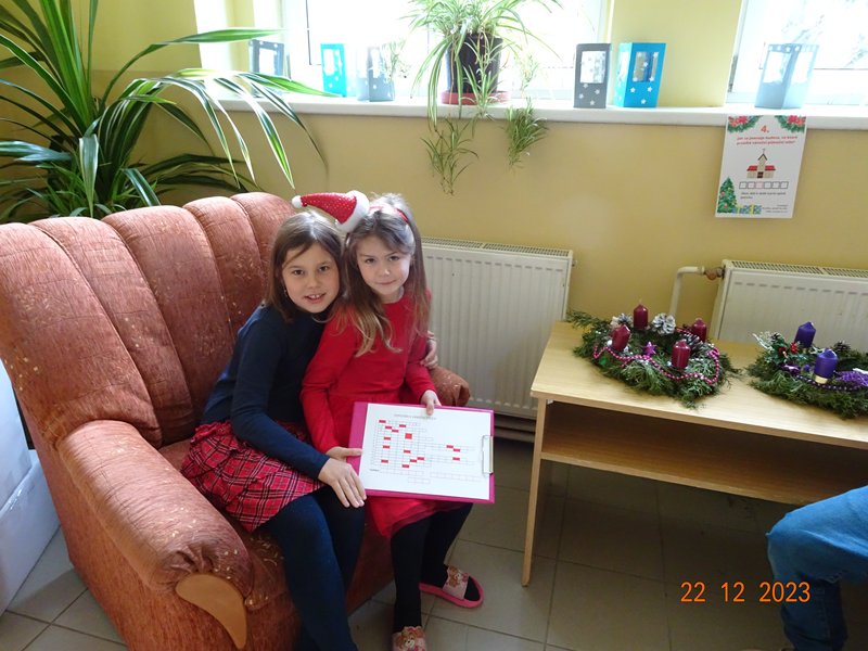 Potom nás čekala vánoční stezka školou, při které jsme plnili vánoční úkoly. Po rozbalení dárků, které jsme našli v jídelně pod stromečkem, jsme se rozešli do svých tříd, kde jsme si vyměnili dárky se svými kamarády a pak už na nás čekal vánoční film. Předvánoční den jsme si příjemně užili.