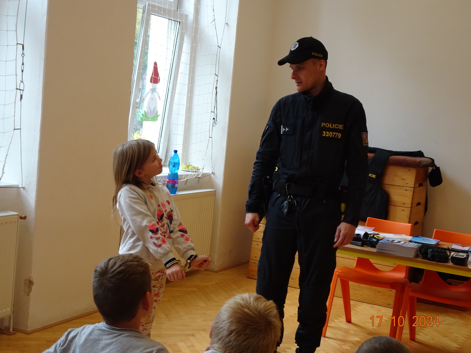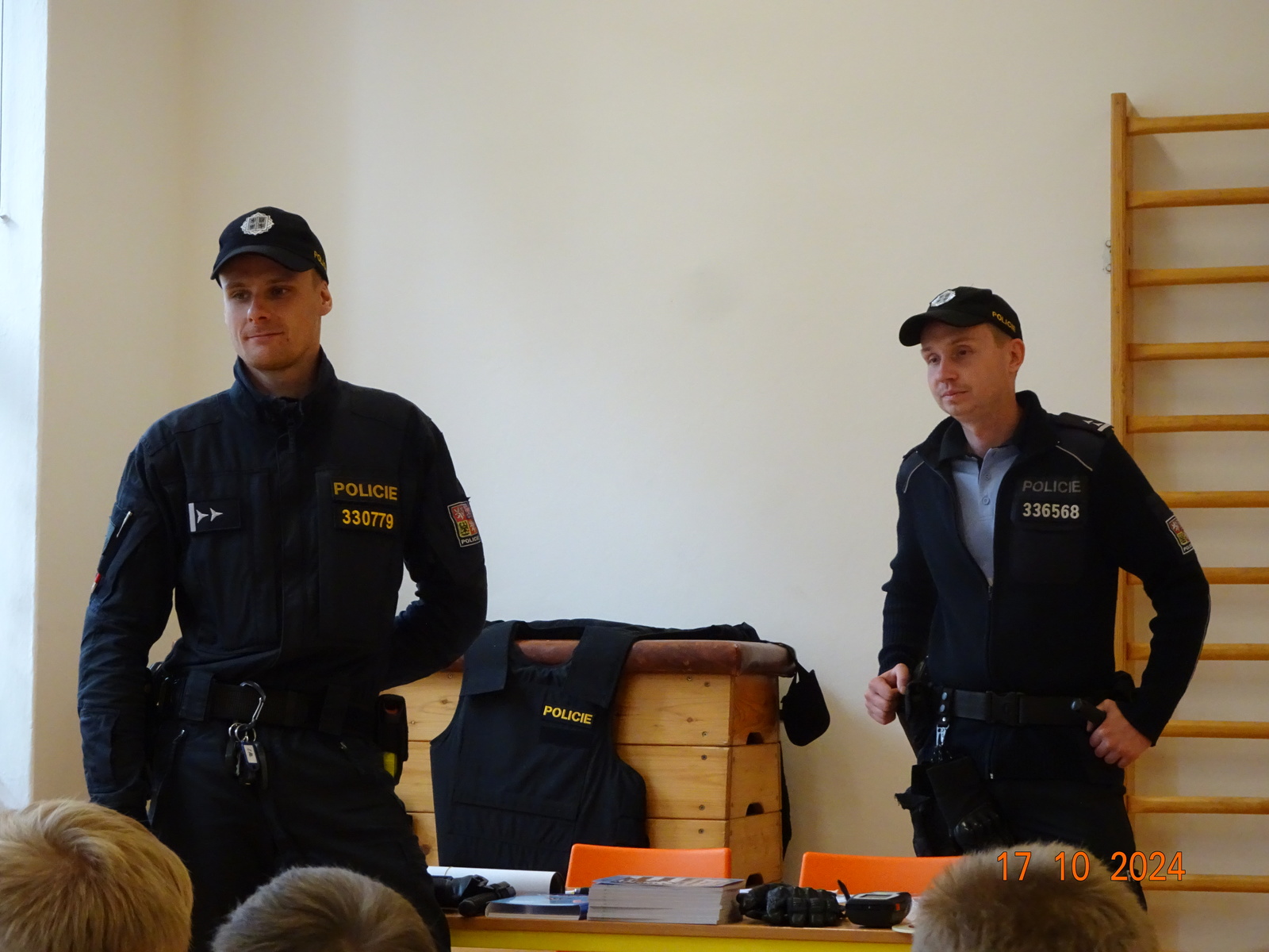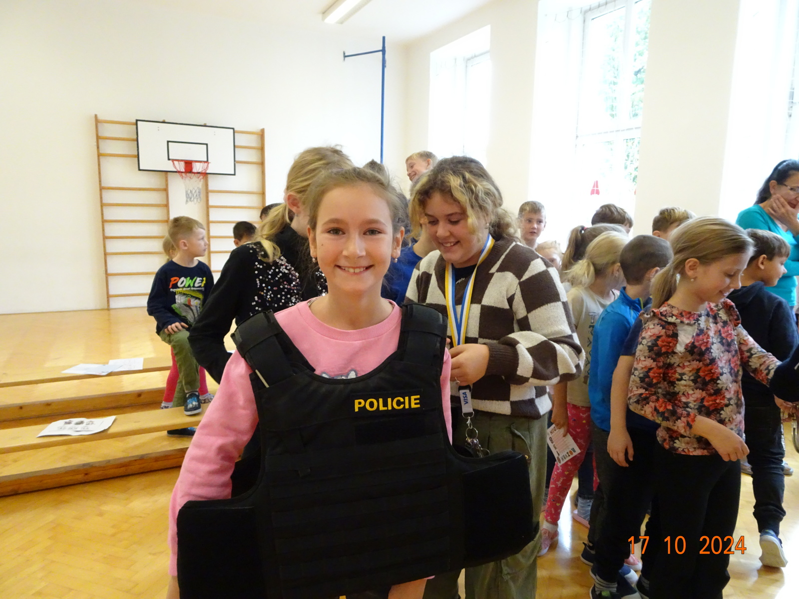 Součásti týdne bezpečí byla také přednáška Policie ČR zaměřená na bezpečnost a chování v silničním provozu, ale také při využívání internetu. Děti byly nadšené, že si mohly vyzkoušet policejní vesty nebo pouta. Na závěr si mohly prohlédnout i policejní služební vůz.