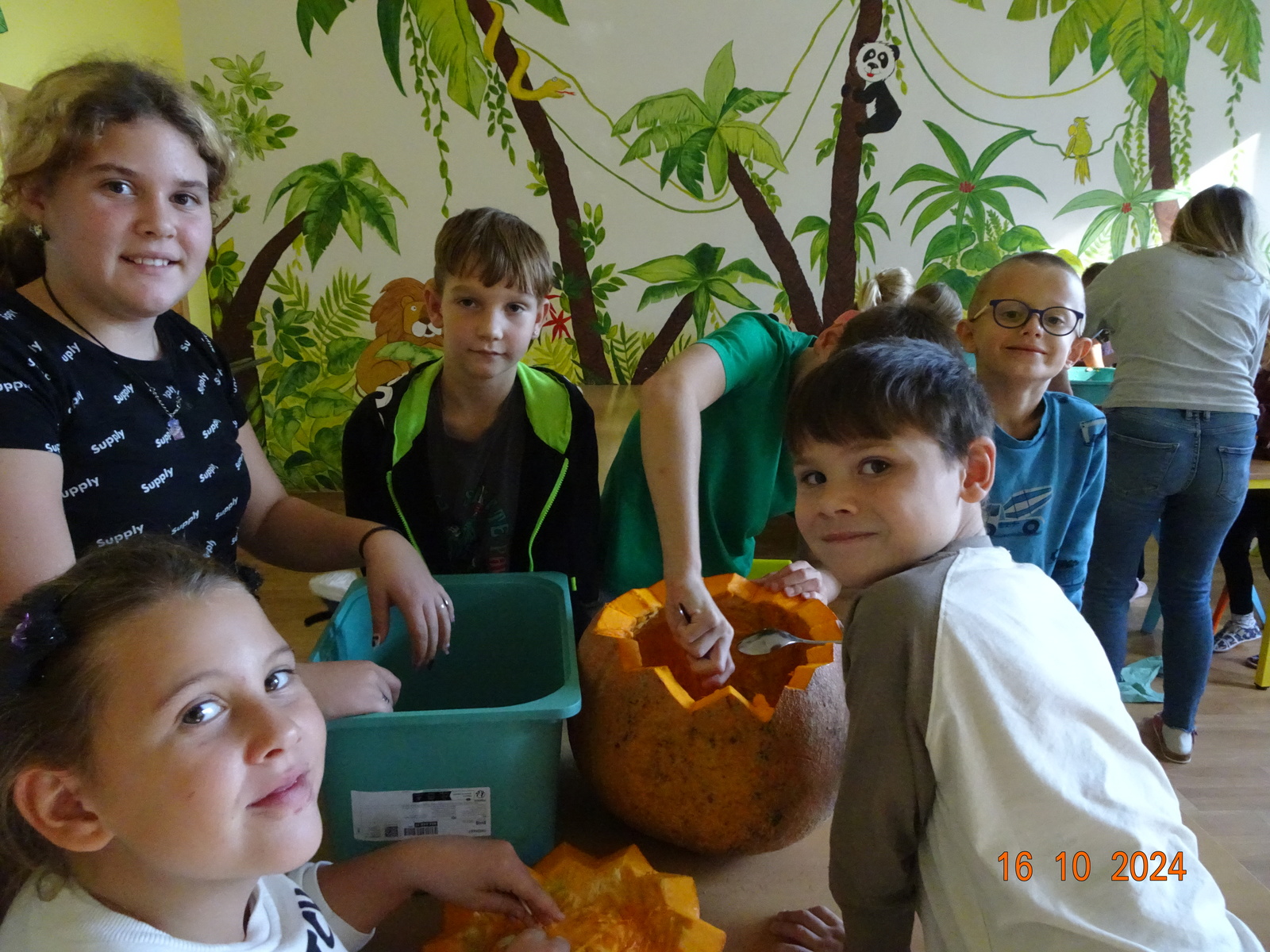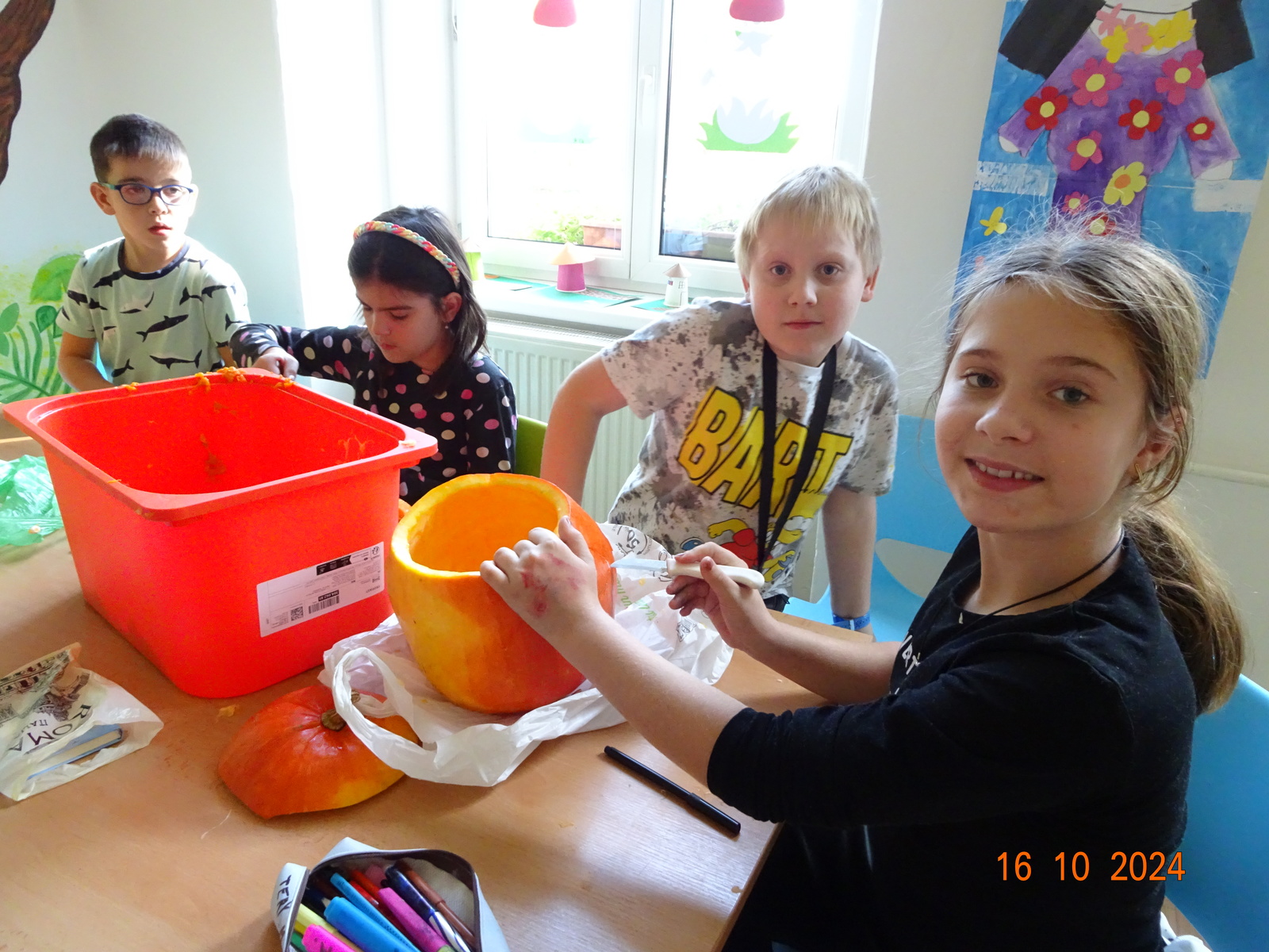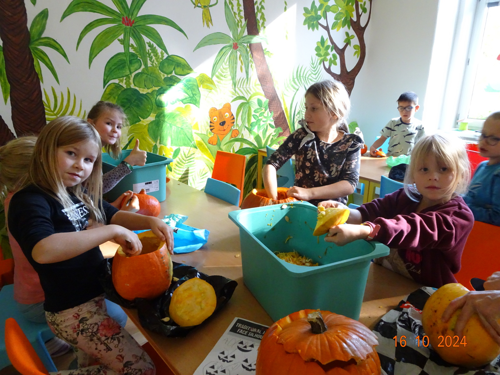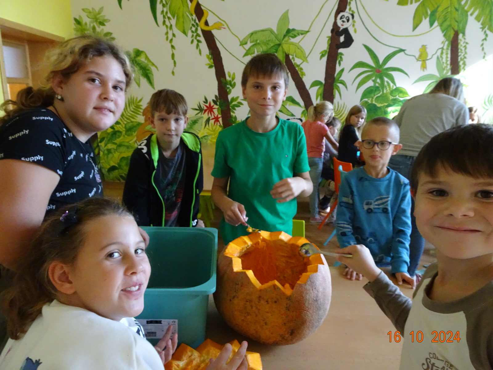Ve středu 16. října jsme zahájili halloweenské těšení. Nejprve se děti bavily při družinovém "dýňování". Přinesli jsme si dýně všech možných tvarů, barev a velikostí a společně jsme si vydlabali a vyřezali strašidelné dýňáky.