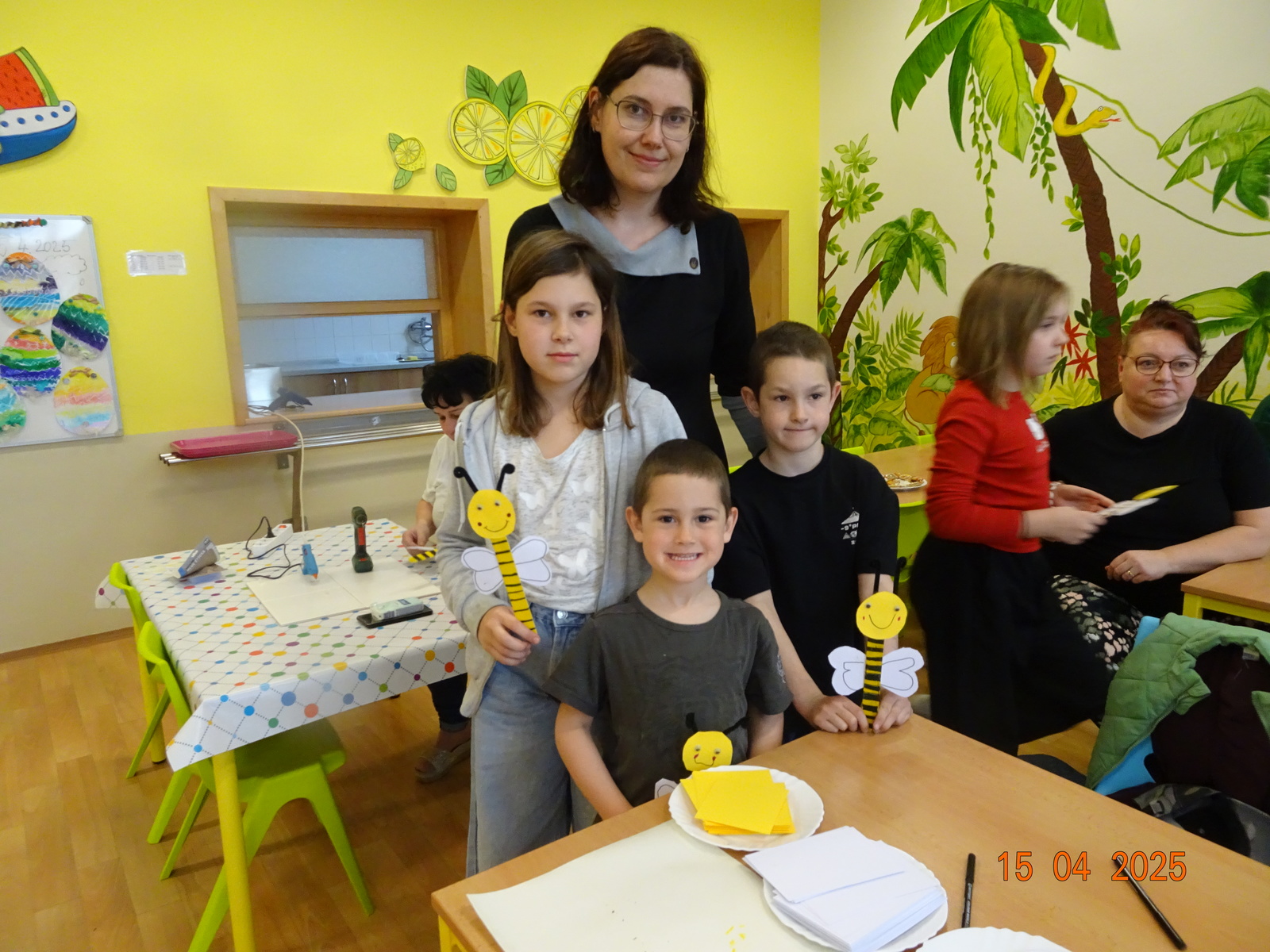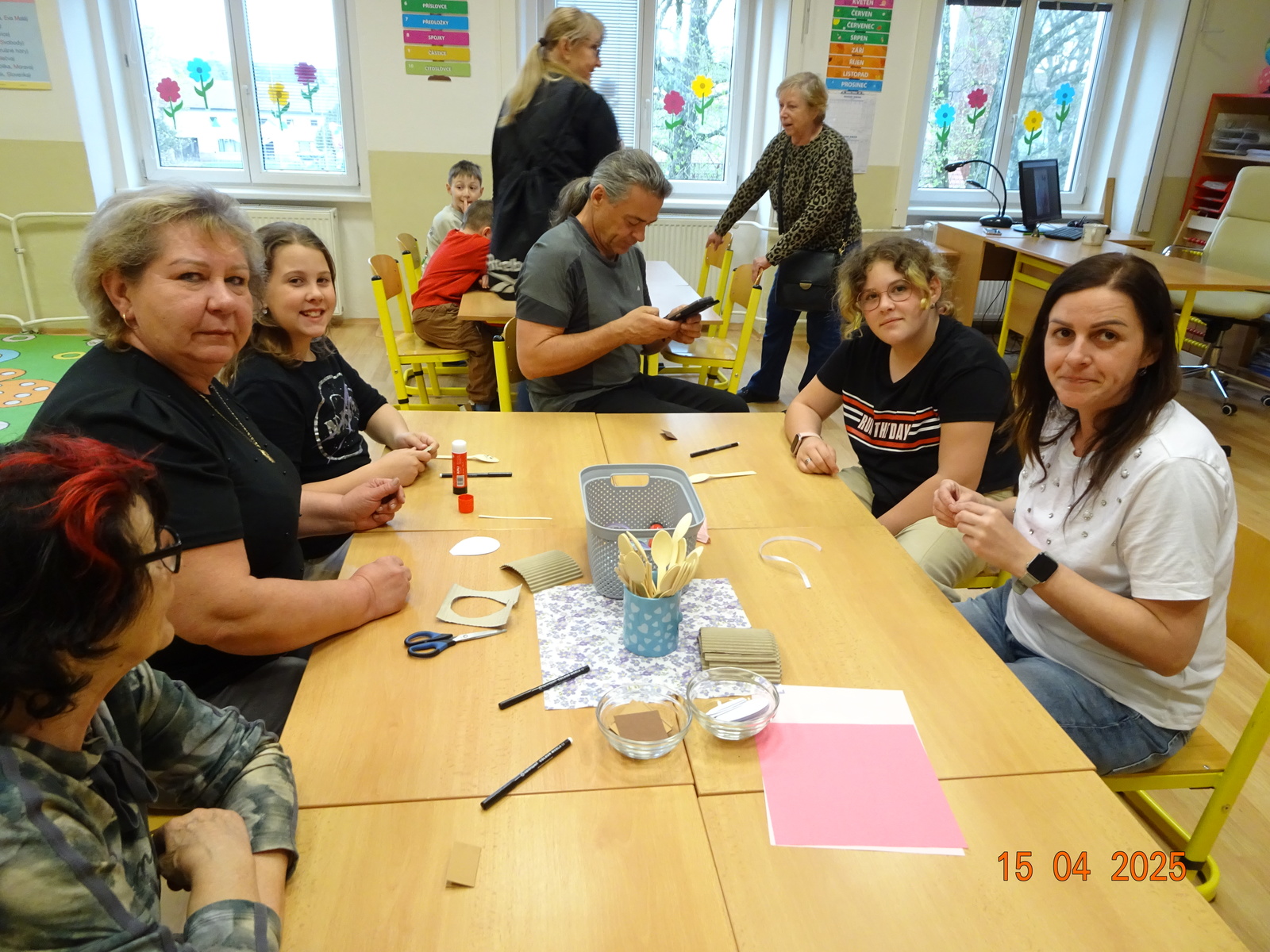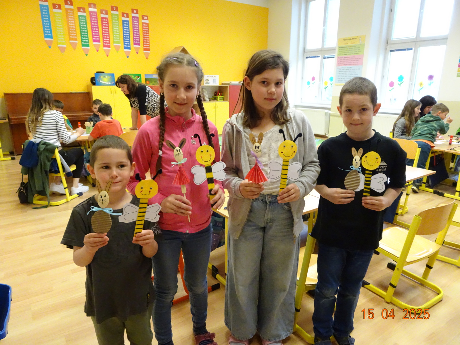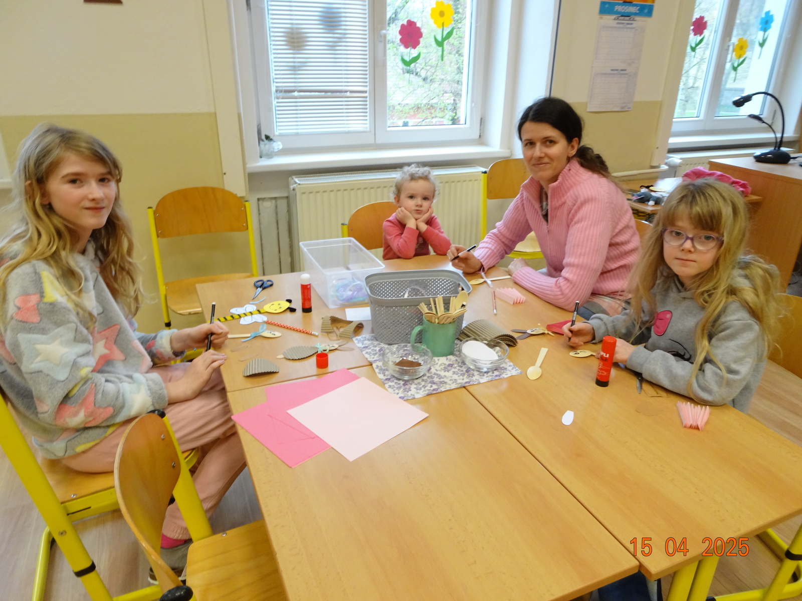15. dubna 2025 se na naší škole konala jarní předvelikonoční výtvarná dílna pro děti a rodiče. Pozvání přijali rodiče, prarodiče a sourozenci. Na prvním stanovišti si vyrobily včelku a na druhém stanovišti zajíčky. Všichni měli radost ze svých výrobků.