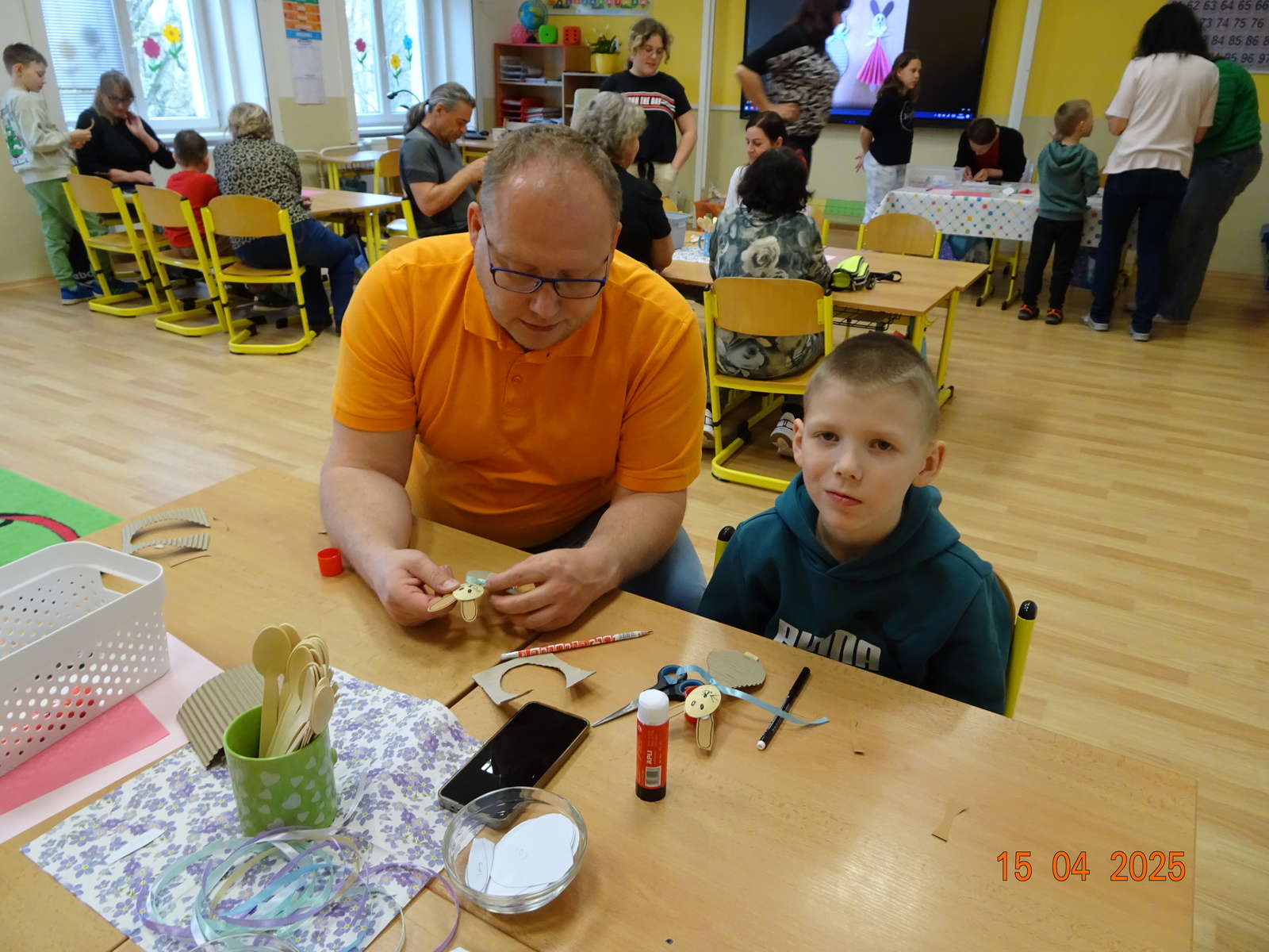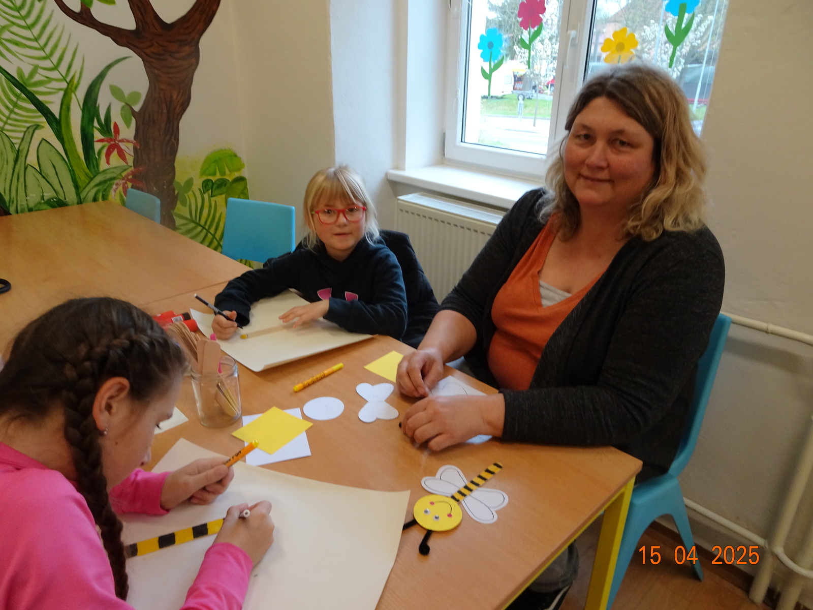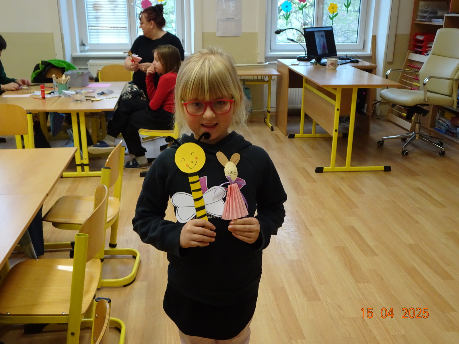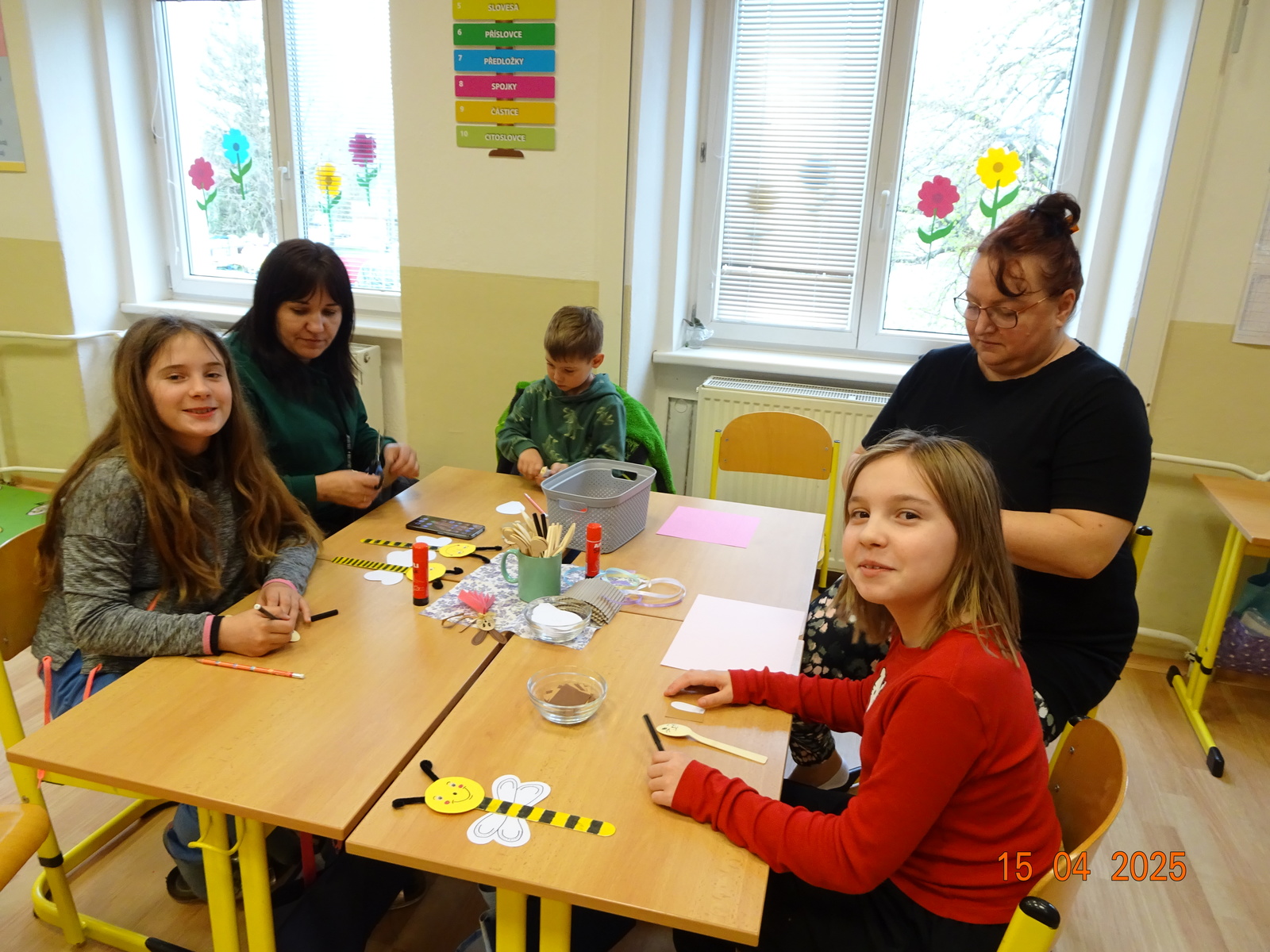 15. dubna 2025 se na naší škole konala jarní předvelikonoční výtvarná dílna pro děti a rodiče. Pozvání přijali rodiče, prarodiče a sourozenci. Na prvním stanovišti si vyrobily včelku a na druhém stanovišti zajíčky. Všichni měli radost ze svých výrobků.